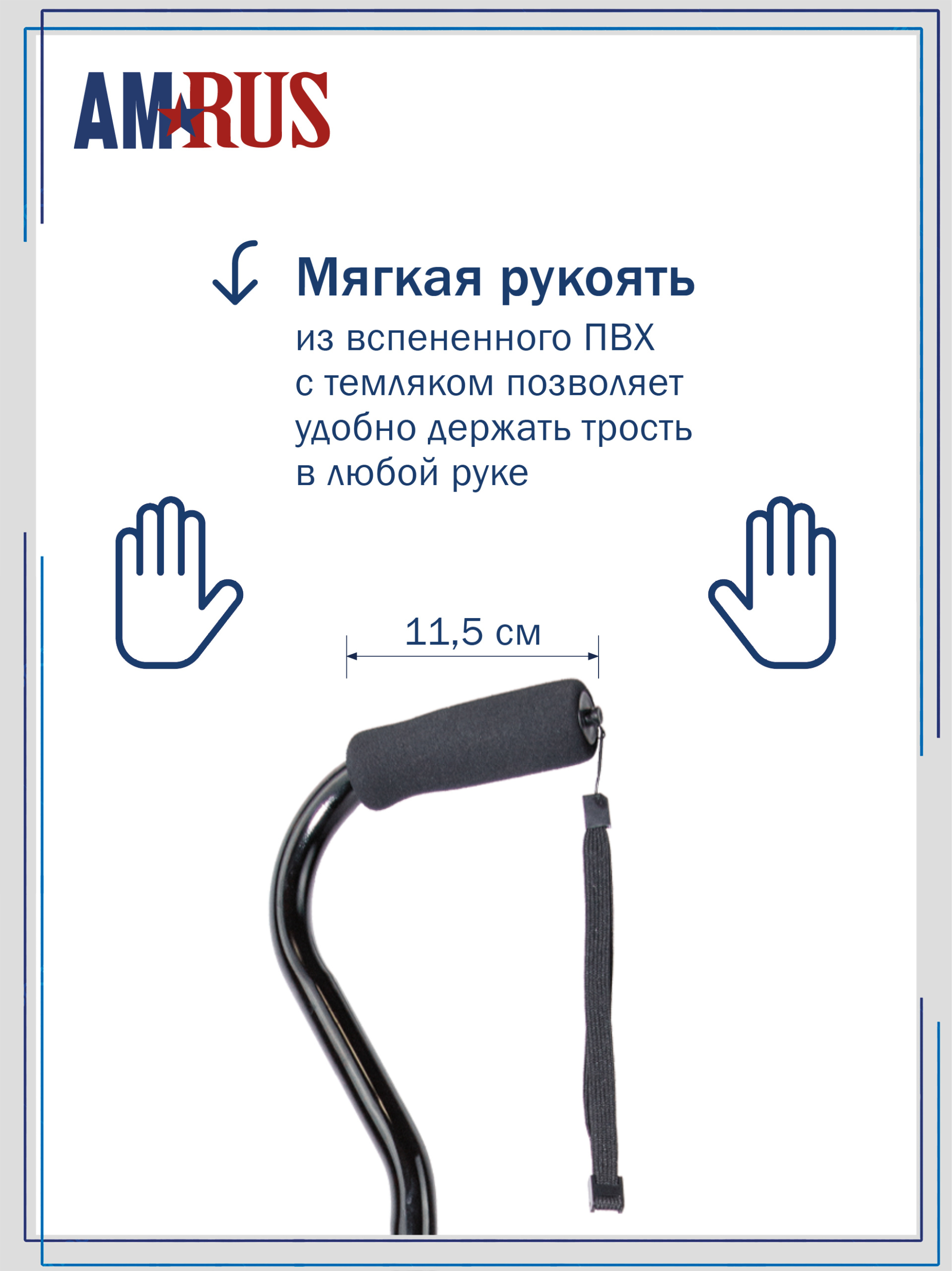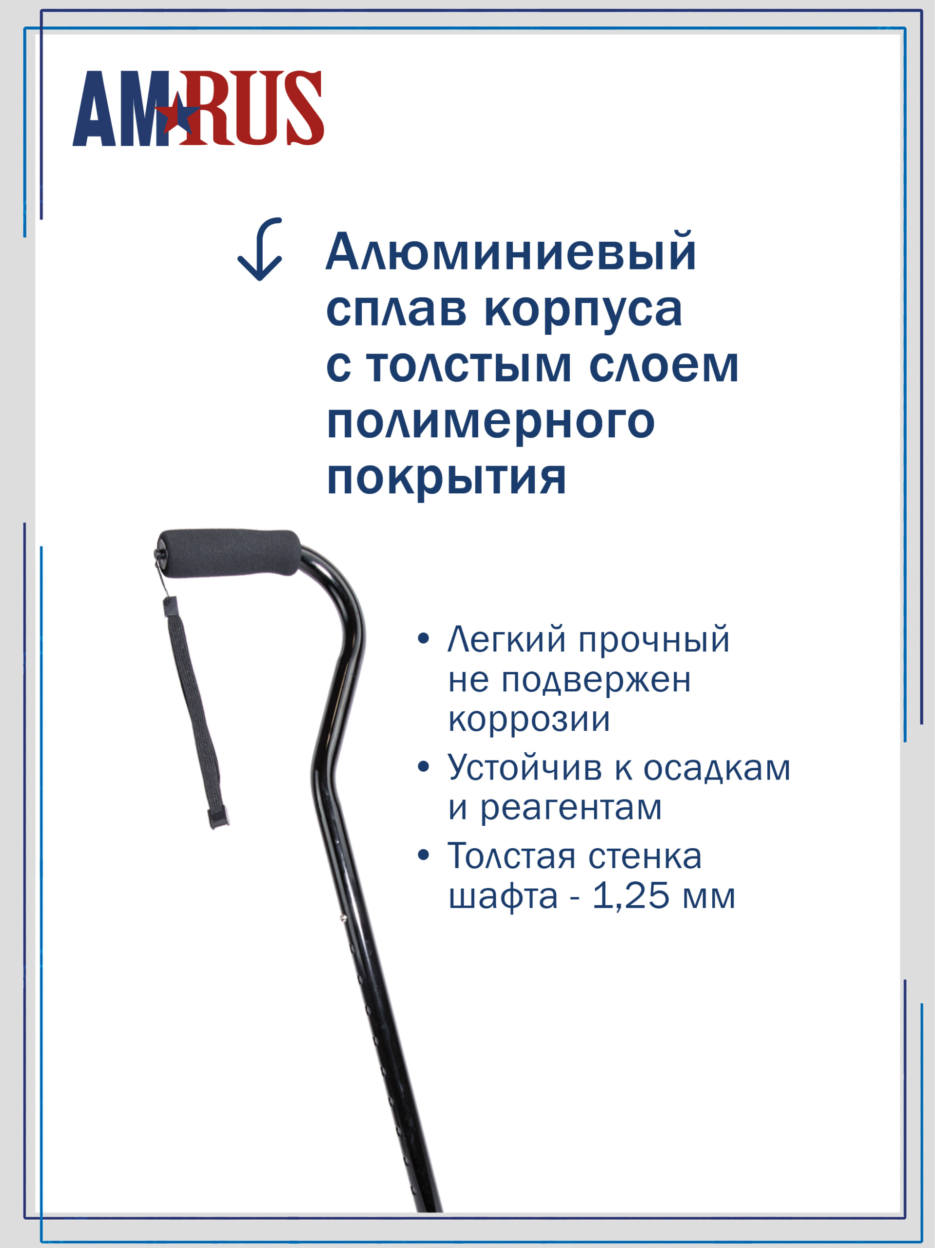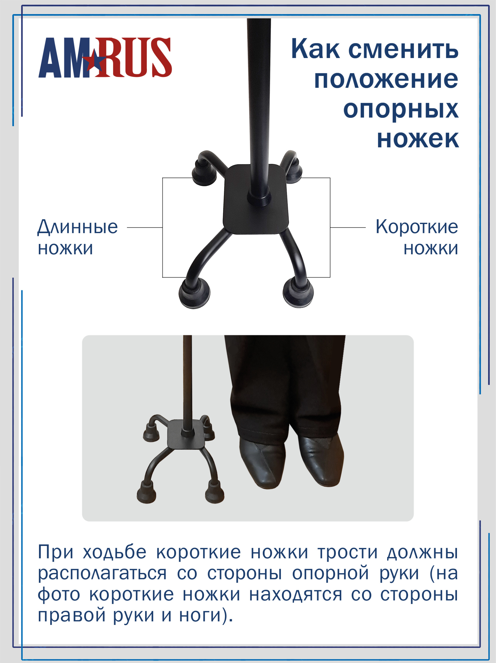 Трость обладает повышенной устойчивостью. Большая площадь опоры с четырьмя ножками помогает человеку с нарушениями координации движения ходить и стоять, опираясь на нее. Секция ножек — асимметричная, поворачивается для использования под правую или левую руку. Рукоять с обмягчением и темляком (ремешок на кисть) помогут удержать трость при артрозах рук.
