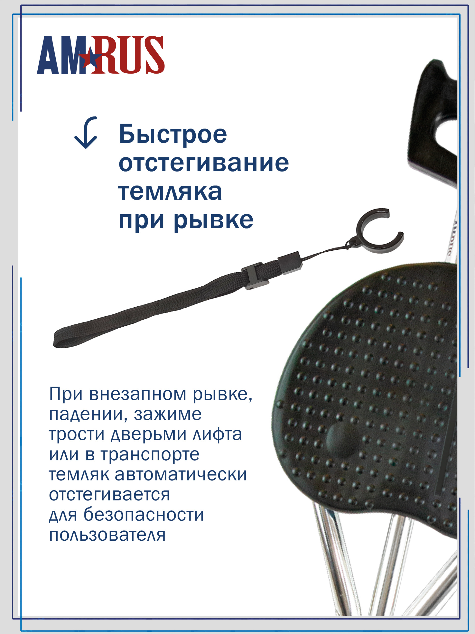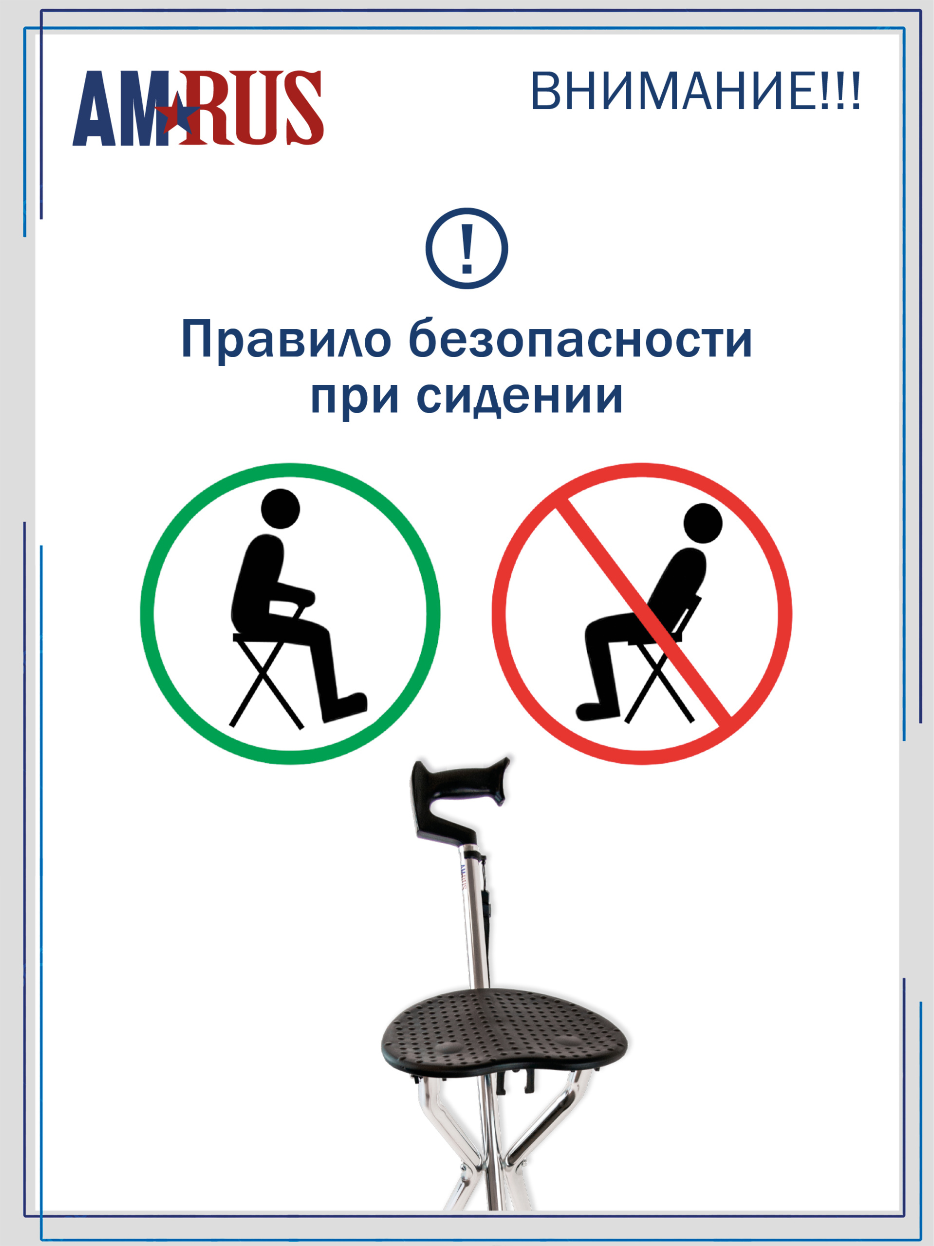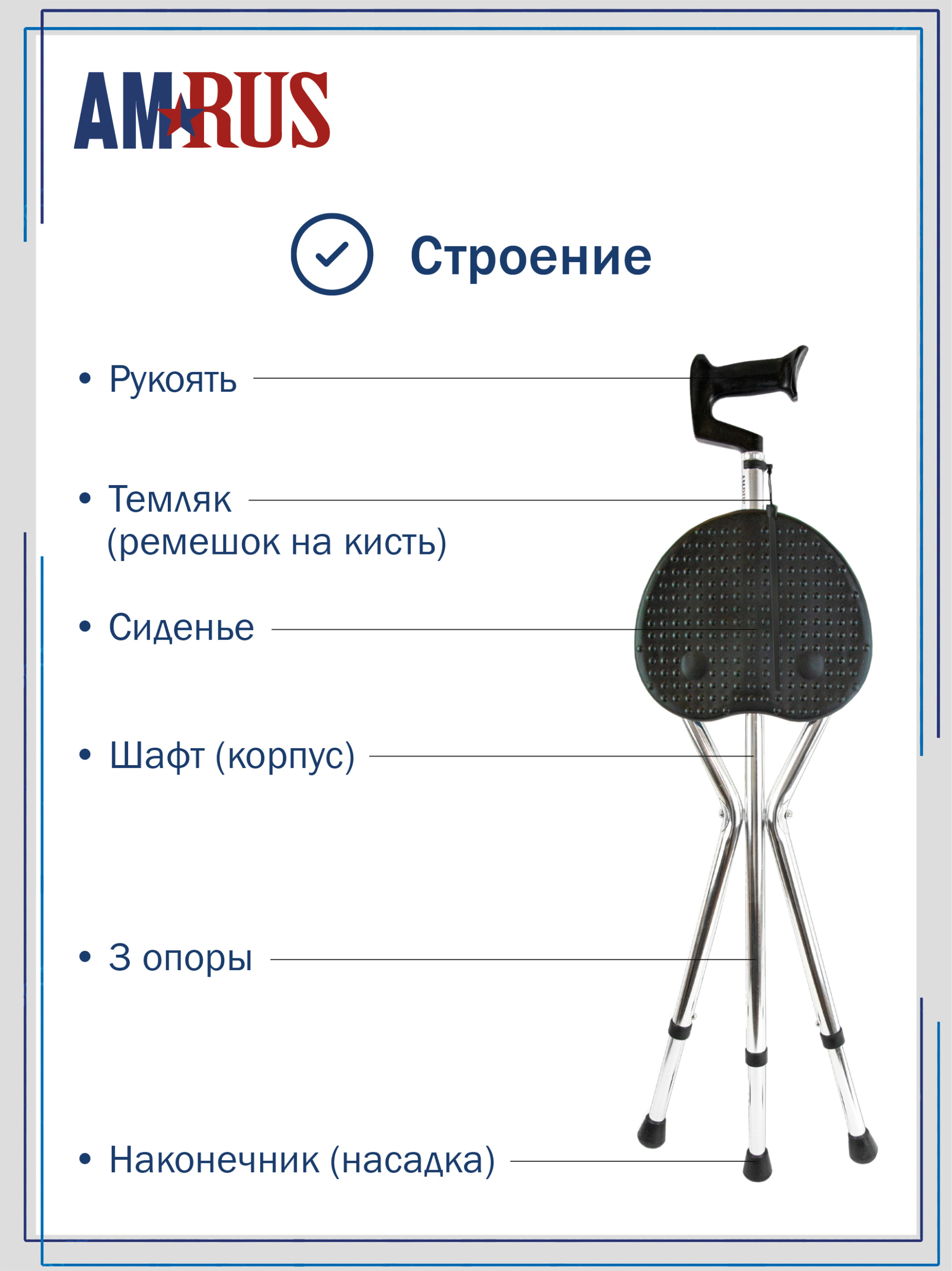 Комбинированная телескопическая трость-стул позволяет чередовать ходьбу с отдыхом. Трость снабжена пластиковой нескользящей рукоятью с ограничителями для кисти и темляком (ремешком на кисть). Сиденье фиксируется на 3-х опорах. На поверхности сиденья есть противоскользящие выступы. Высота трости и сиденья регулируется кнопочными фиксаторами, расположенными на ножках с шагом 2,5 см. Насадки на ножках выполнены из резины высокой прочности и износостойкости, несъемные полукруглой формы для повышения опороспособности и устойчивости на неровных поверхностях.