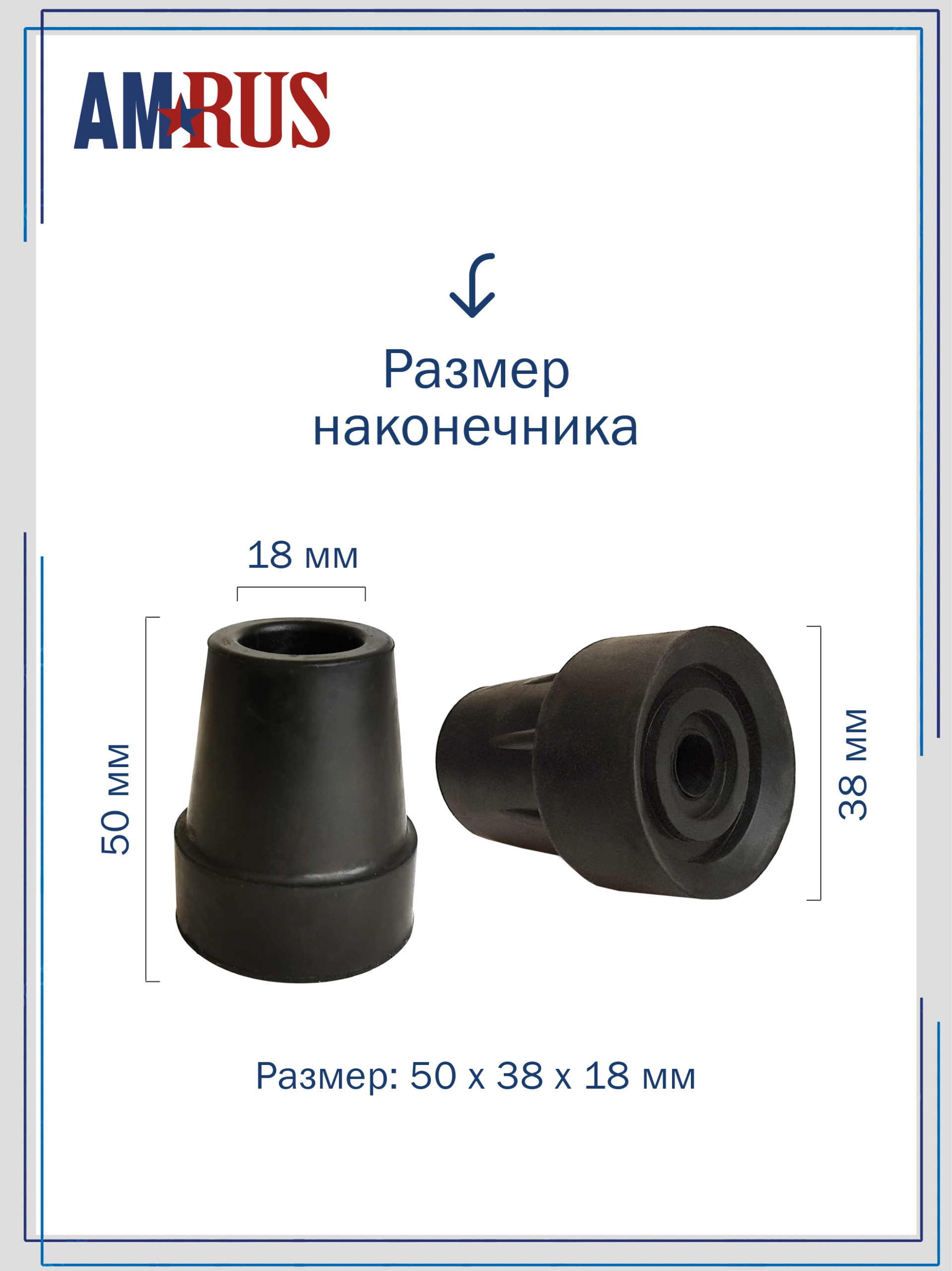 Размер наконечника: высота -50 мм, диаметр внешний («подошвы») — 38 мм, диаметр внутренний (для шафта трости) — 18 мм.