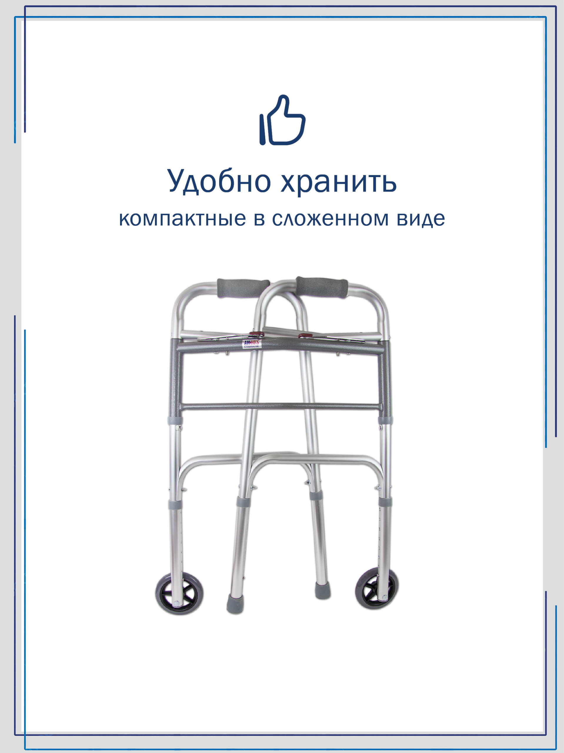 Модель выполнена из алюминиевого сплава и снабжена большими колёсами на двух передних ножках, которые позволяют передвигаться на ходунках, не поднимая их полностью. Мягкие рукоятки из вспененного материала не натирают ладони. Ходунки предназначены для молодых людей и людей среднего возраста после травм и операций, обеспечивая возможность быстрого и удобного передвижения.