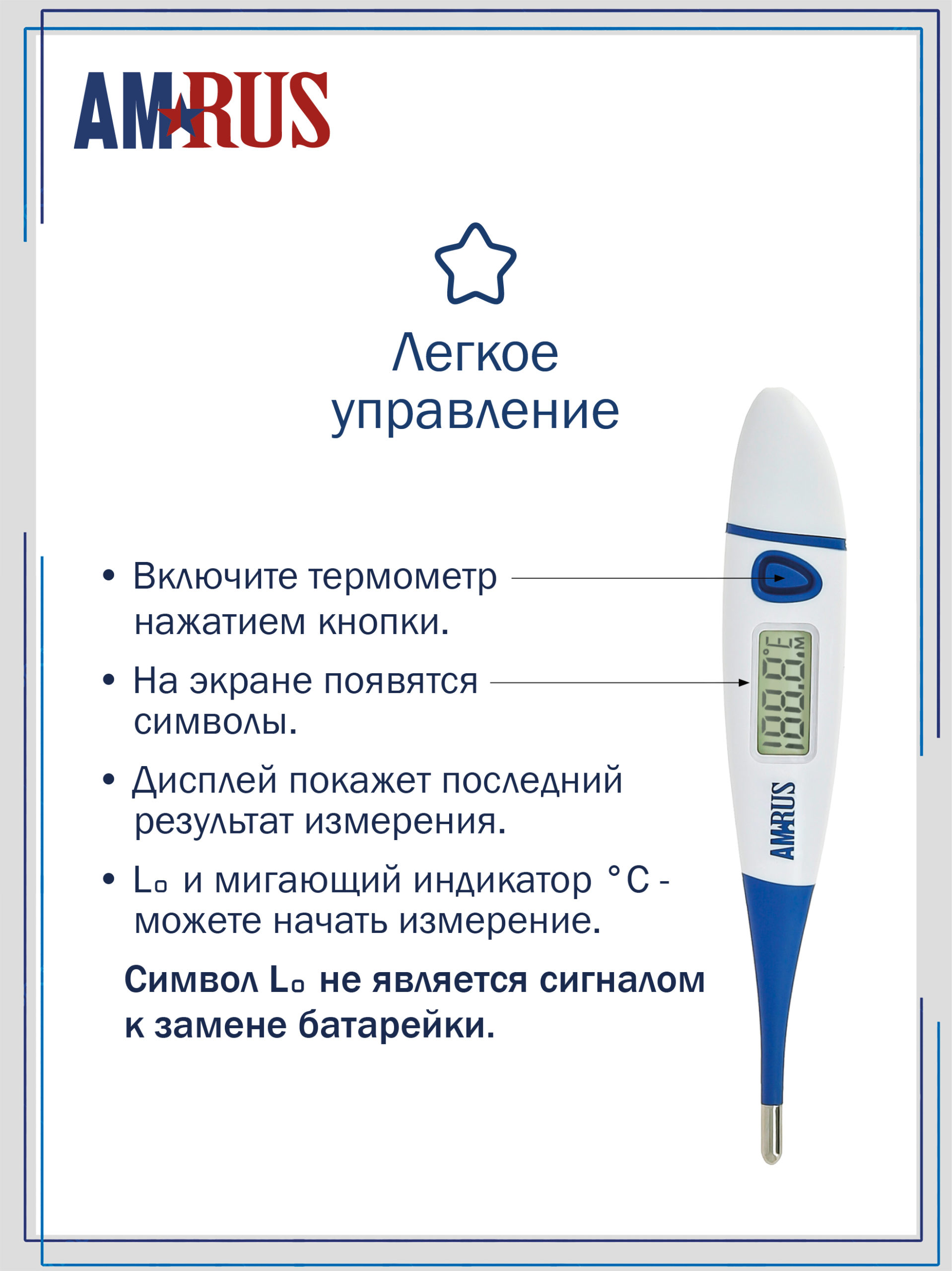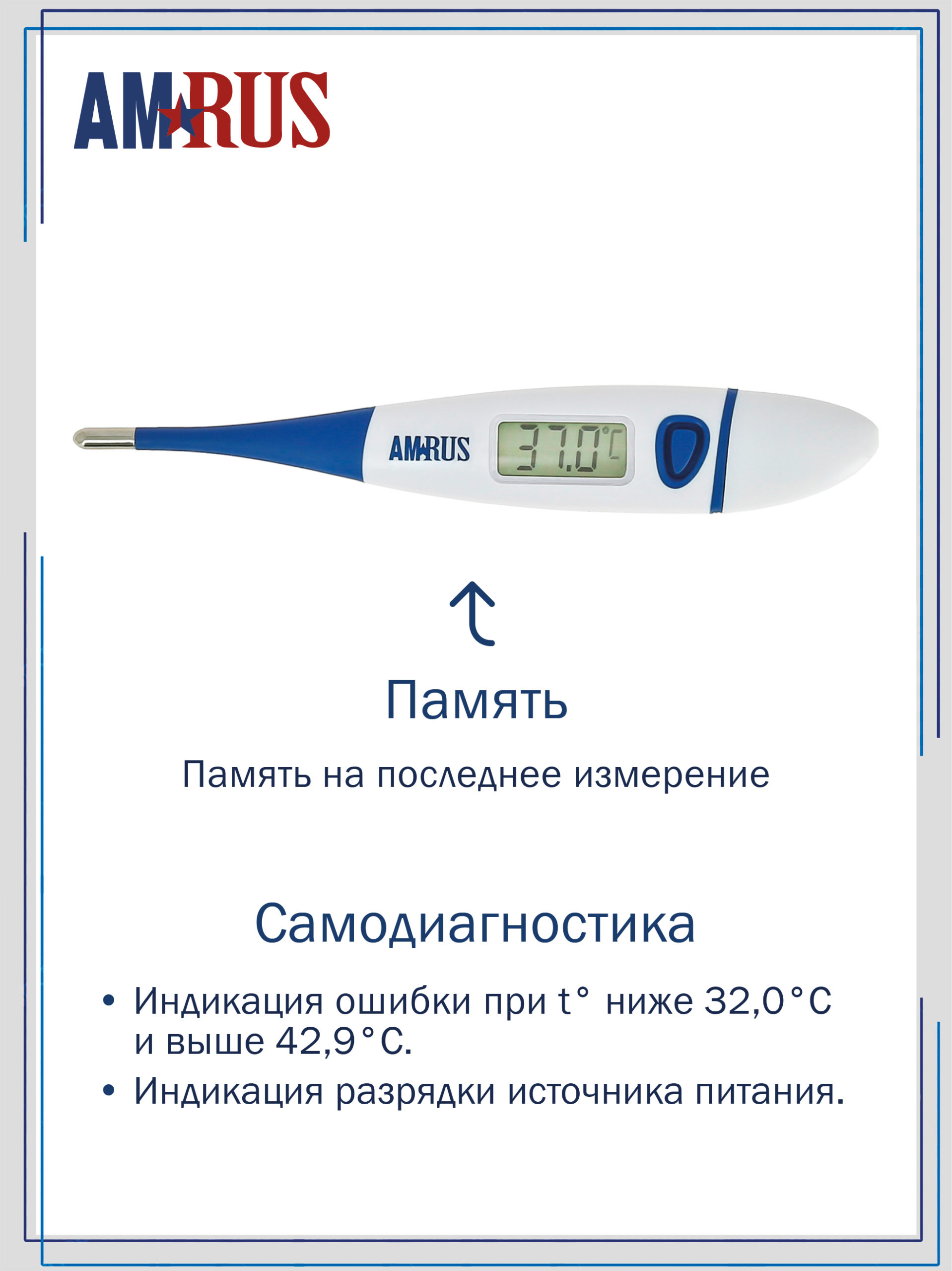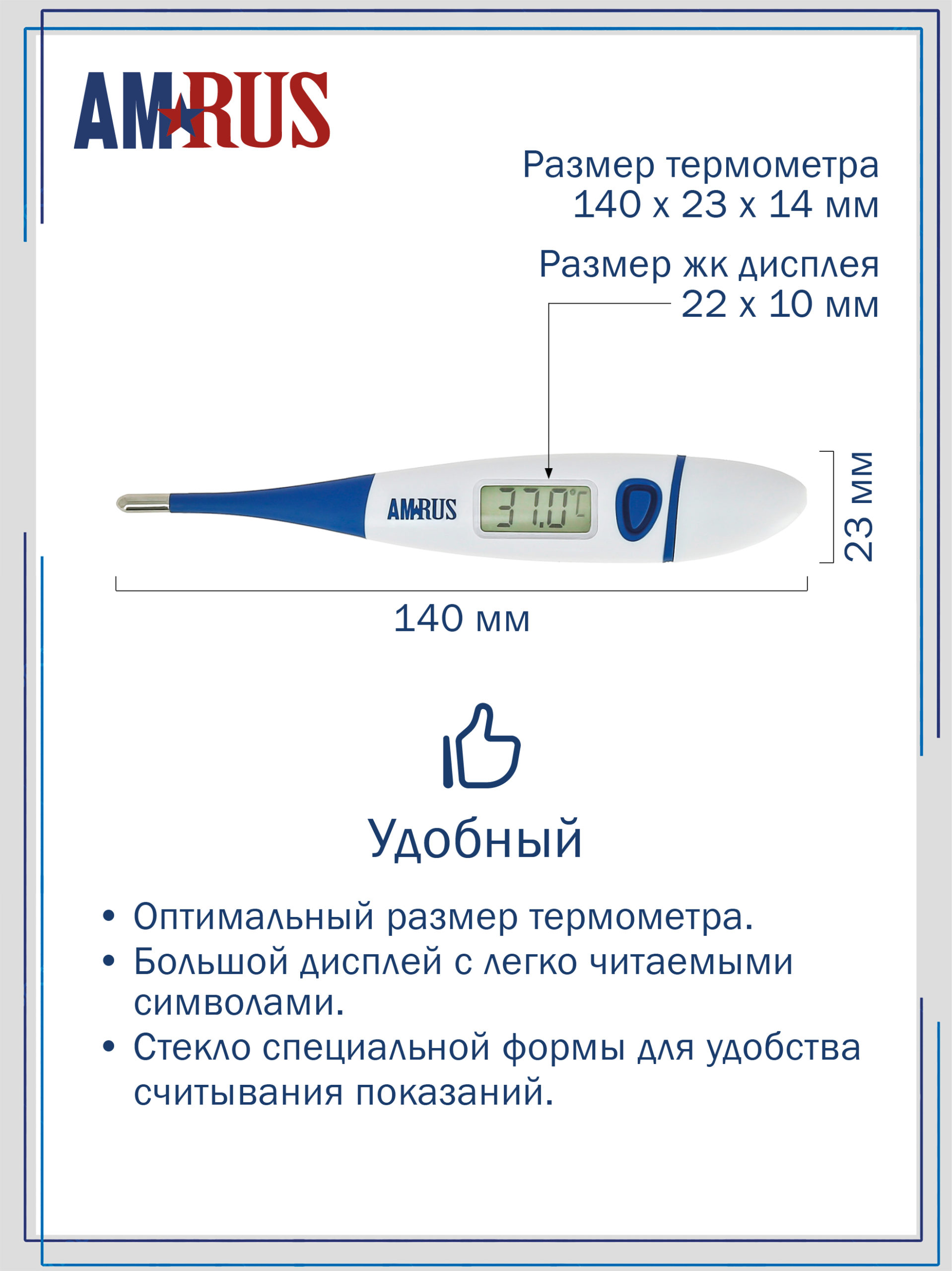 Термометр медицинский цифровой AMDT11 оснащен большим дисплеем с крупными легко читаемыми символами и стеклом специальной формы для удобства считывания показаний.