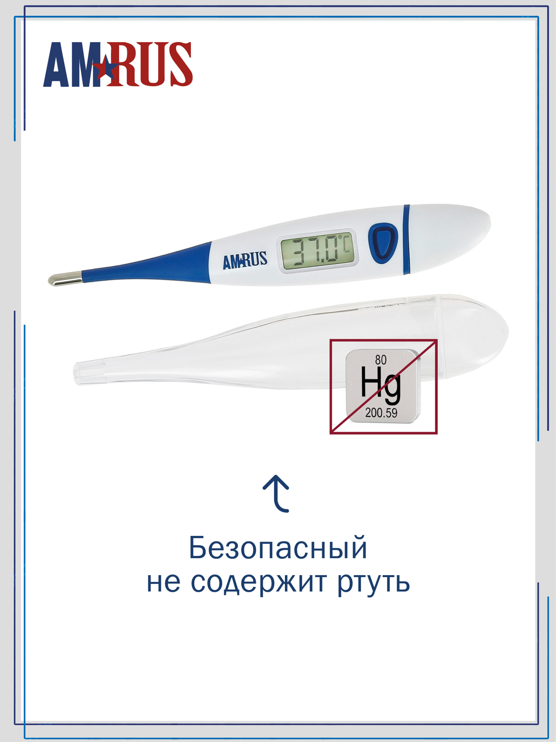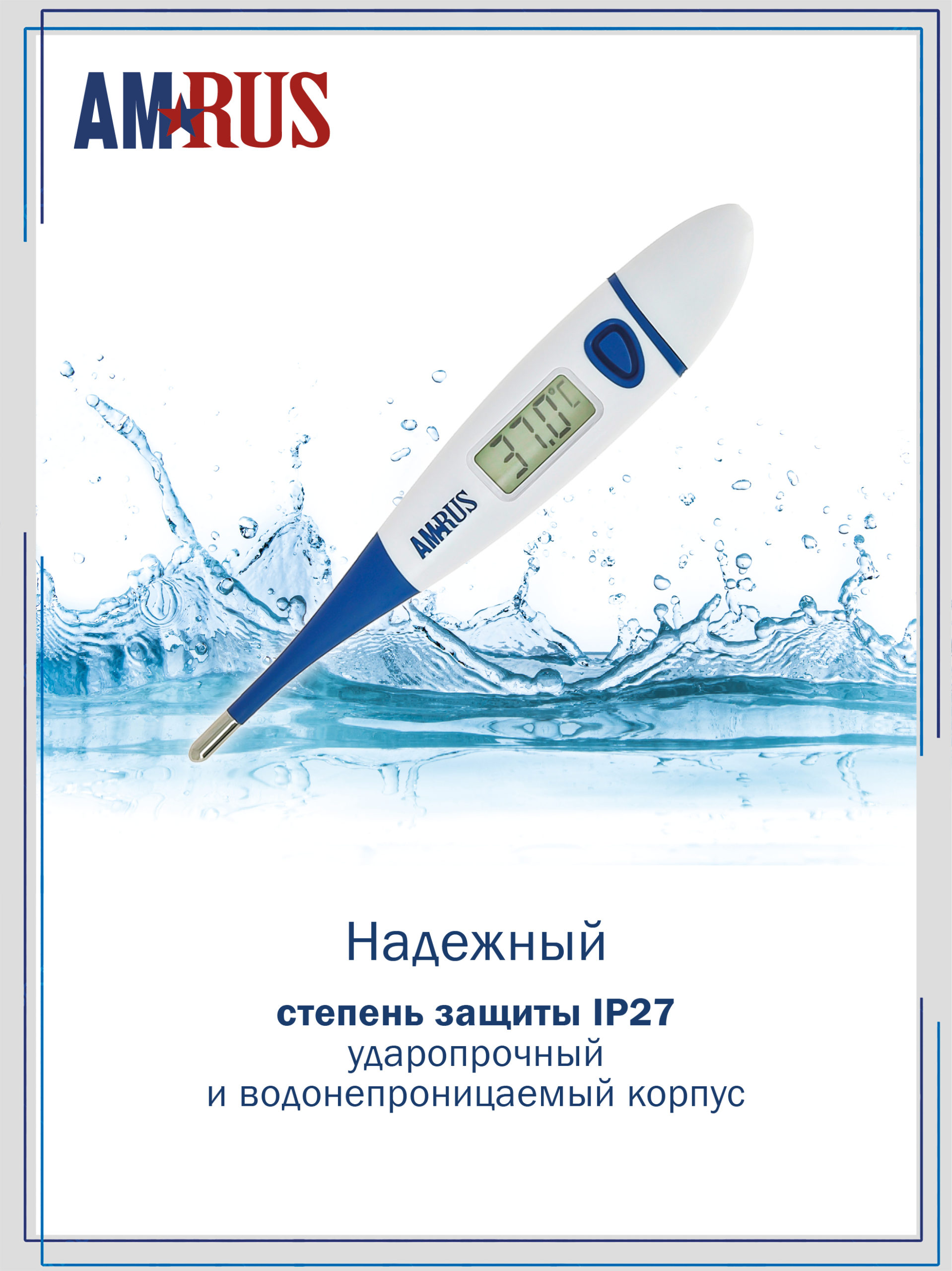 Корпус имеет степень защиты IP 27 — ударопрочный водонепроницаемый. Термометр характеризуется высоким быстродействием и точностью. Кнопка включения/выключения — прорезиненная. Наконечник гибкий.