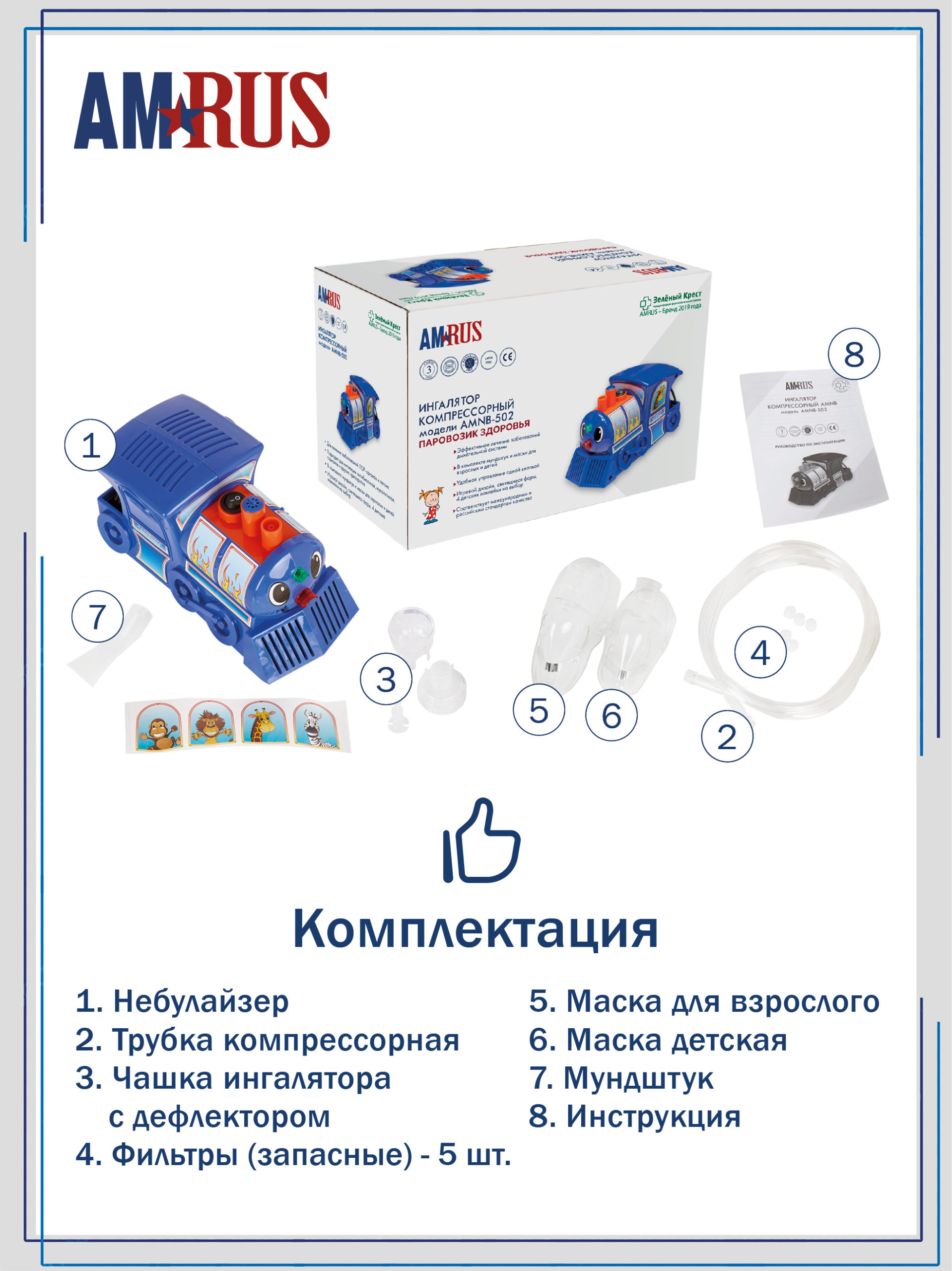 входят: детская маска, маска для взрослых, мундштук, компрессорная (воздуховодная)
