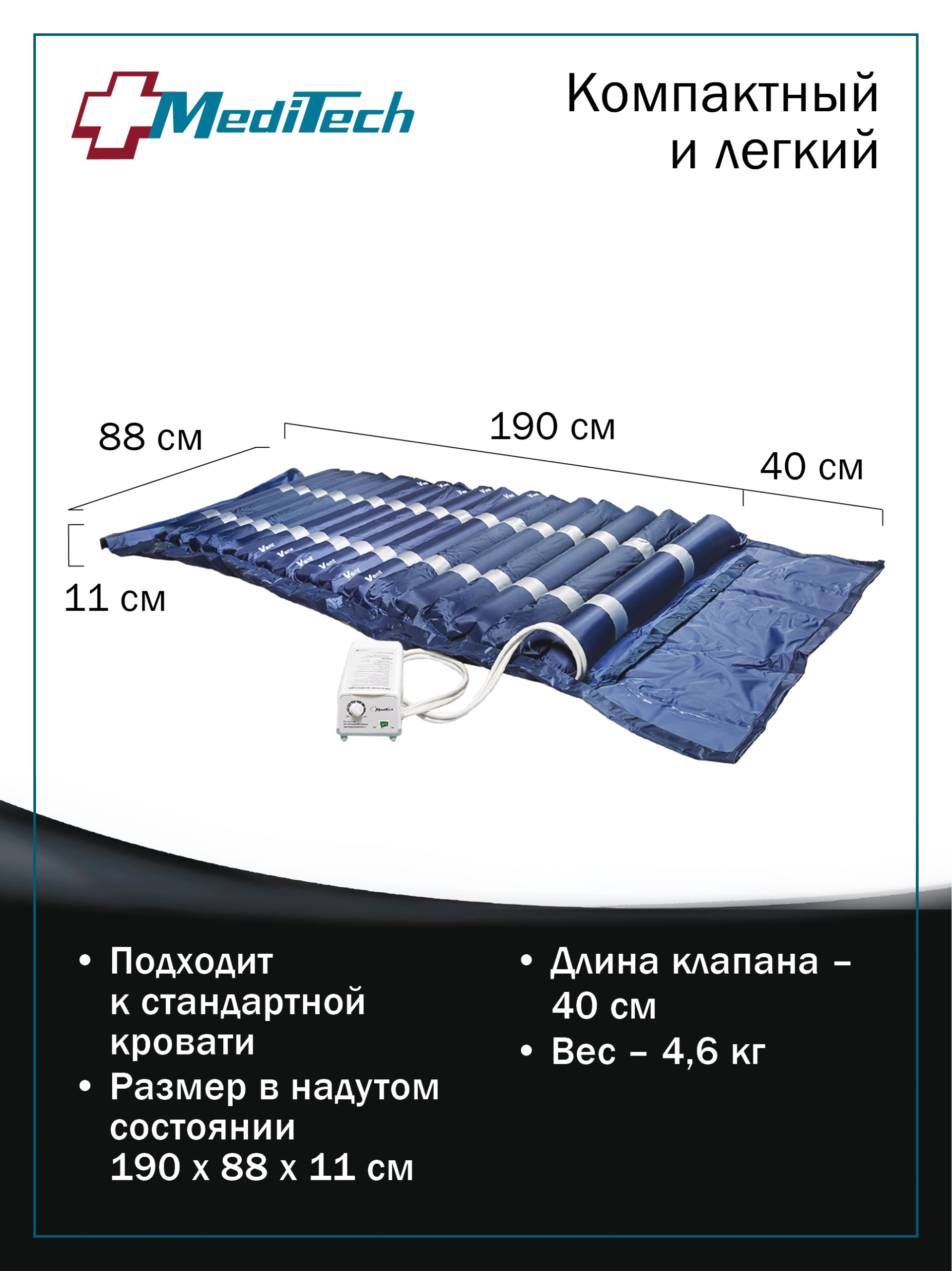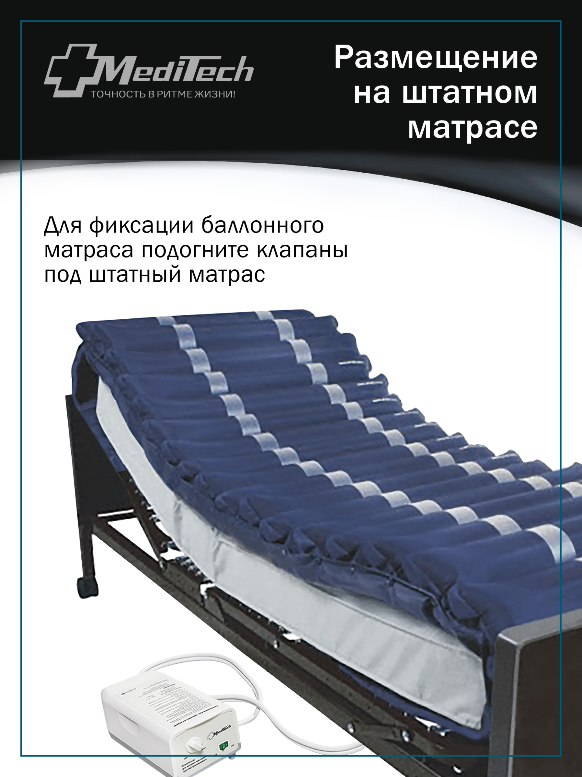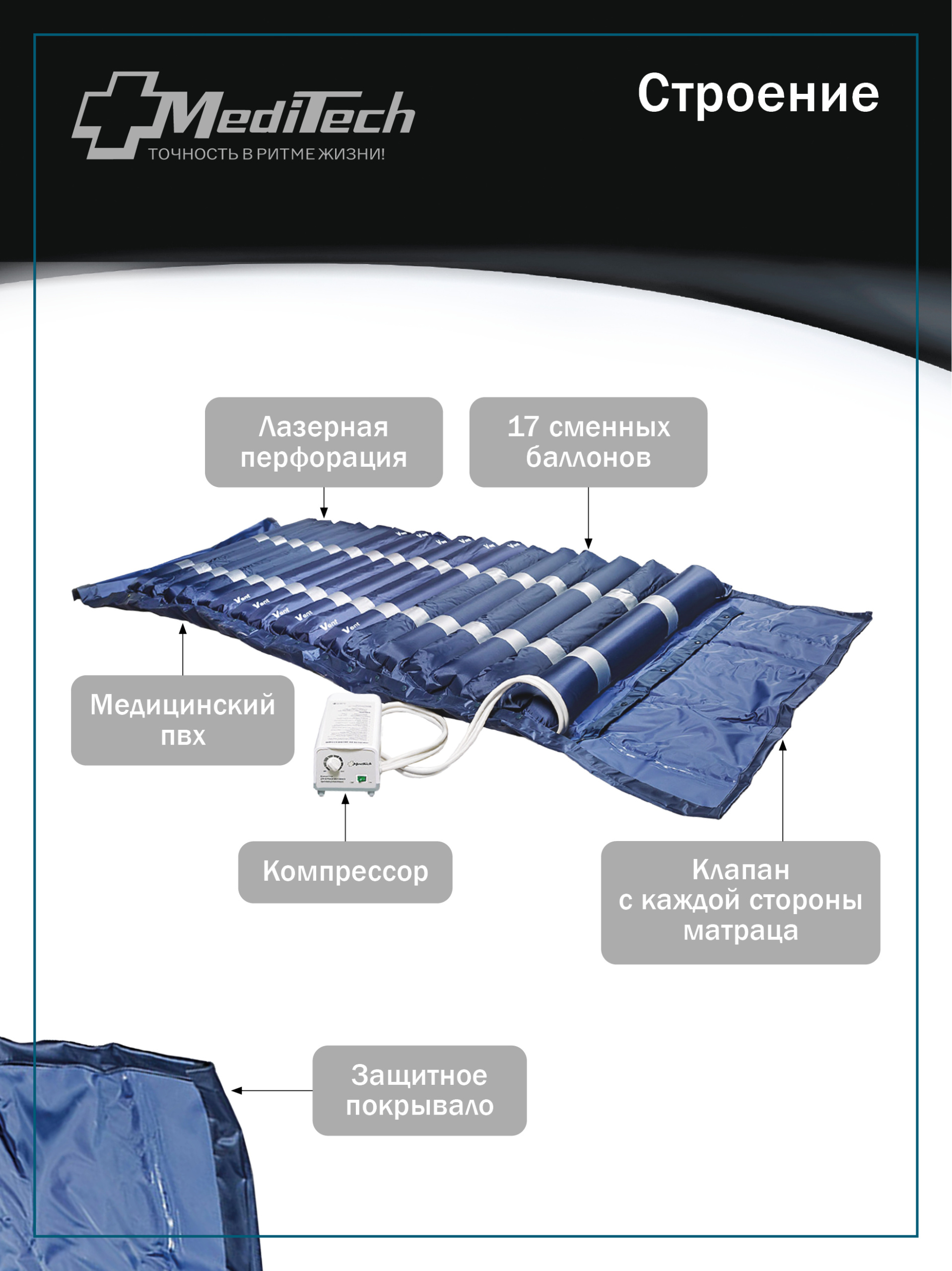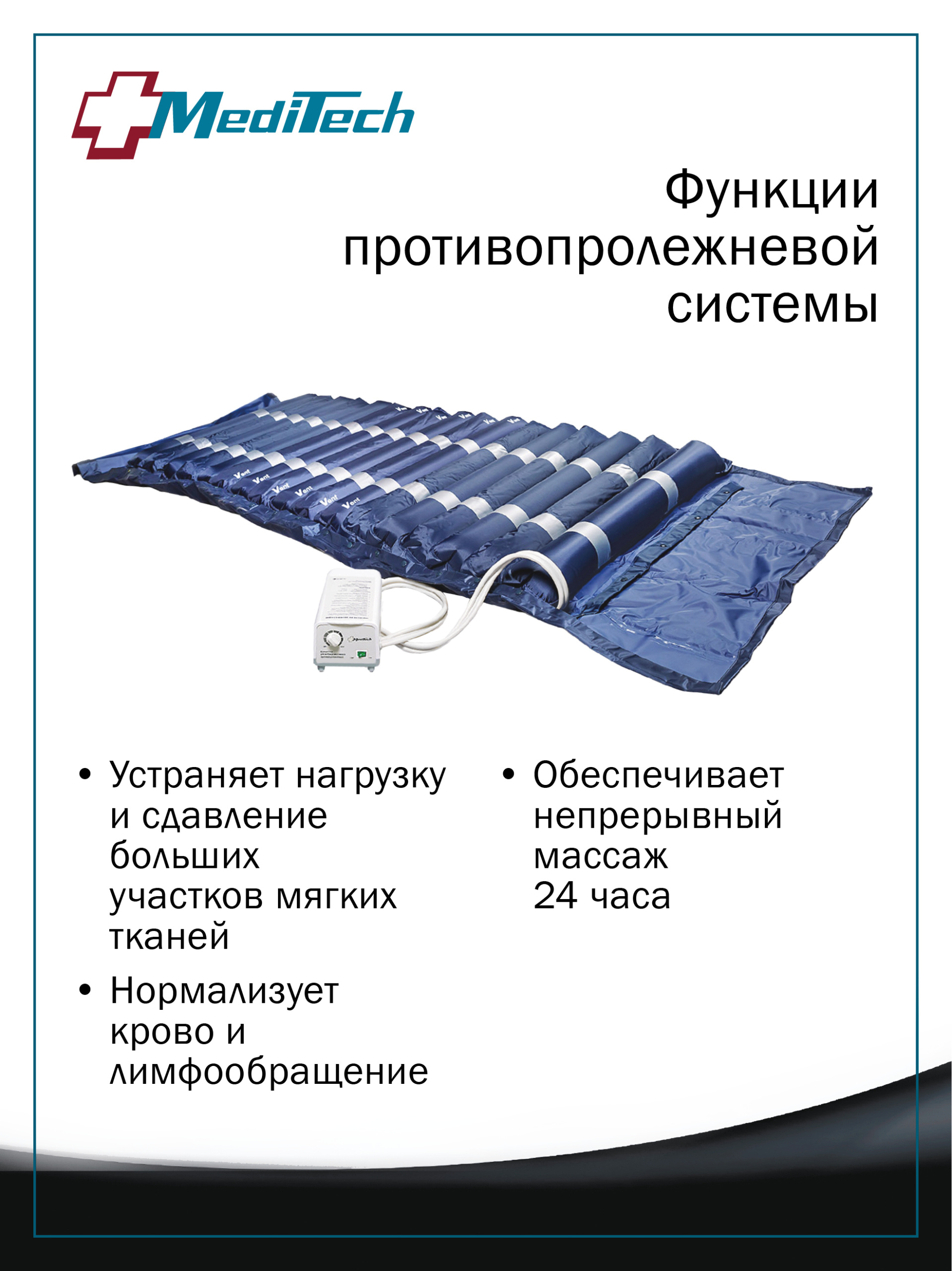 Матрас представляет собой высококачественную массажную систему, включающую в себя матрас, состоящий из 17 баллонов, разделенных на две группы и автоматический компрессор с регулятором давления, обеспечивающий циклическое нагнетание воздуха в каждую из групп баллонов. Изделие обеспечивает не только снижение давления на ткани тела пациента, но и массажный эффект и профилактику возникновения пролежней за счет циклического изменения давления на различные участки тела.