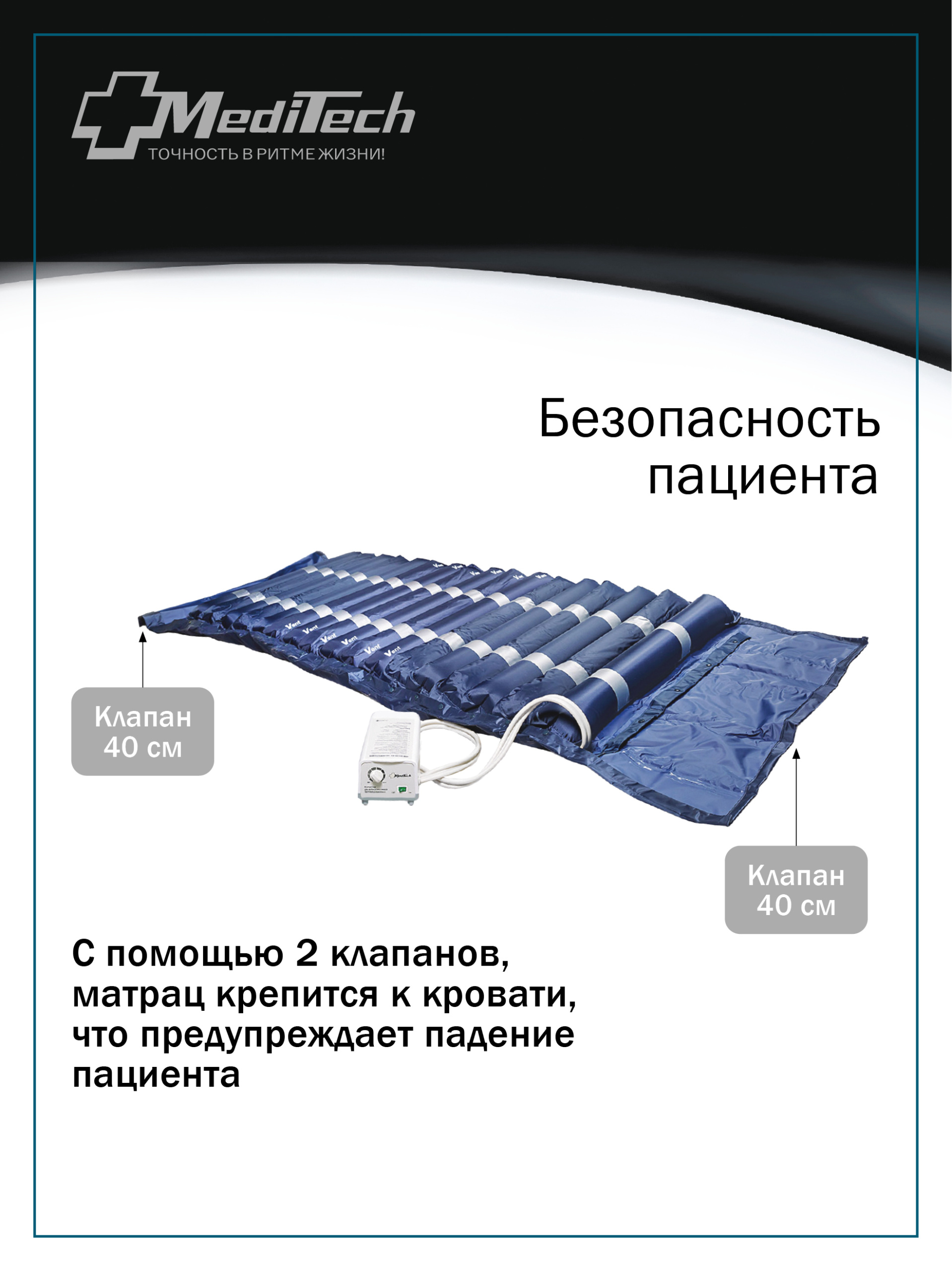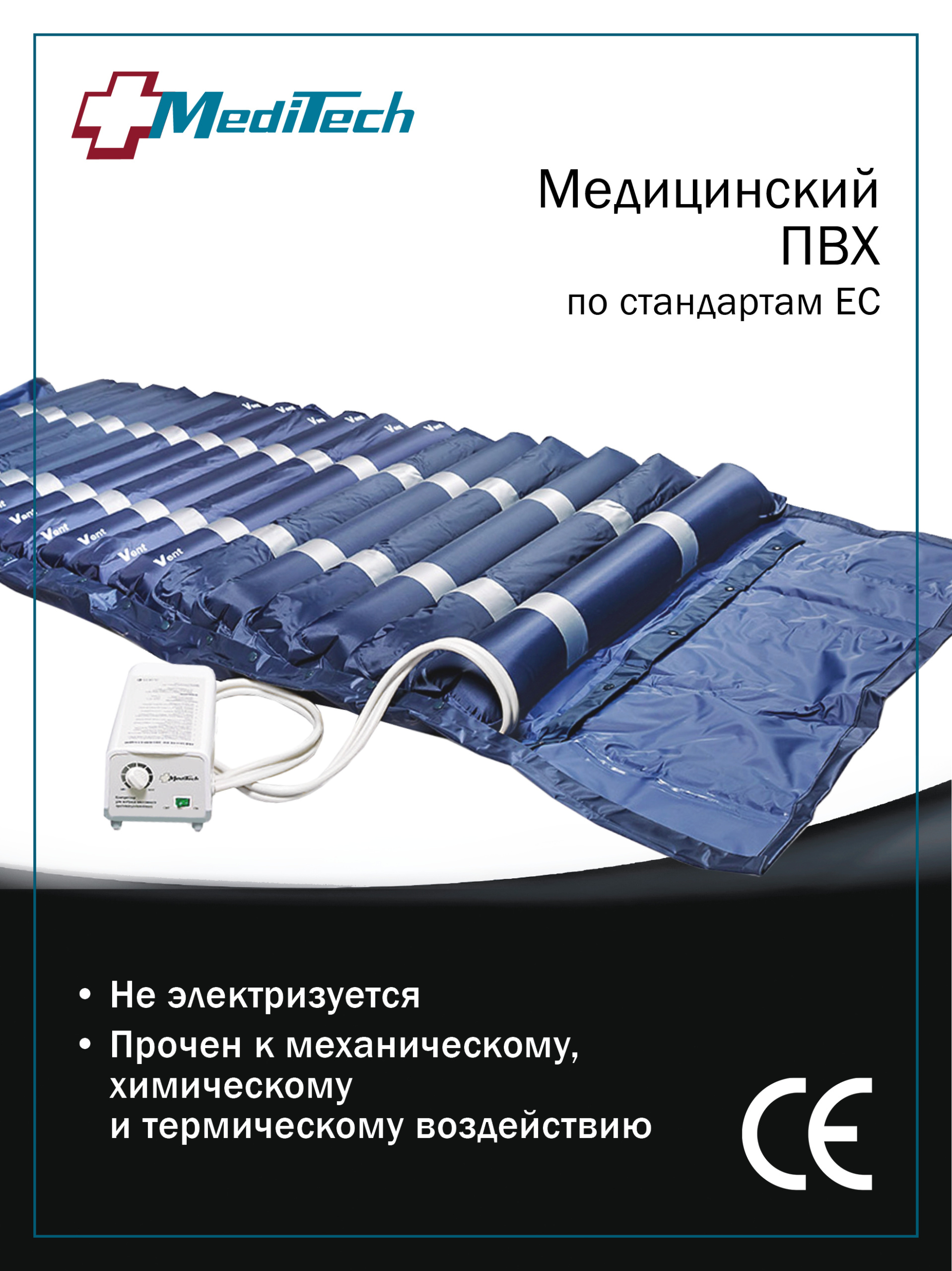 Матрас выполнен из армированного Полиамида/Полиуретана в соответствии со стандартами ЕС и обладает эффектом электростатического рассеивания, т.е. не электризуется, что комфортно для пациента, а также особо прочен к механическому, химическому и термическому воздействию, что обеспечивает более длительное использование. Матрас имеет 2 клапана по 40 см с каждой стороны для фиксации матраца на кровати, что предупреждает падение матраца с пациентом.