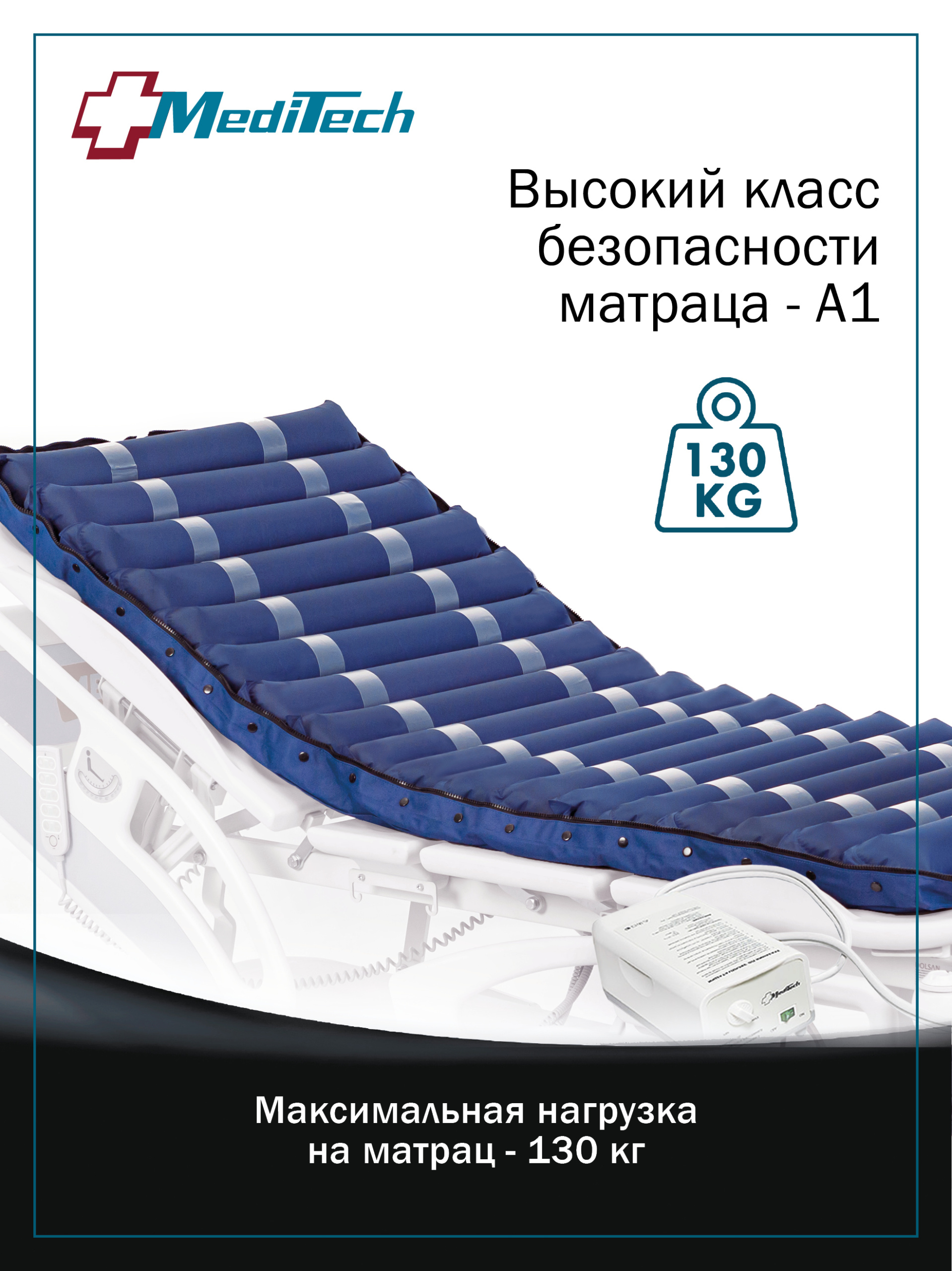 Класс безопасности матраса – I, т.е. самый надежный (чем больше класс безопасности, тем больше опасности представляет собой изделие в случае повреждения). Максимальная нагрузка на матрас – 130 кг, те. подходит для корпулентных пациентов.