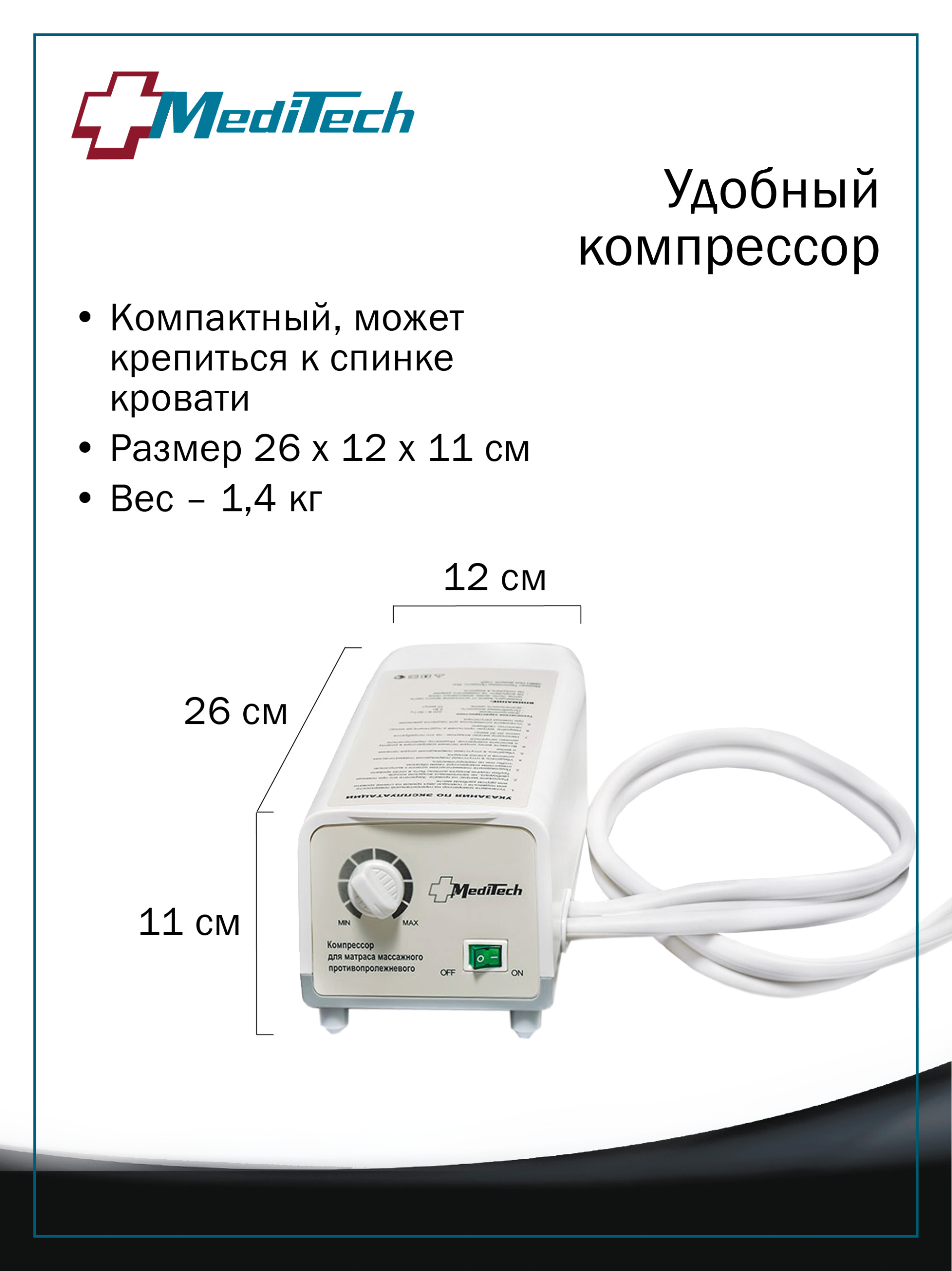 Компрессор обеспечивает круглосуточный режим работы матрасу, в результате массаж мягких тканей осуществляется постоянно, что препятствует застойным явлениям. Тип предохранителя – А1, т.е. самый надежный. Высокий класс предохранителя более безопасен для пациента в случае повреждения. Технология 3D полировки частей компрессора гарантирует точное соединение частей компрессора и бесшумную работу. Уровень шума 35 дБ – соответствует звуку приглушенного разговора (нормой шума приборов для жилых помещений является 40 дБ – соответствует уровню шума при обычной речи людей).