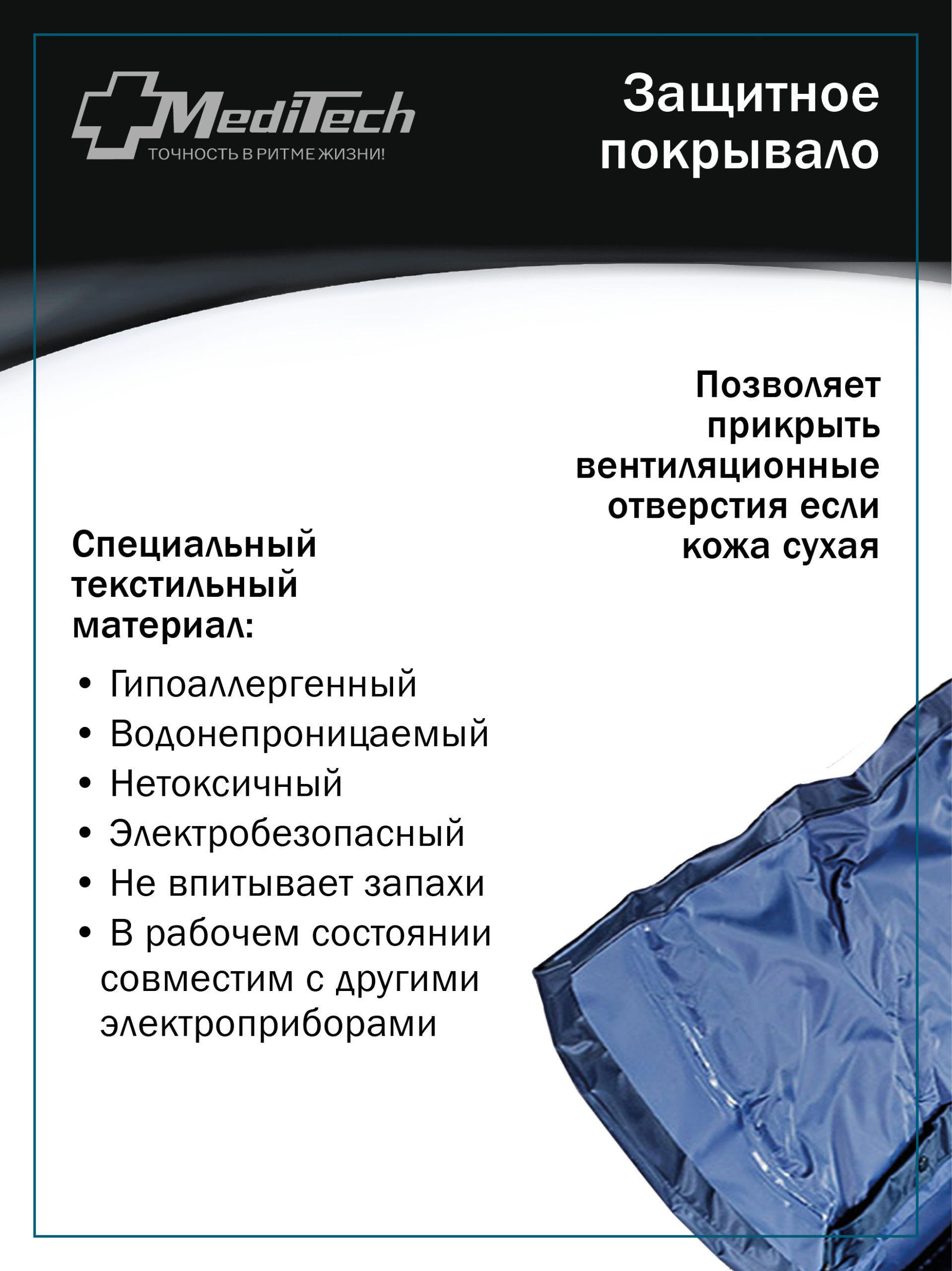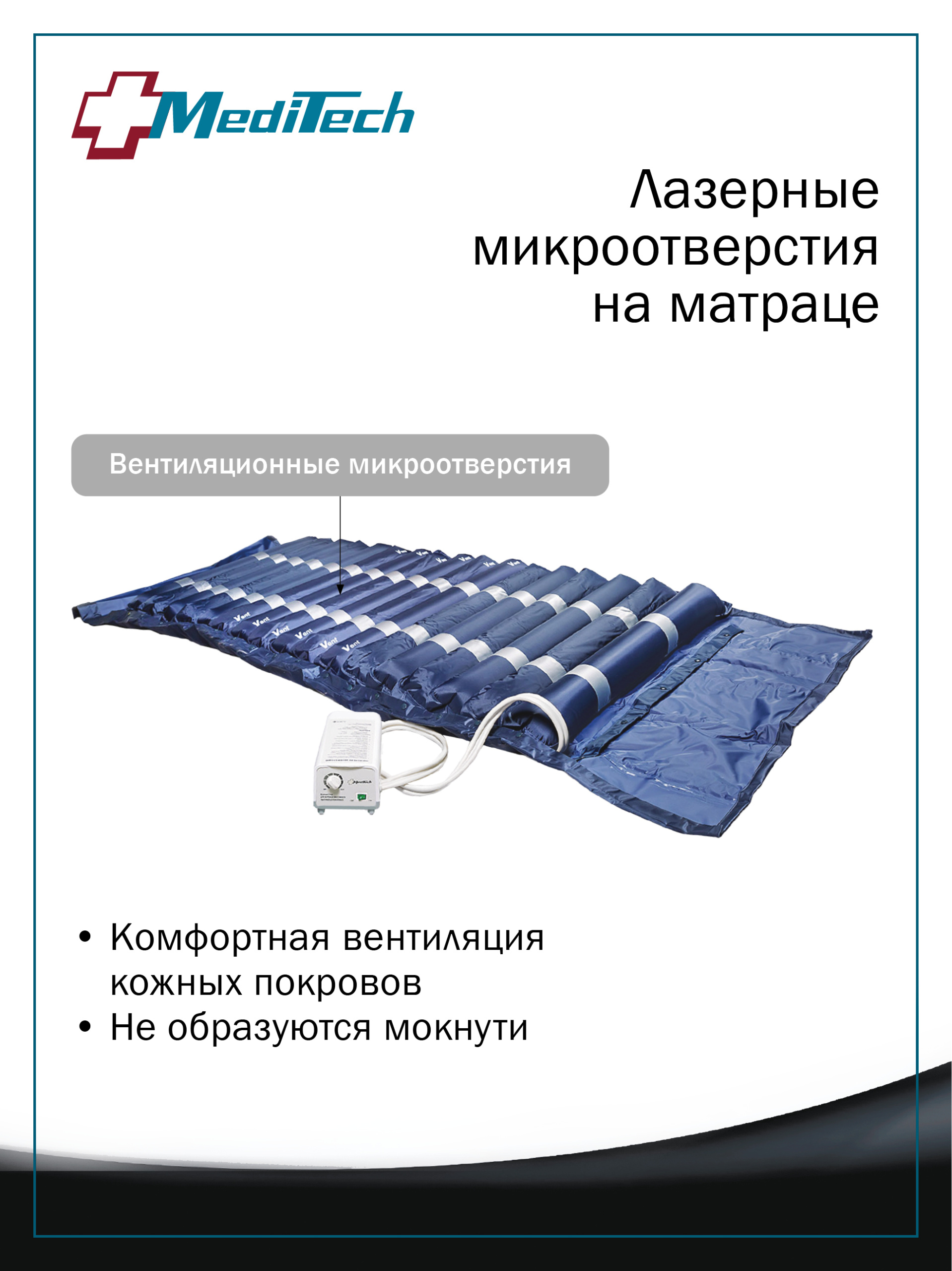 Матрас имеет вентиляционные лазерные микроотверстия, которые создают особый микроклимат, препятствующий возникновению и распространению инфекционных процессов, не образуются мокнути, что способствует уменьшению болей. При необходимости матрас можно накрыть покрывалом (в комплекте), который является гипоаллергенным, водонепроницаемым, нетоксичным и электробезопасным материалом. Покрывало не впитывает запахи, в рабочем состоянии совместим с другими электроприборами и позволяет прикрыть вентиляционные отверстия если кожа сухая, а также создает дополнительное удобство при гигиенических процедурах.