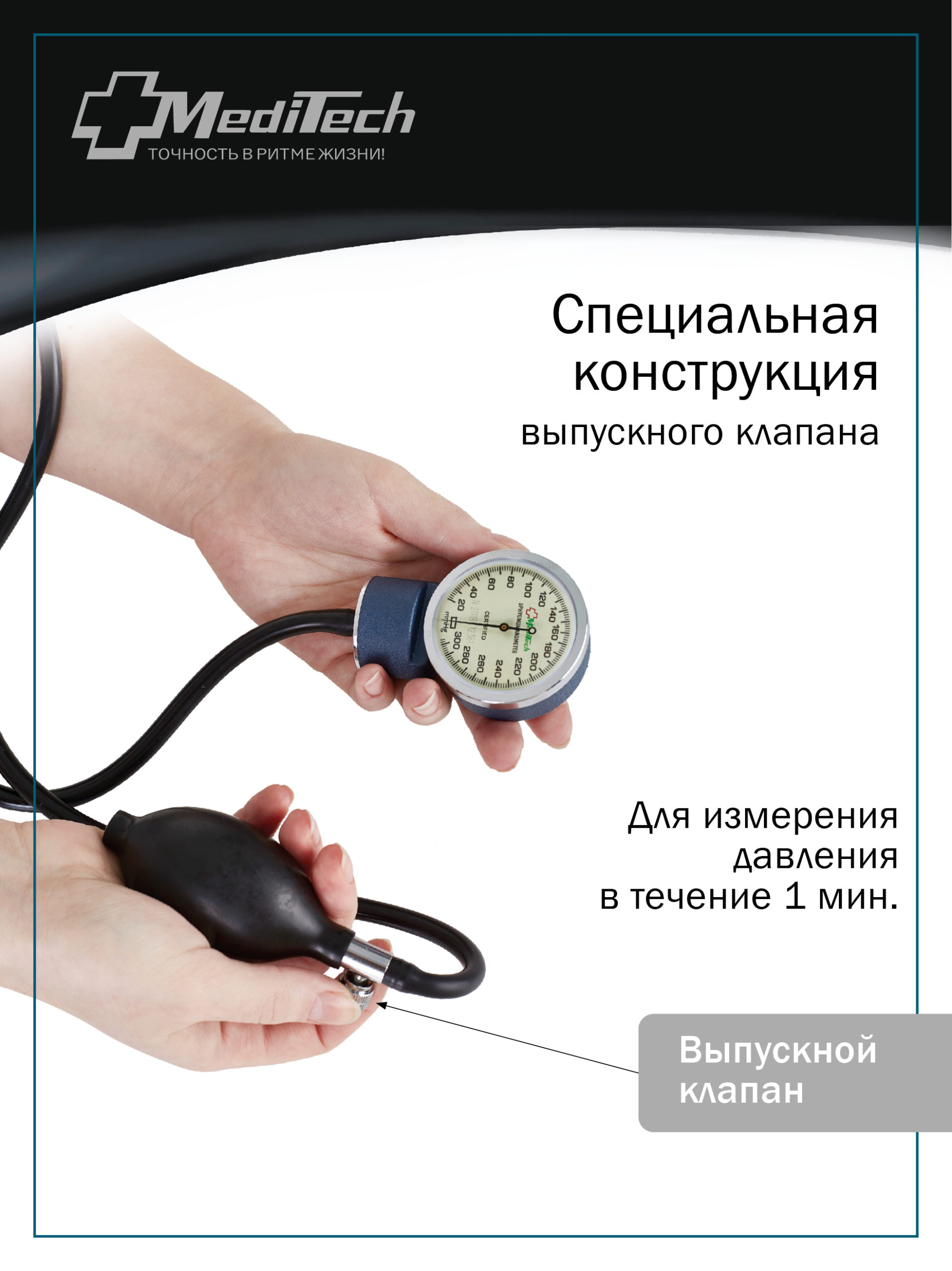— Специальная конструкция выпускного клапана позволяет измерять давление в течение 1 мин.,