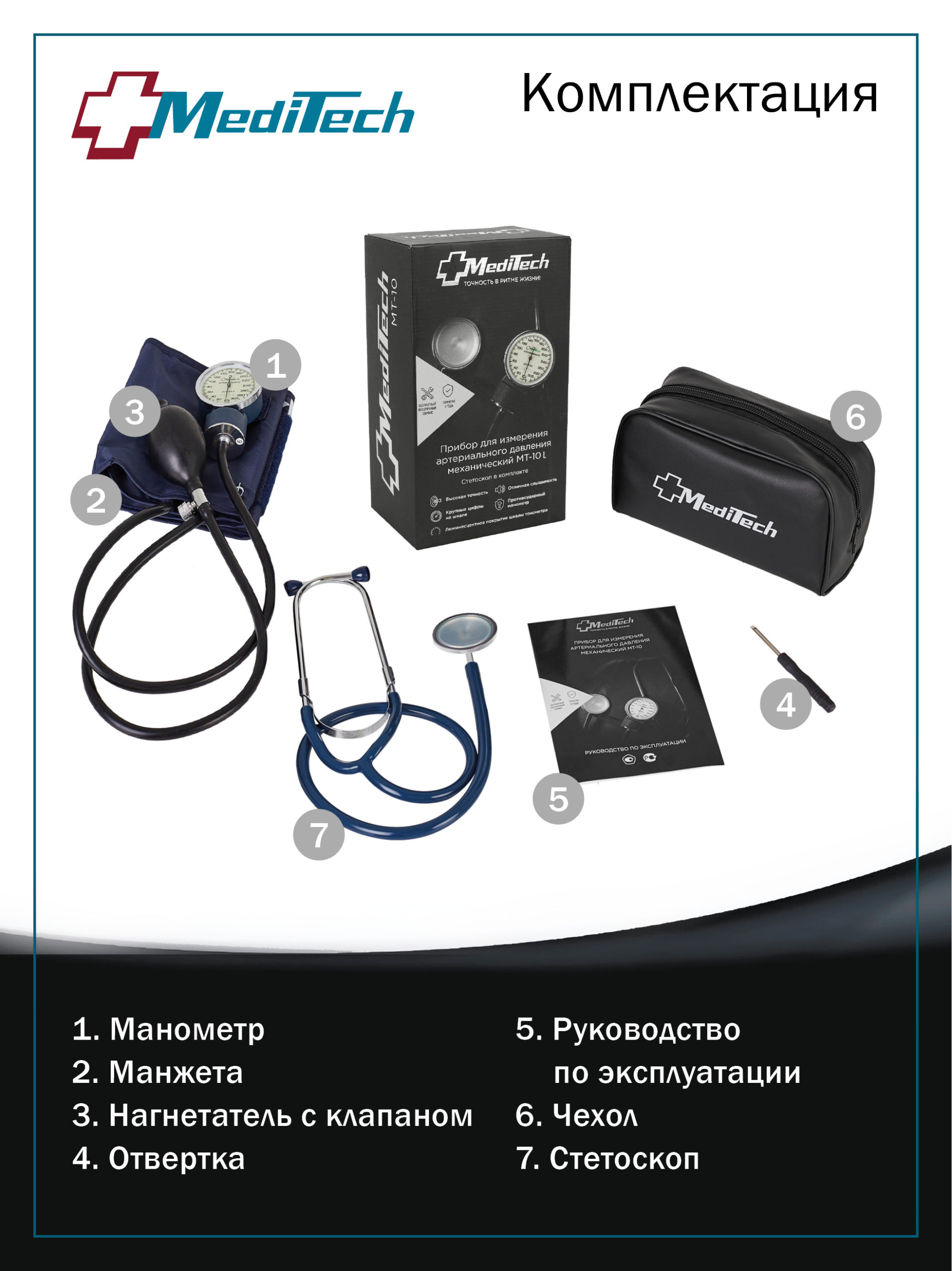 Механический тонометр МТ-10L с отдельным стетоскопом и люминесцентным покрытием