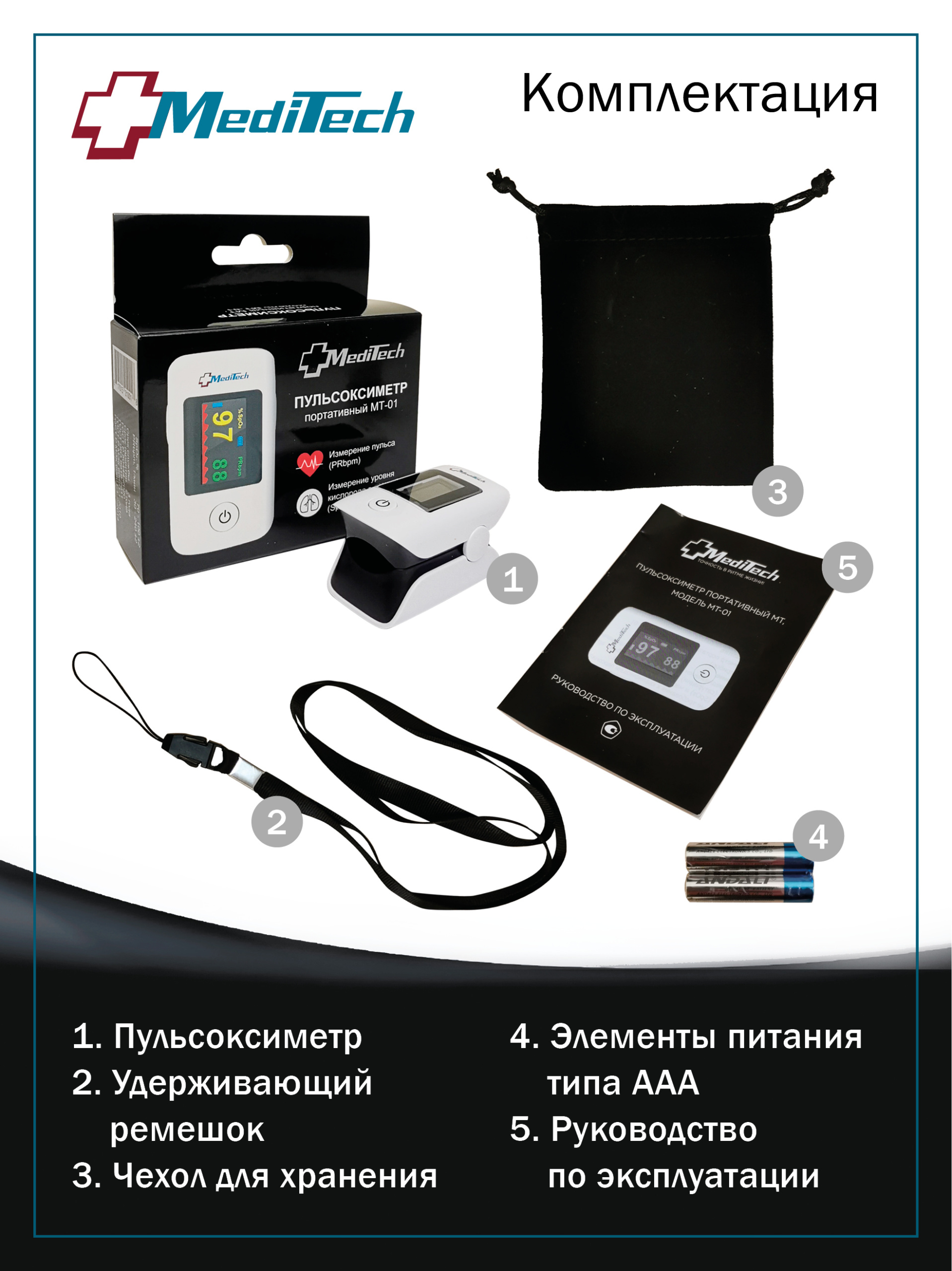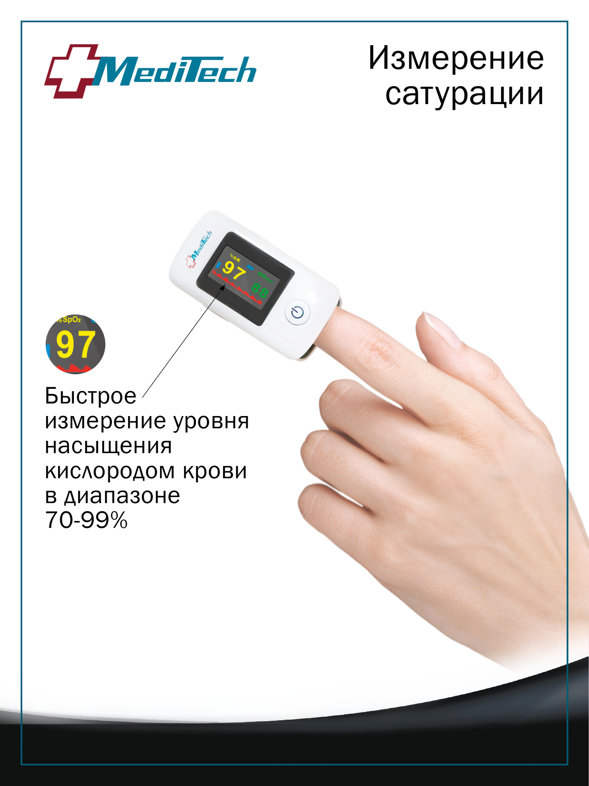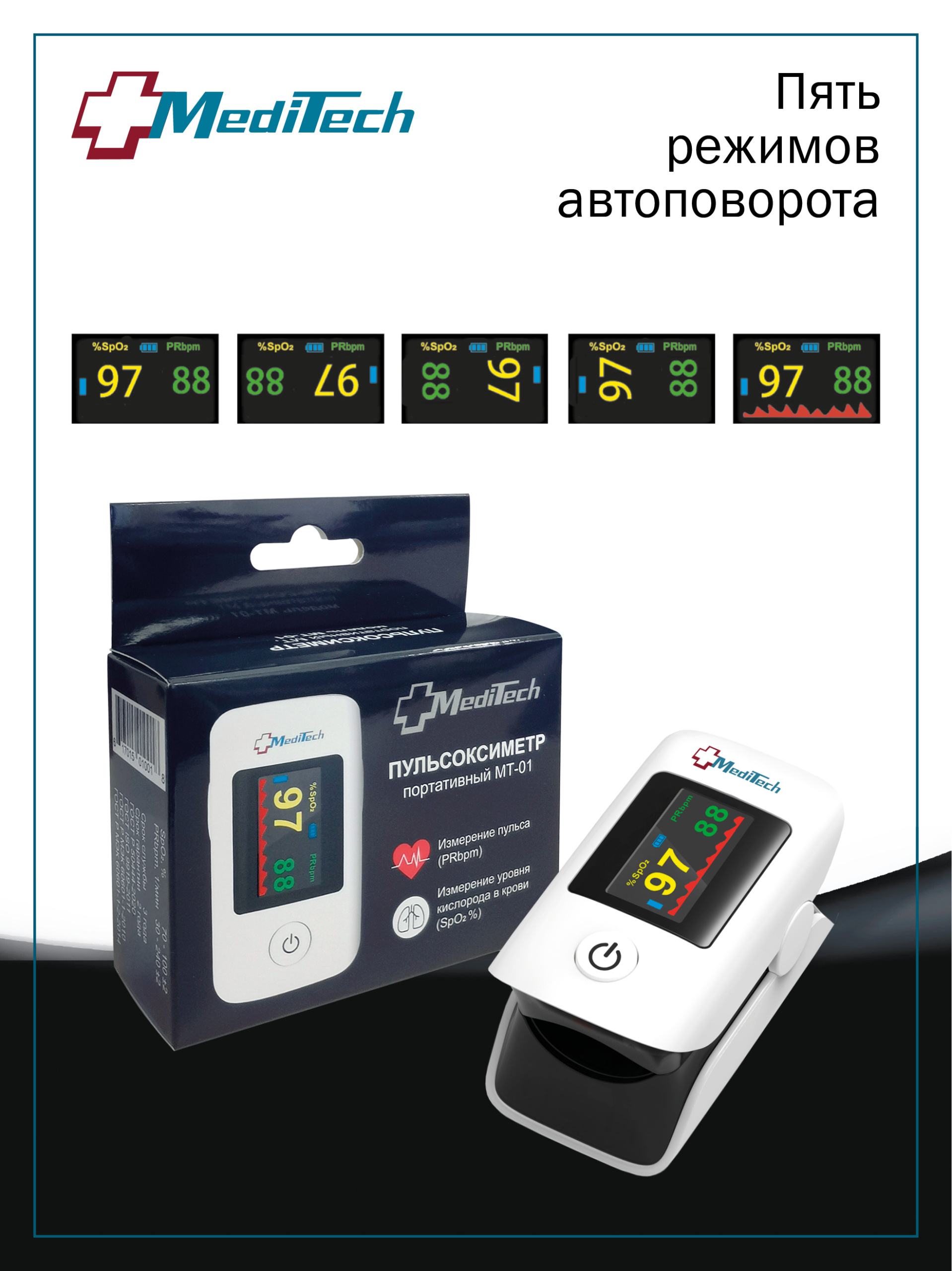 Пульсоксиметр портативный МТ-01 MediTech предназначен для быстрого измерения пульса и уровня насыщения кислородом гемоглобина артериальной крови человека у взрослых и детей в медицинских учреждениях и в домашних условиях.