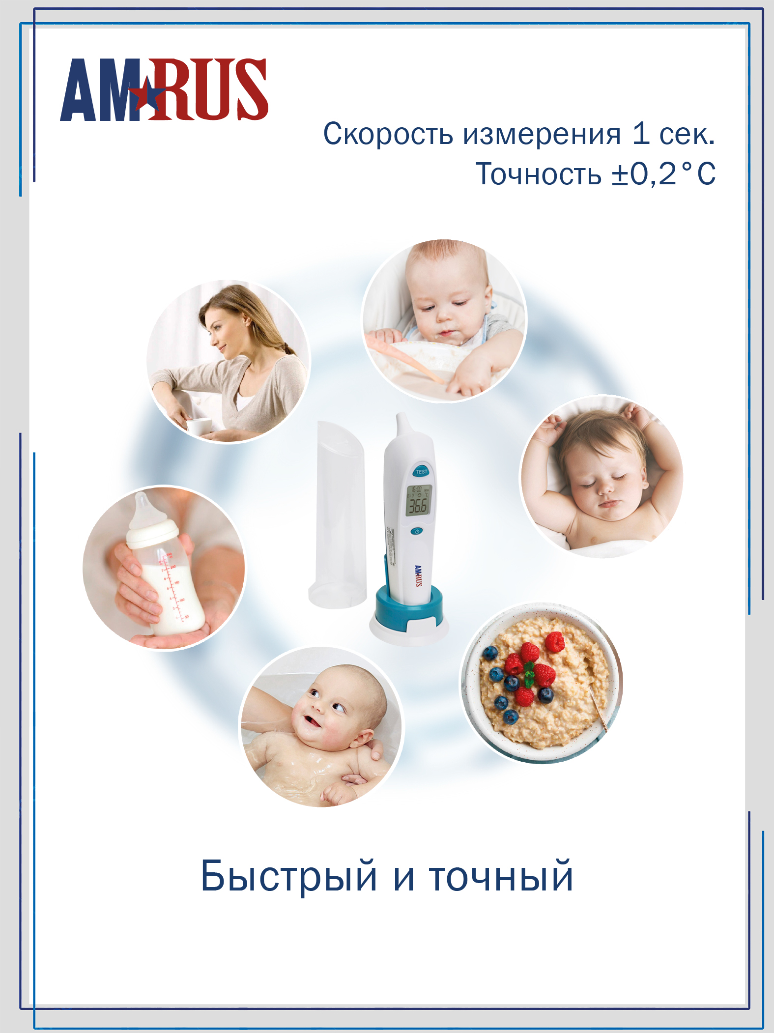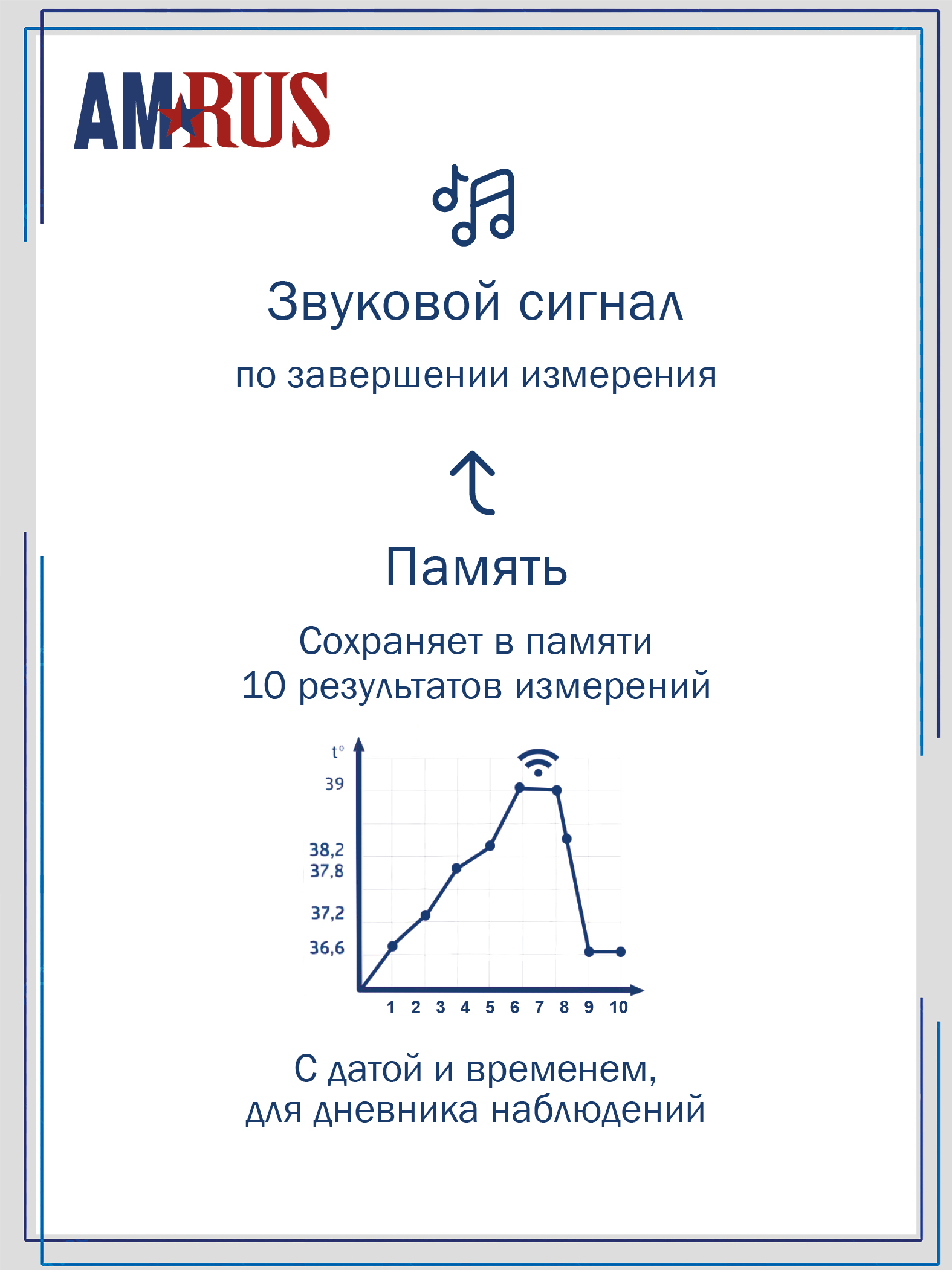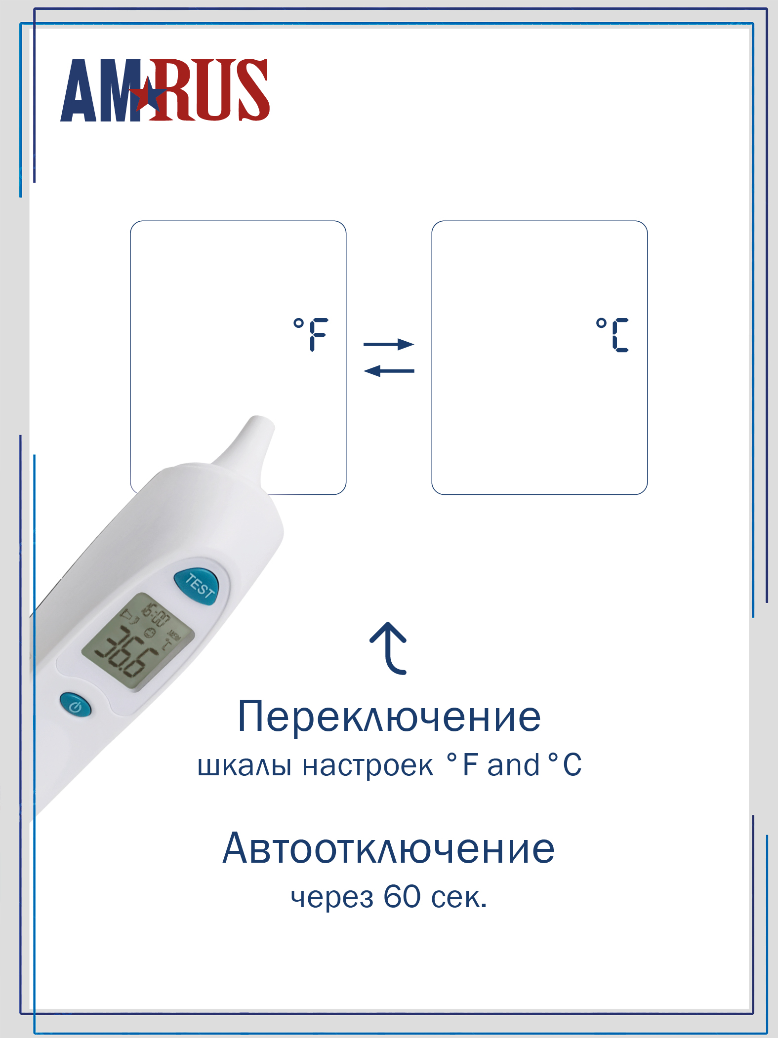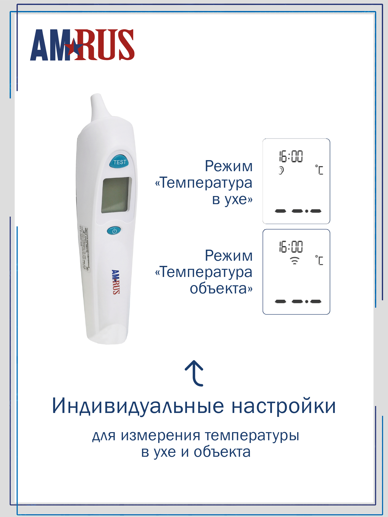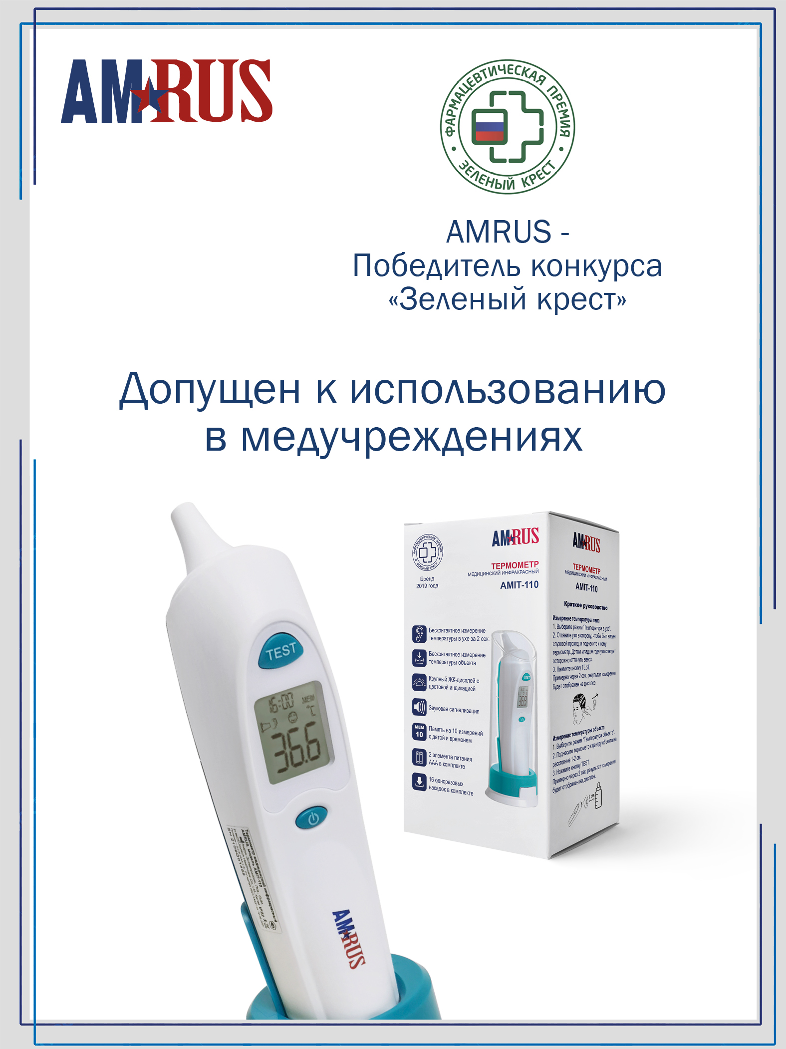 Инфракрасный медицинский термометр AMRUS AMIT-110 предназначен для измерения температуры тела человека (в ухе) и предметов бесконтактным способом. Время измерения – 2 сек. Прибор имеет крупный ЖК дисплей с цветовой индикацией, звуковую сигнализацию и память на 10 измерений с датой и временем. В комплект входят 2 элемента питания ААА и 16 одноразовых насадок для измерения температуры в ухе.