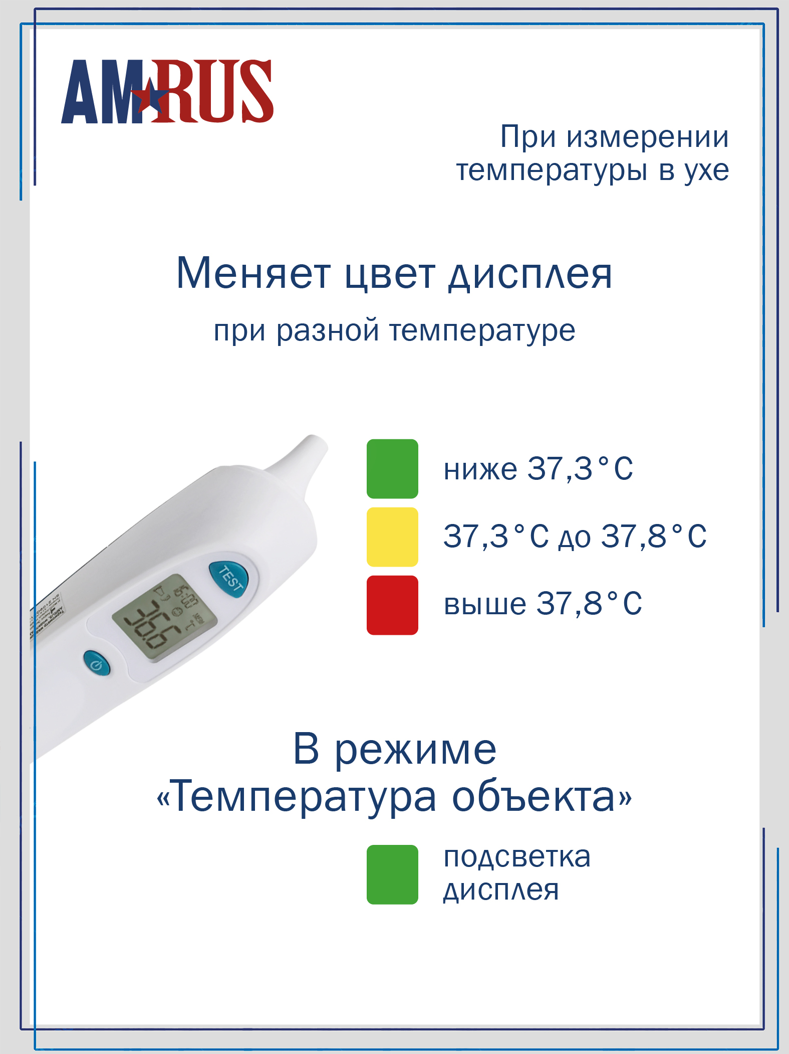 В режиме «Температура в ухе» прибор меняет цветовую индикацию в зависимости от температуры: