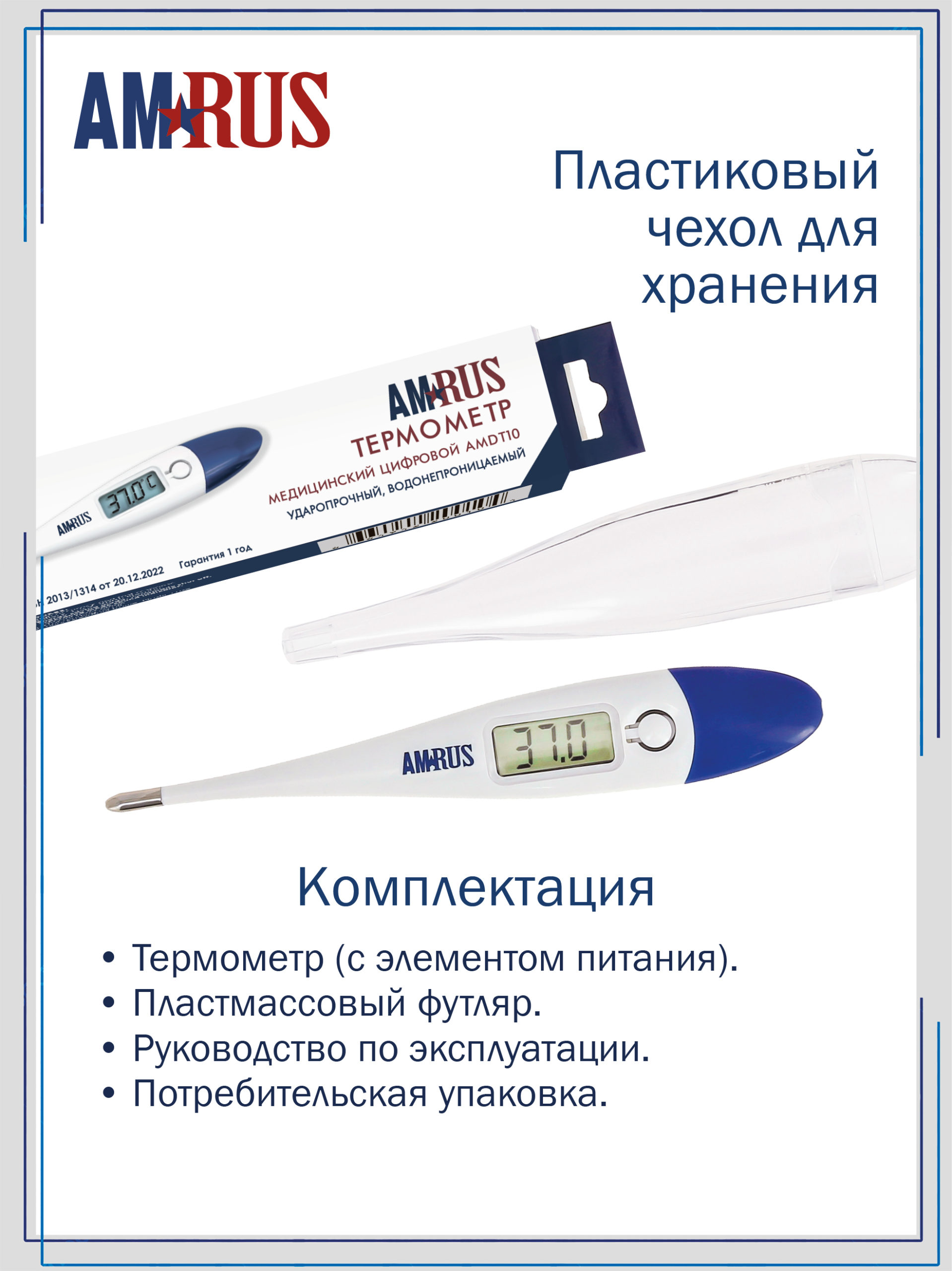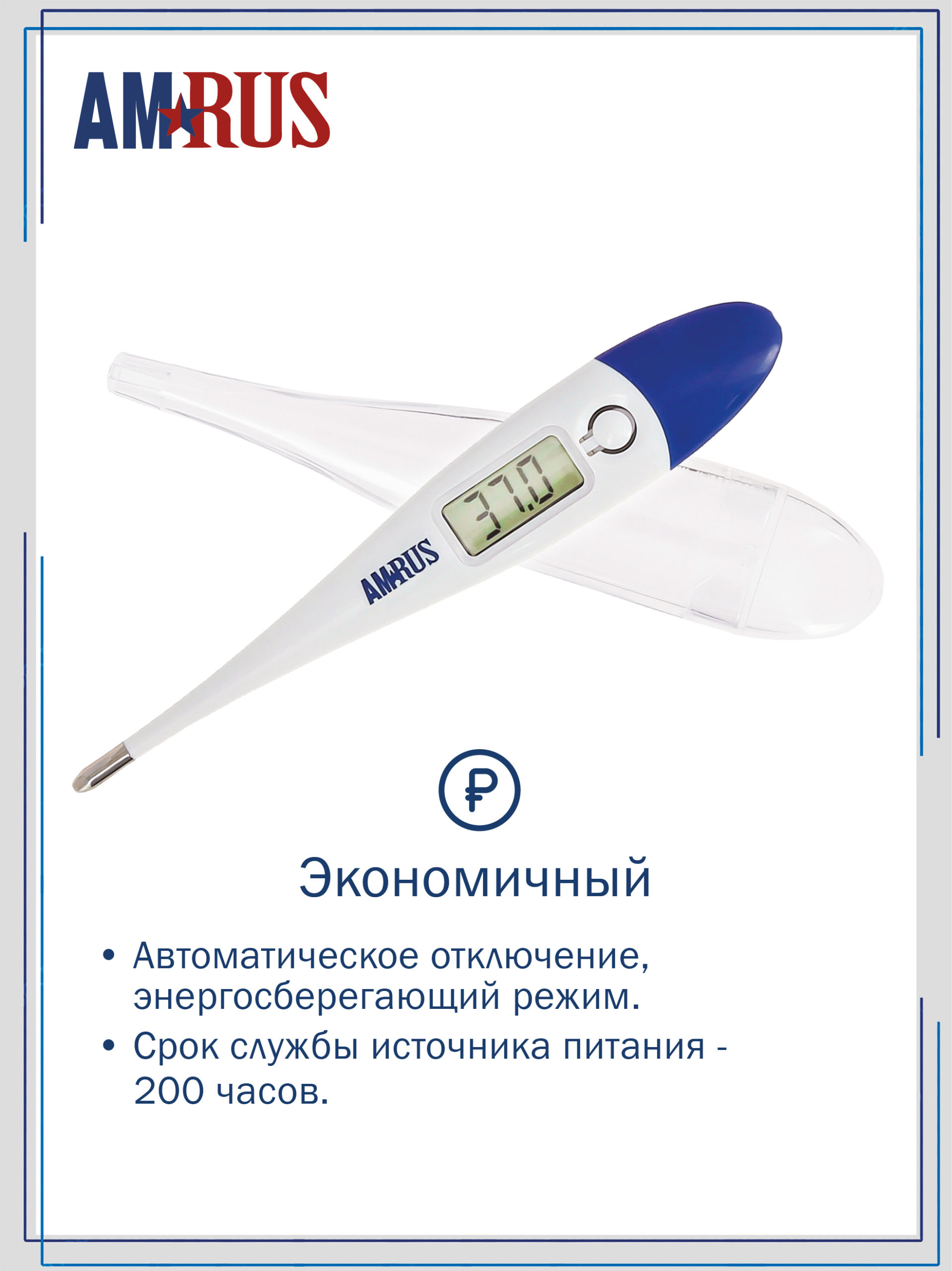 Корпус имеет степень защиты IP 27 — ударопрочный водонепроницаемый. Термометр характеризуется высоким быстродействием и точностью. Кнопка включения/выключения — пластмассовая.