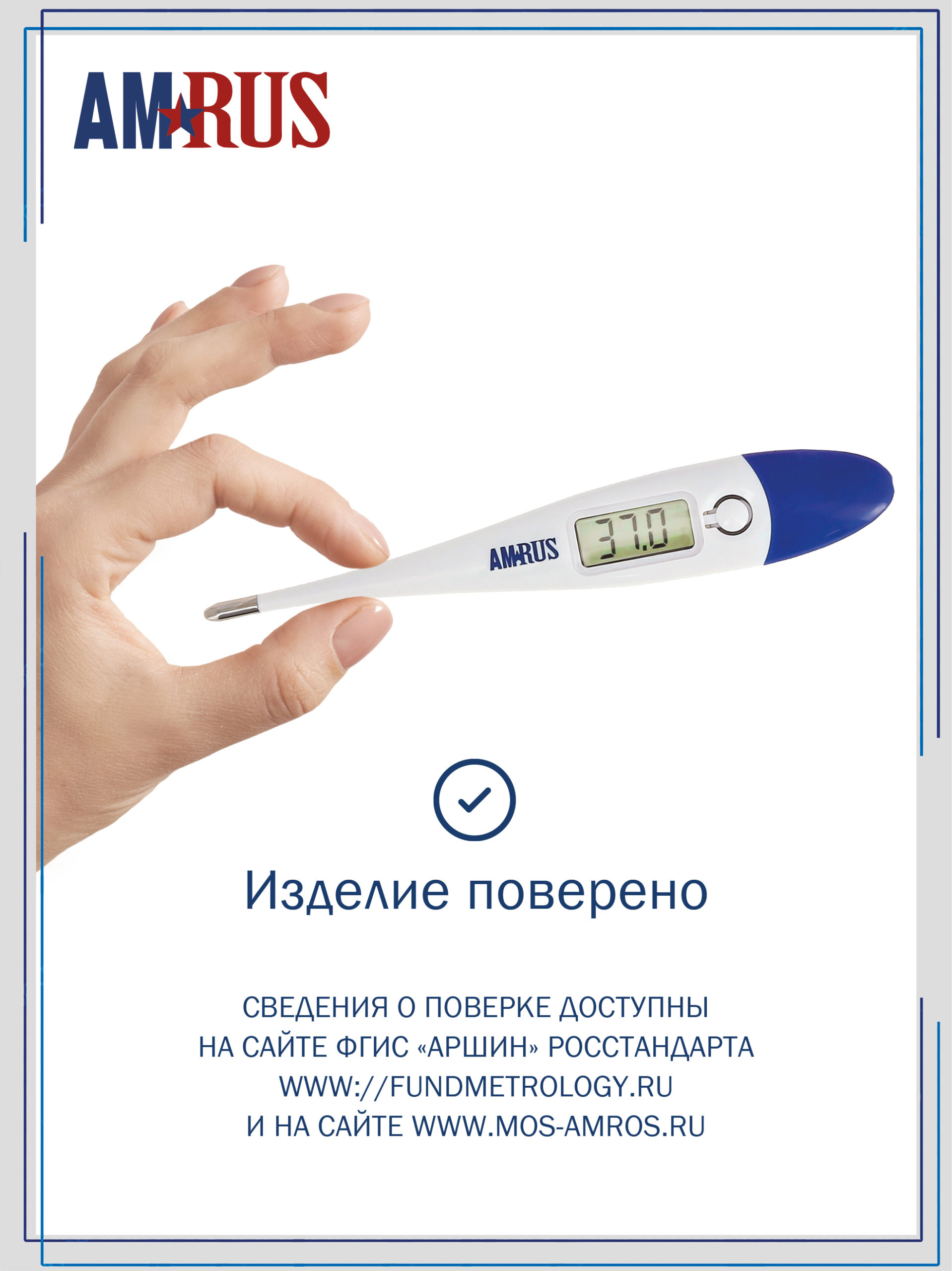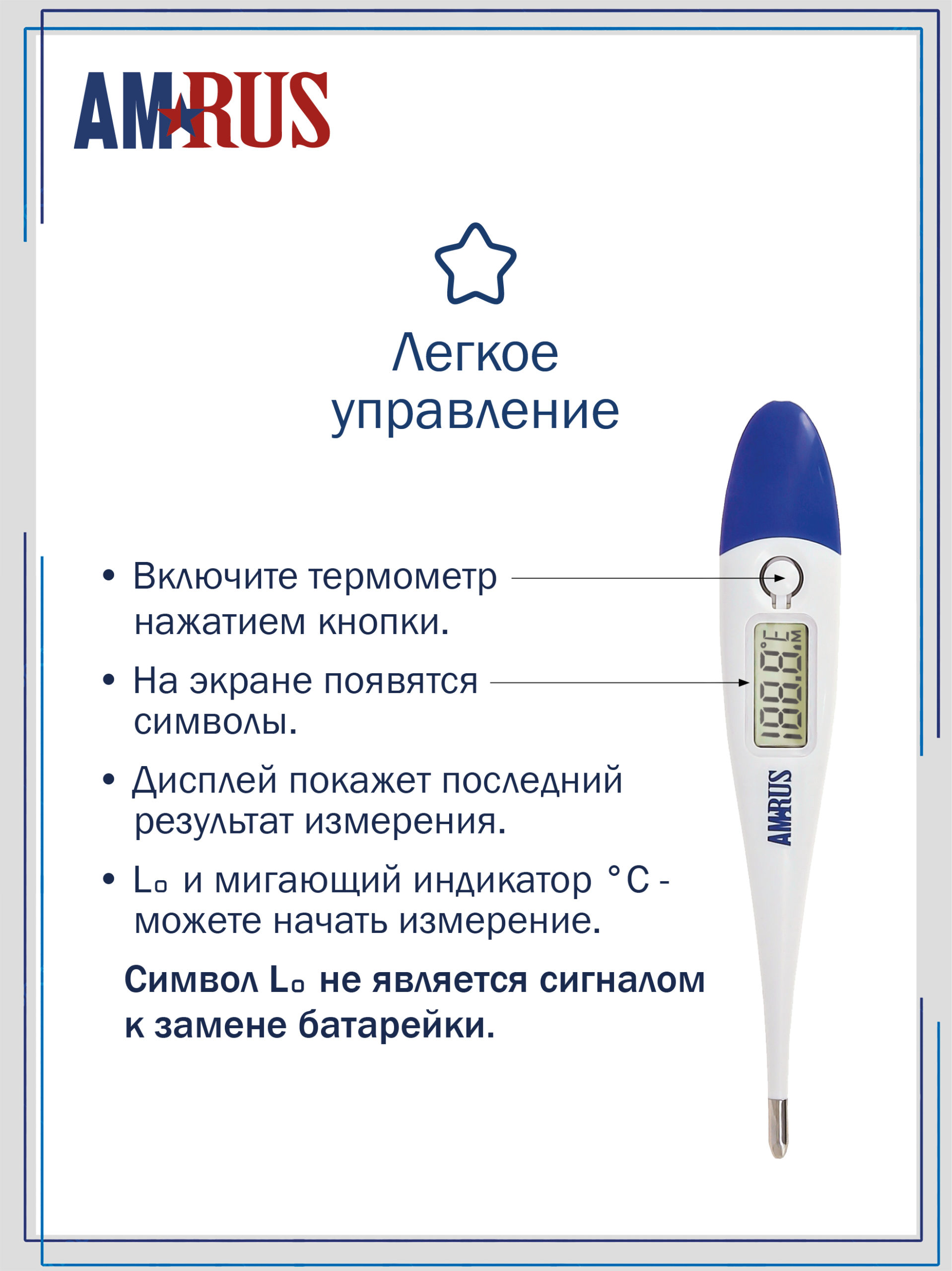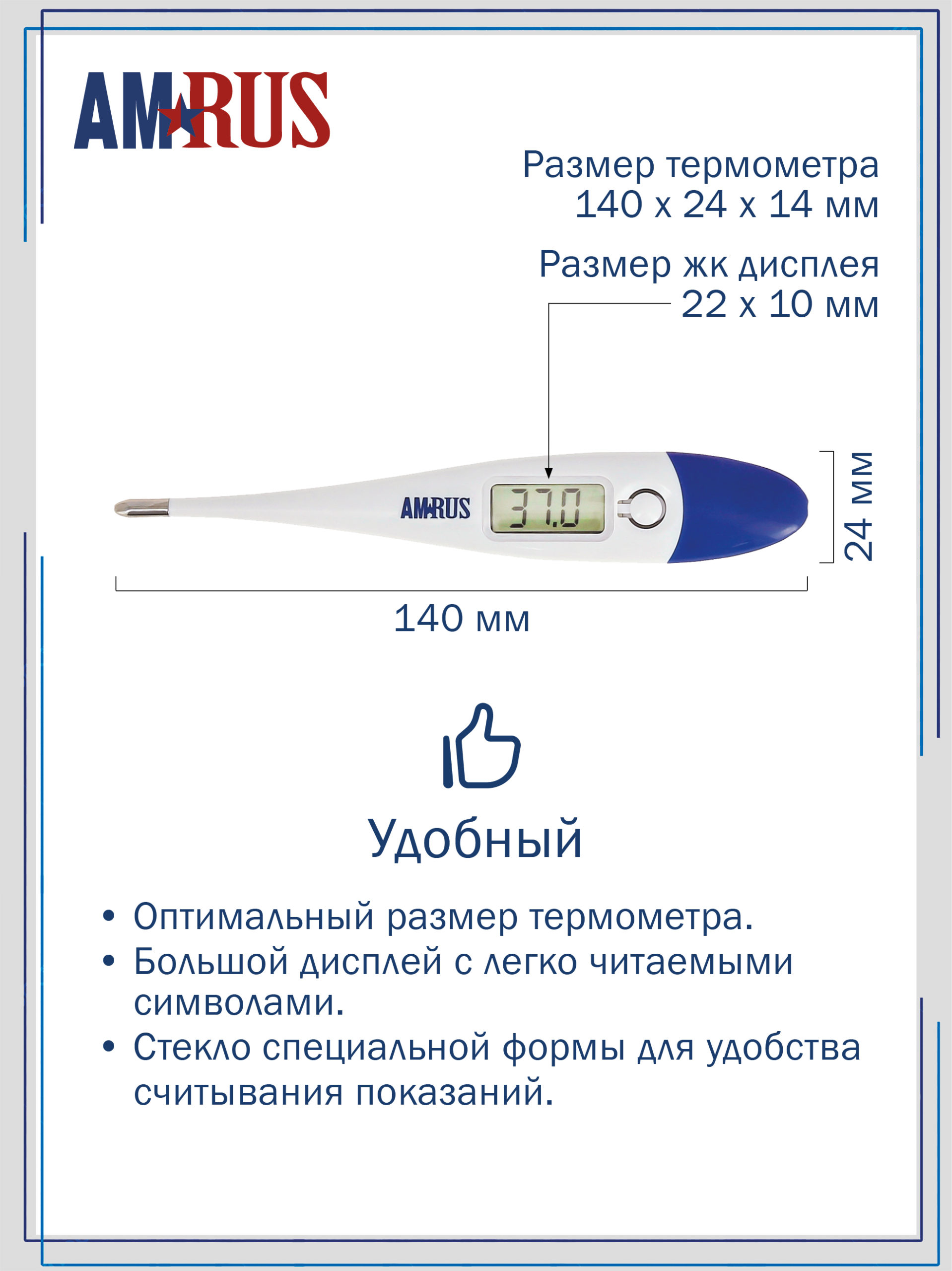 Термометр медицинский цифровой AMDT10 оснащен большим дисплеем с крупными легко читаемыми символами и стеклом специальной формы для удобства считывания показаний.