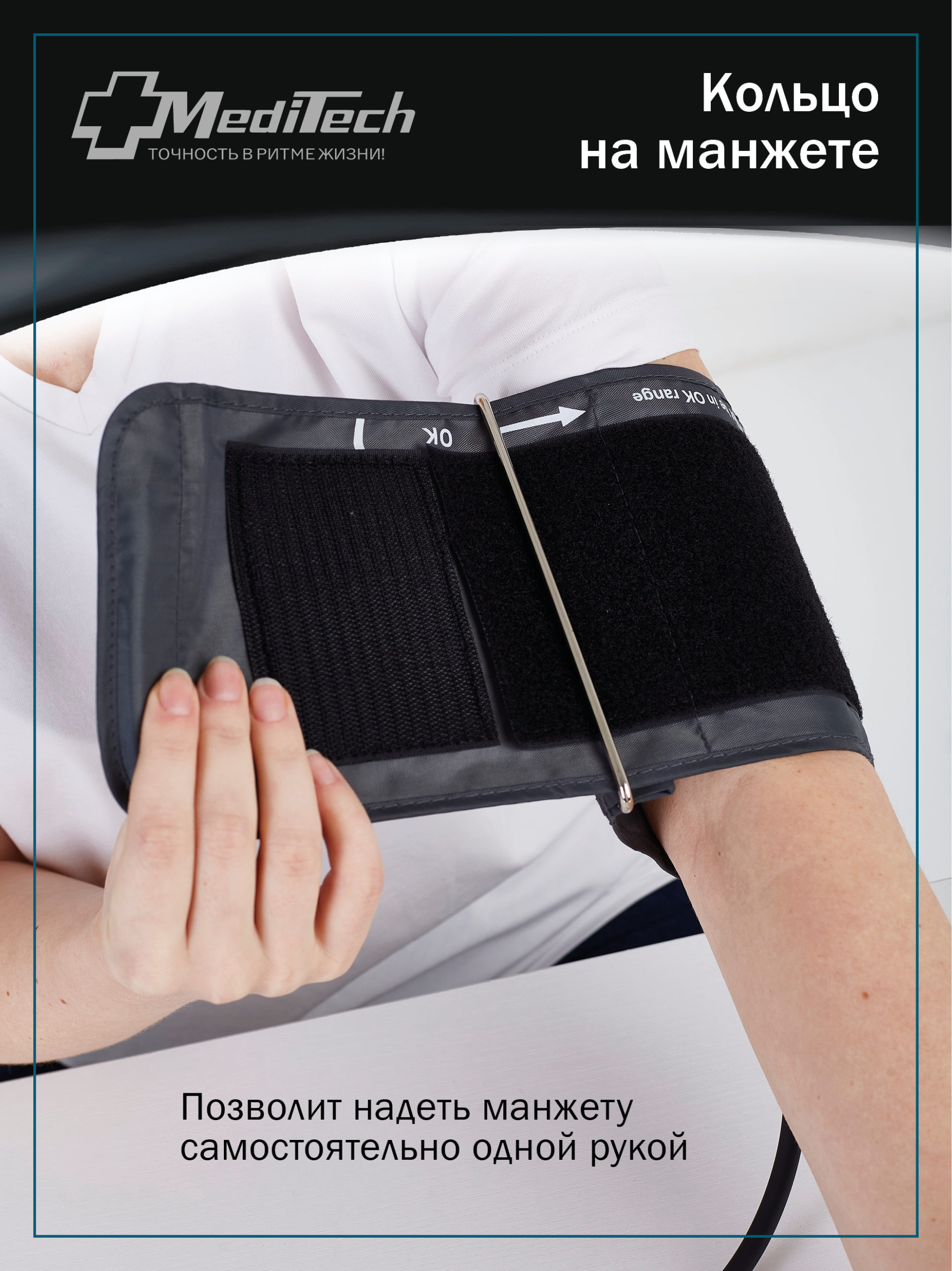 Металлическая скоба манжеты предназначена для фиксации и удобства надевания манжеты на плечо