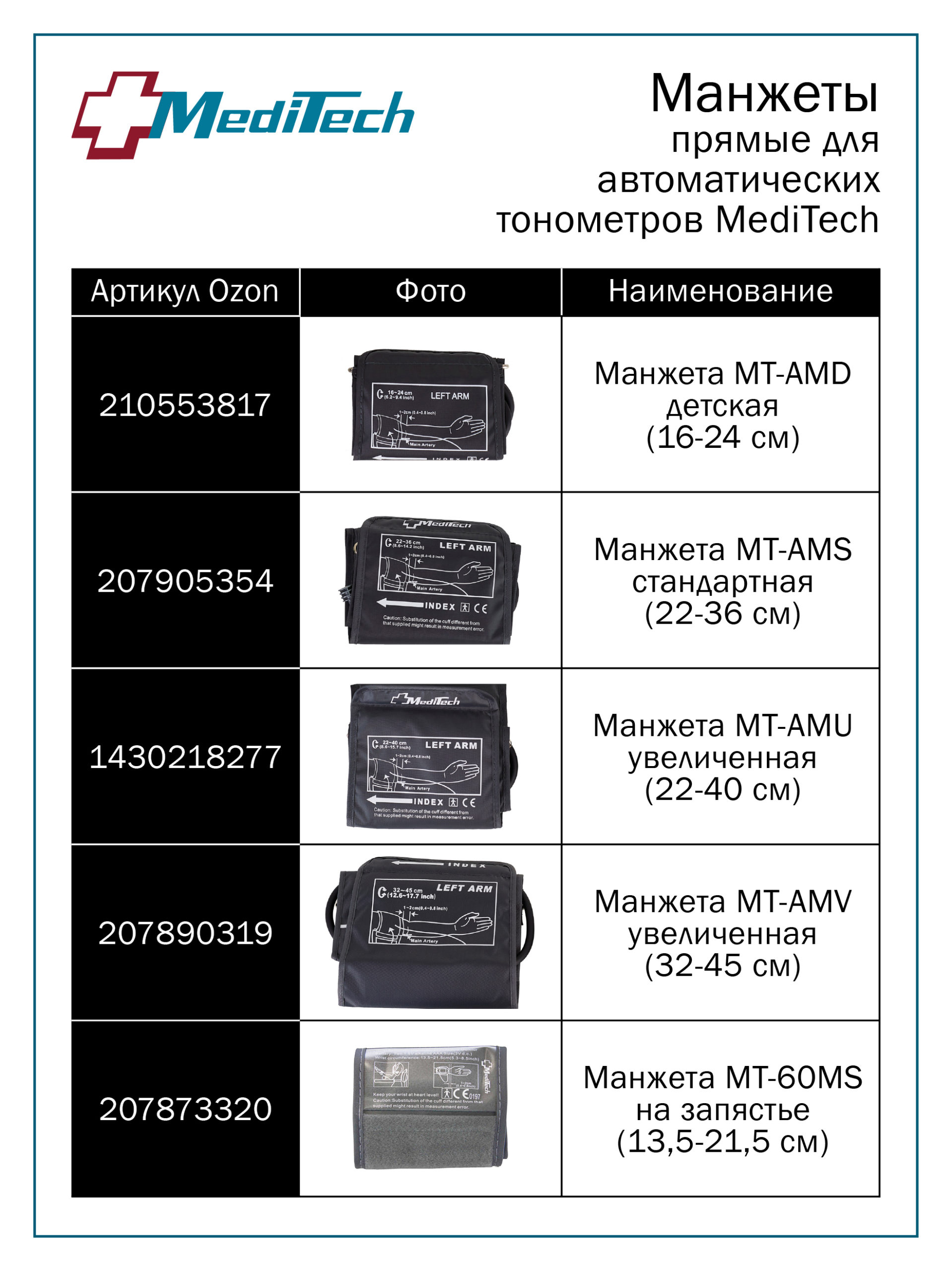 подходит для автоматических тонометров MediTech серии FAMILY (модели МТ-30, МТ-40, МТ-45,