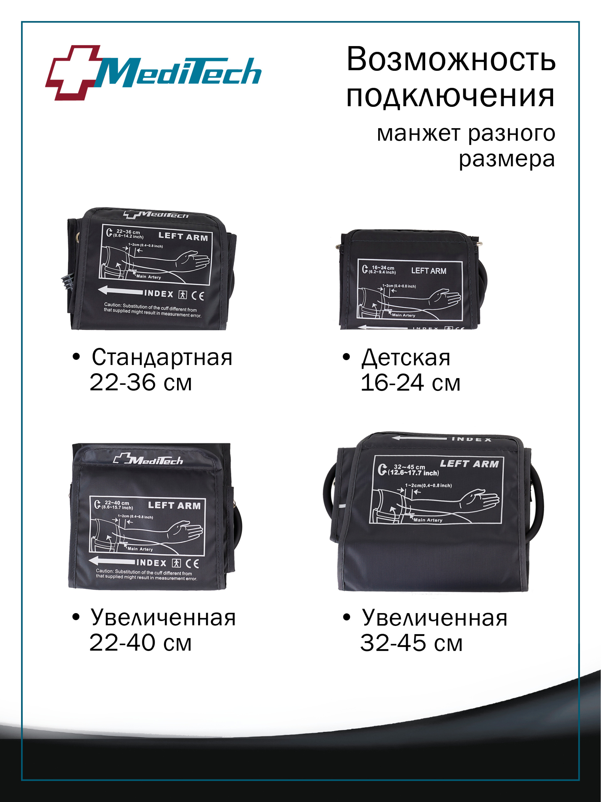 (детская/малая на окружность руки 16-24 см, стандартная 22-36 см, увеличенная 32-45 см). Прибор