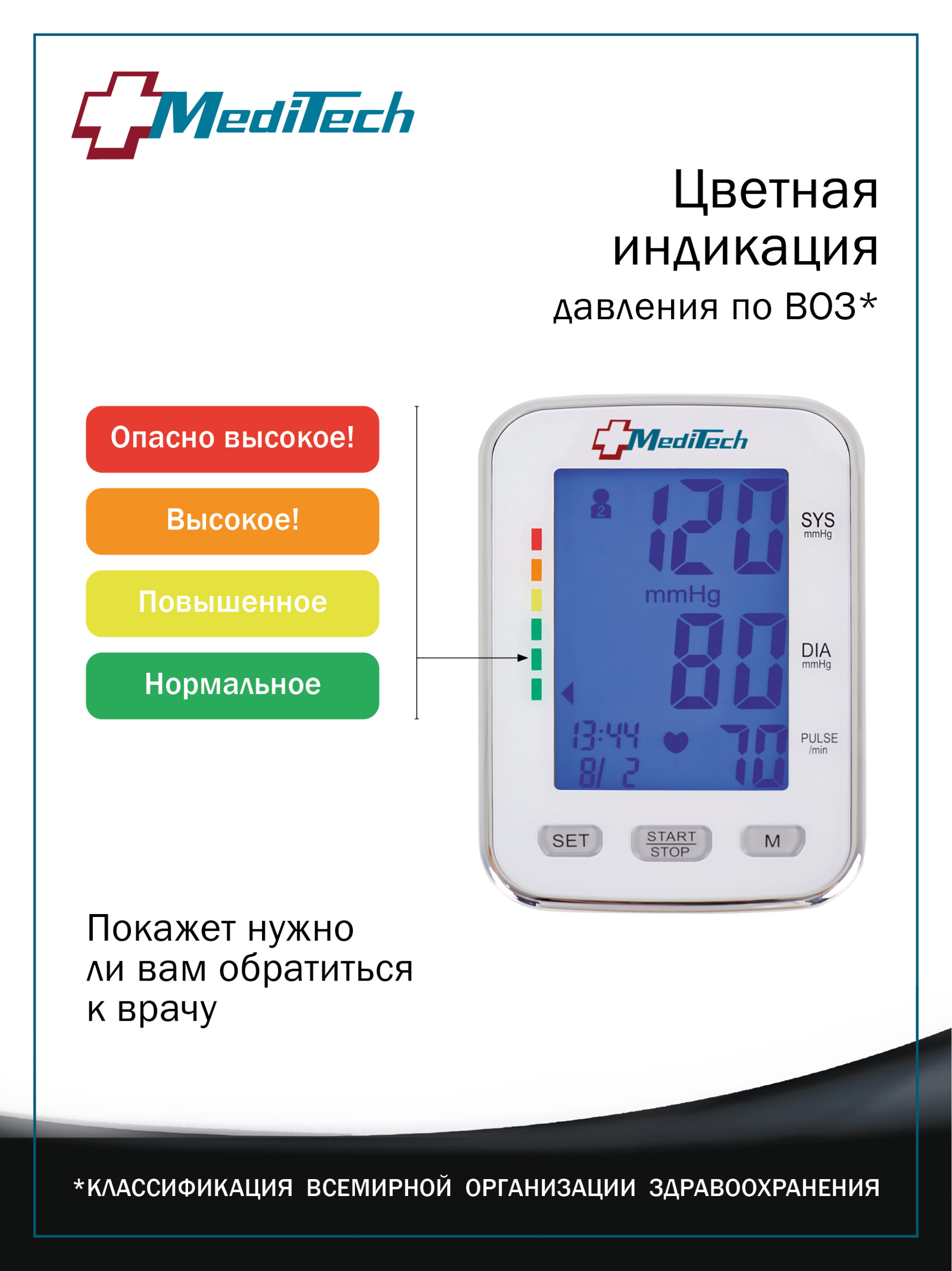• Цветная индикация давления по классификации ВОЗ позволяет оценить результат, определить