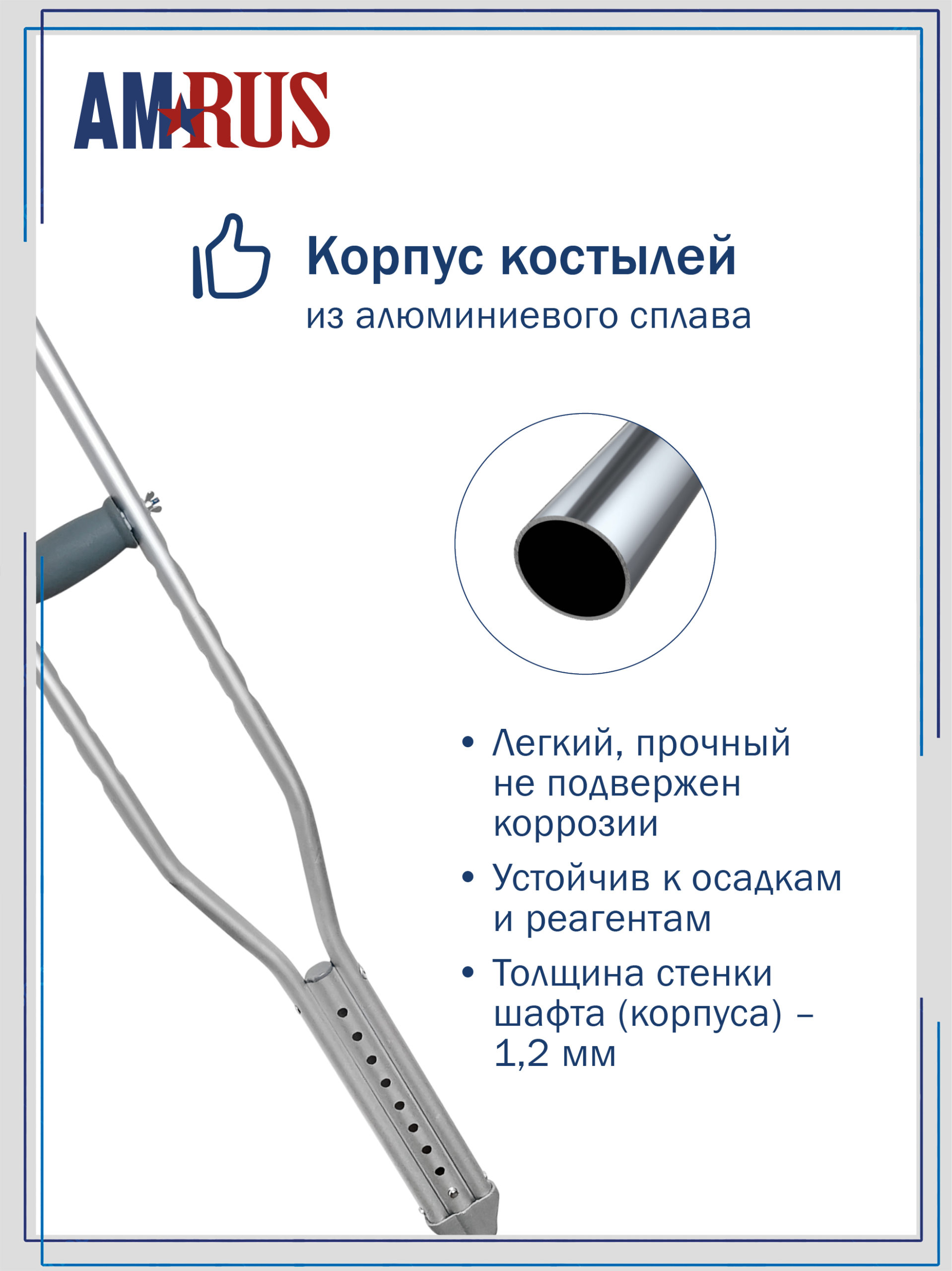 Подмышечные костыли с выдвижным устройством против скольжения облегчают самостоятельное передвижение и обеспечивают безопасность при ходьбе по льду, снегу и мокрому грунту людям после операций и травм нижних конечностей. Костыли перераспределяют нагрузку с нижних конечностей и повышают устойчивость при ходьбе во время реабилитации. Костыль рассчитан на массу пользователя 100 кг.