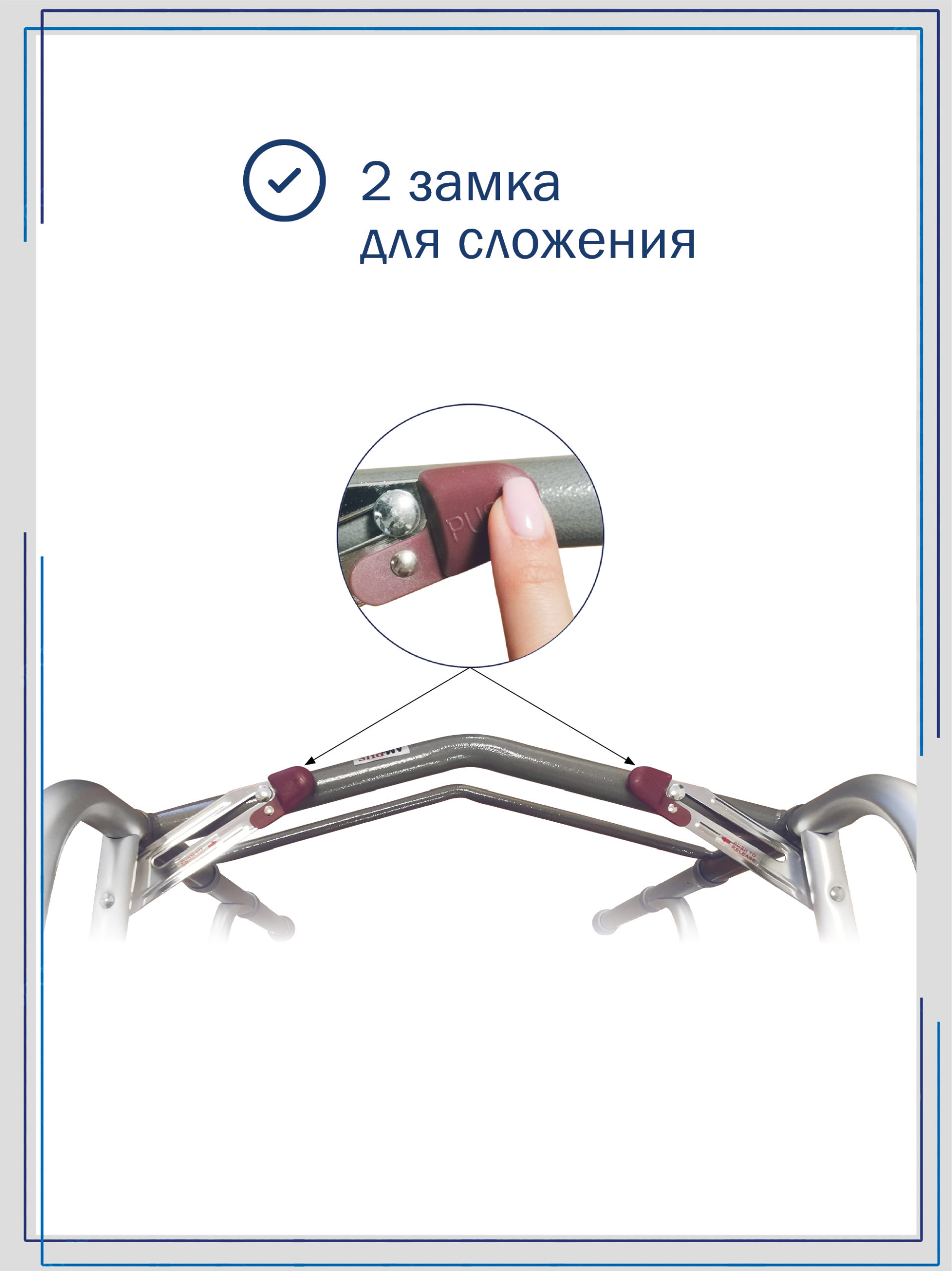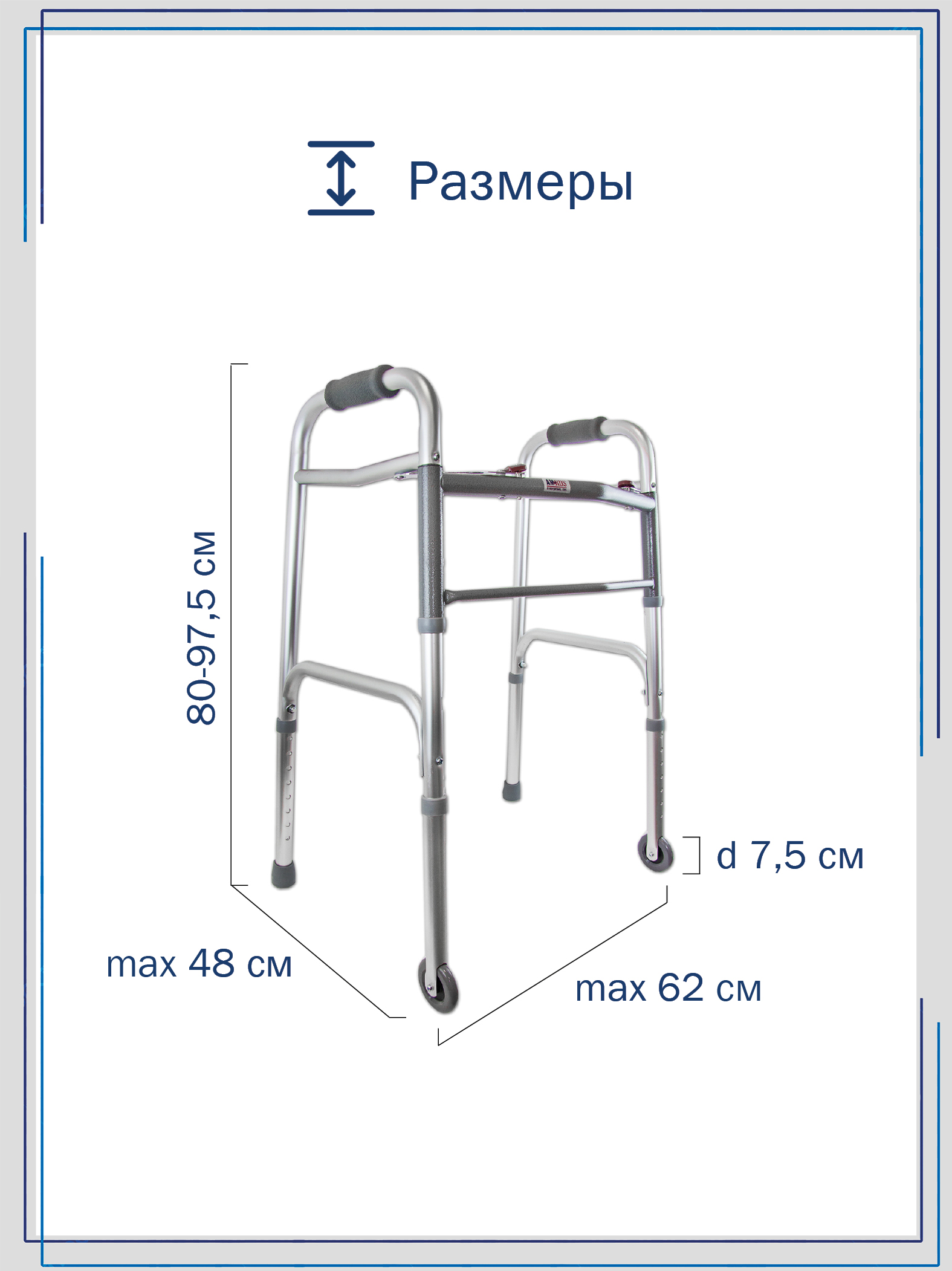 Опоры-ходунки прогулочные, с двумя замками, на 2-х опорах и 2-х колесах (∅ 75 мм) AMW2B75