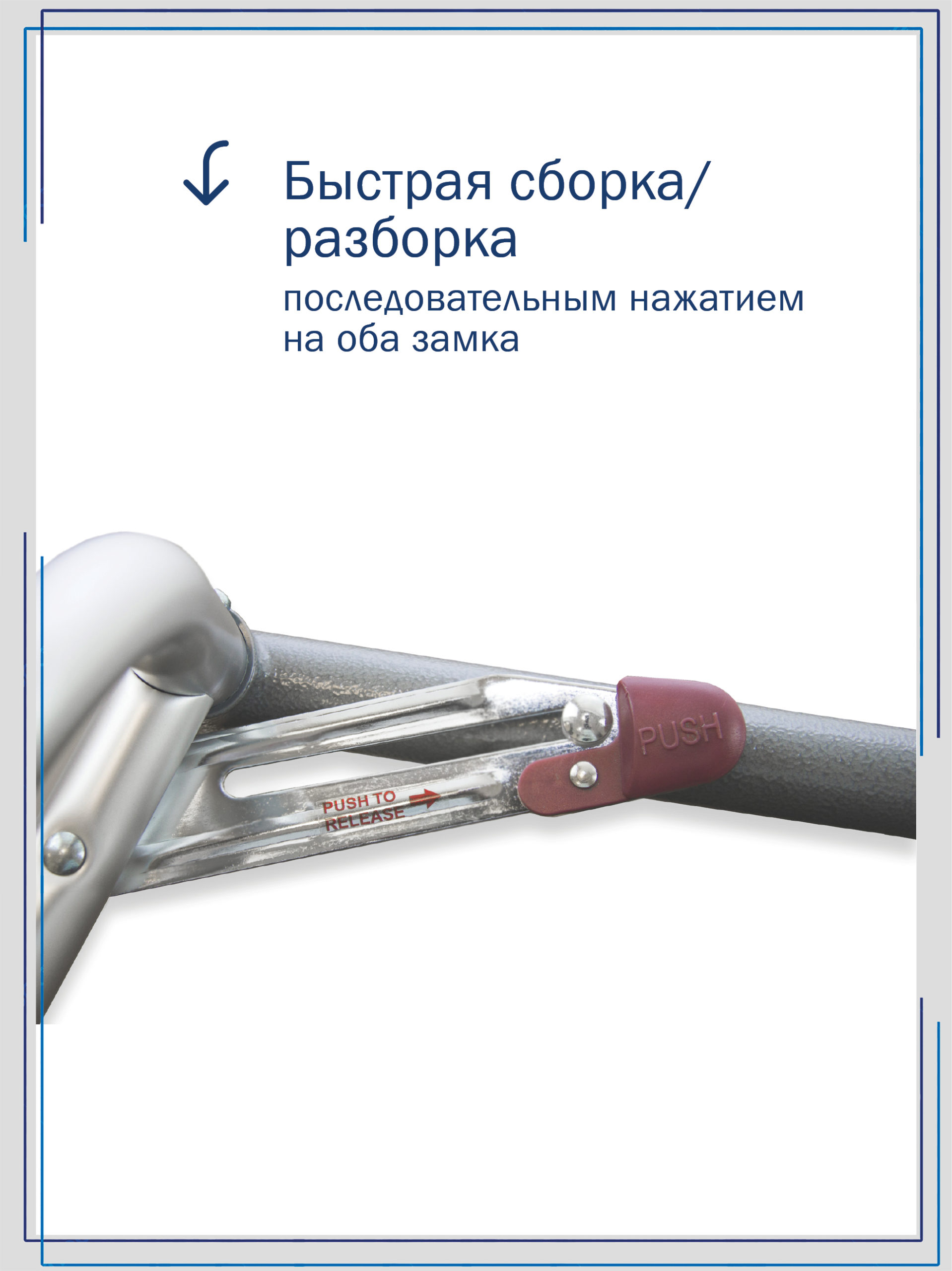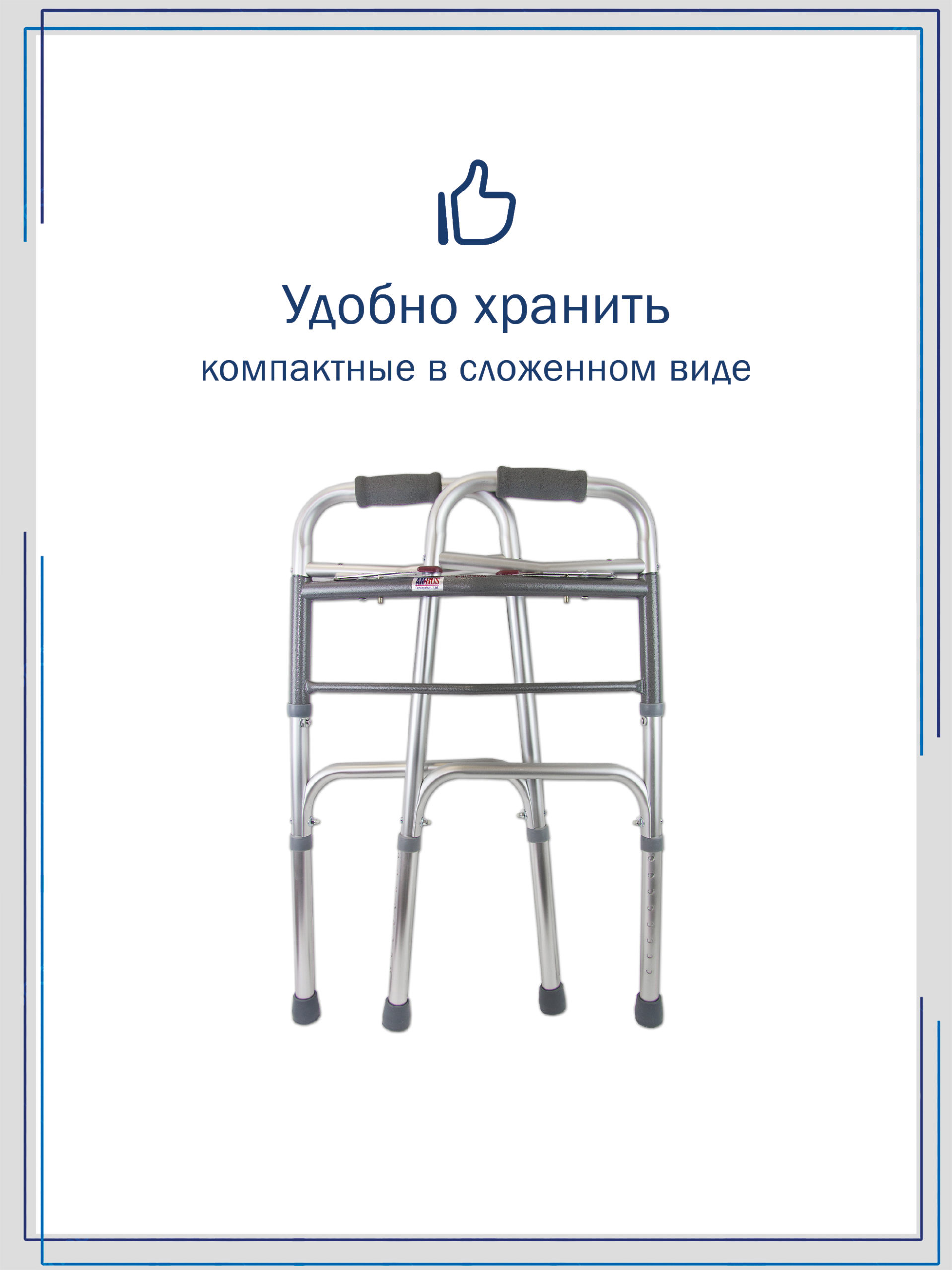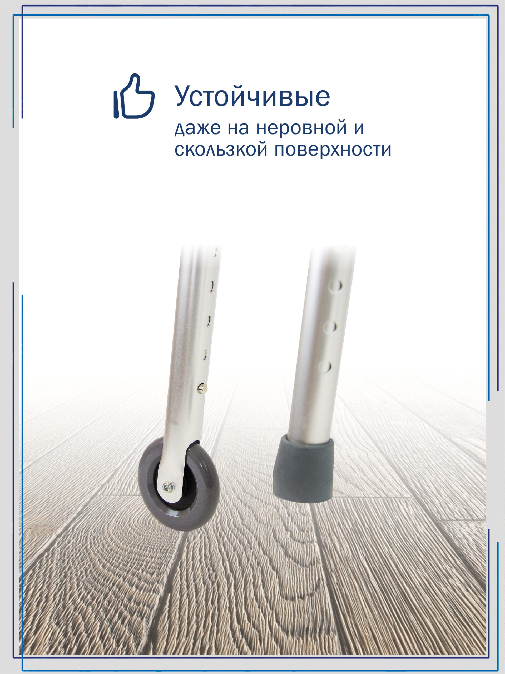 Ходунки предназначены для быстрого передвижения пожилых людей после травм и операций. Это наиболее востребованный вариант ходунков во время восстановления на поздних сроках. В рабочем состоянии конструкция надёжно держит форму. Модель лёгкая, выполнена из алюминиевого сплава и оснащена небольшими передними колёсами диаметром 75 мм, что избавляет пациента от необходимости поднимать раму при ходьбе. Мягкие рукоятки из вспененного материала не натирают ладони. Ходунки имеют телескопическую конструкцию для регулировки высоты и два кнопочных замка для фиксации в сложенном и разложенном виде. Складываются в два приёма.