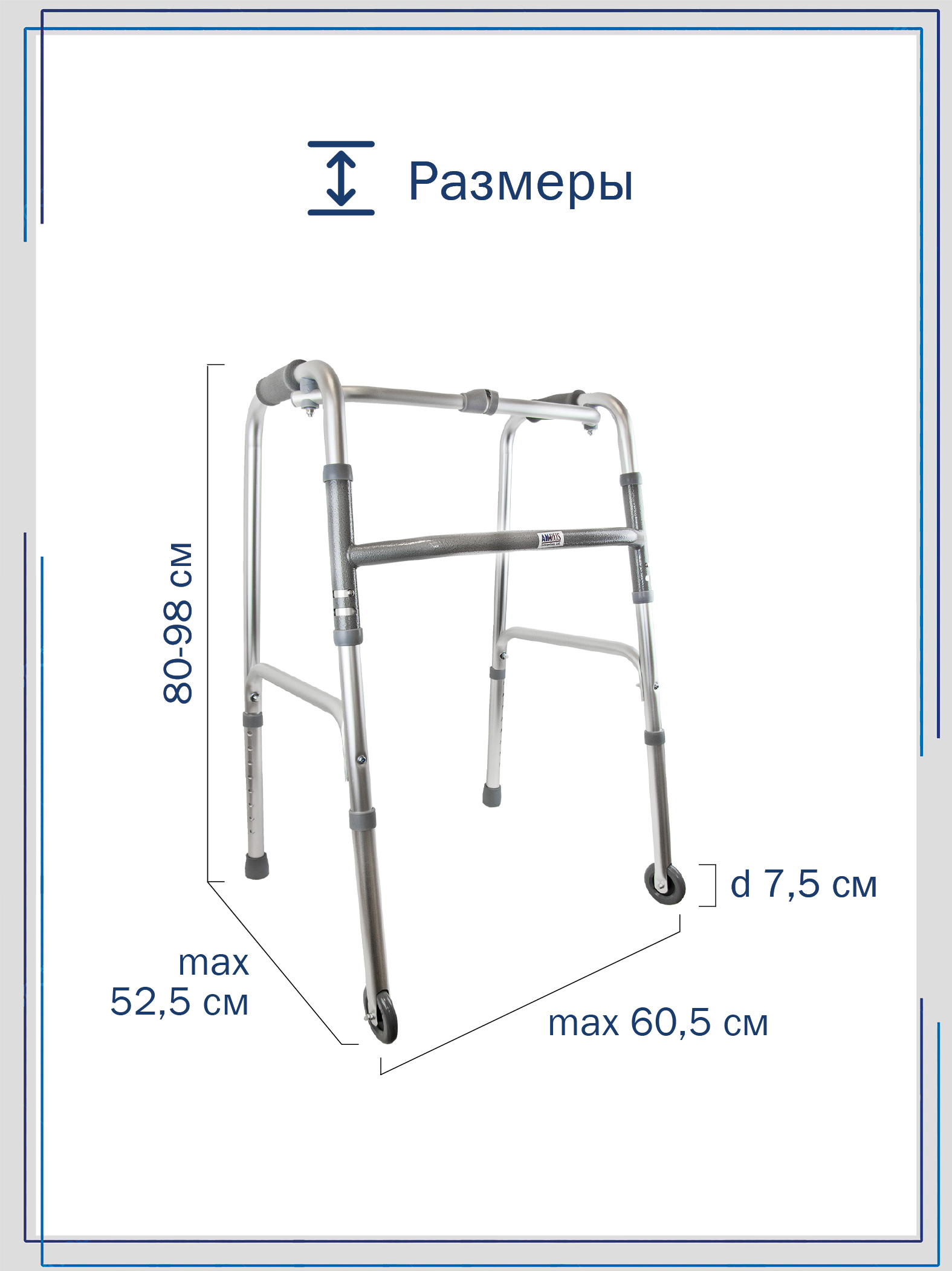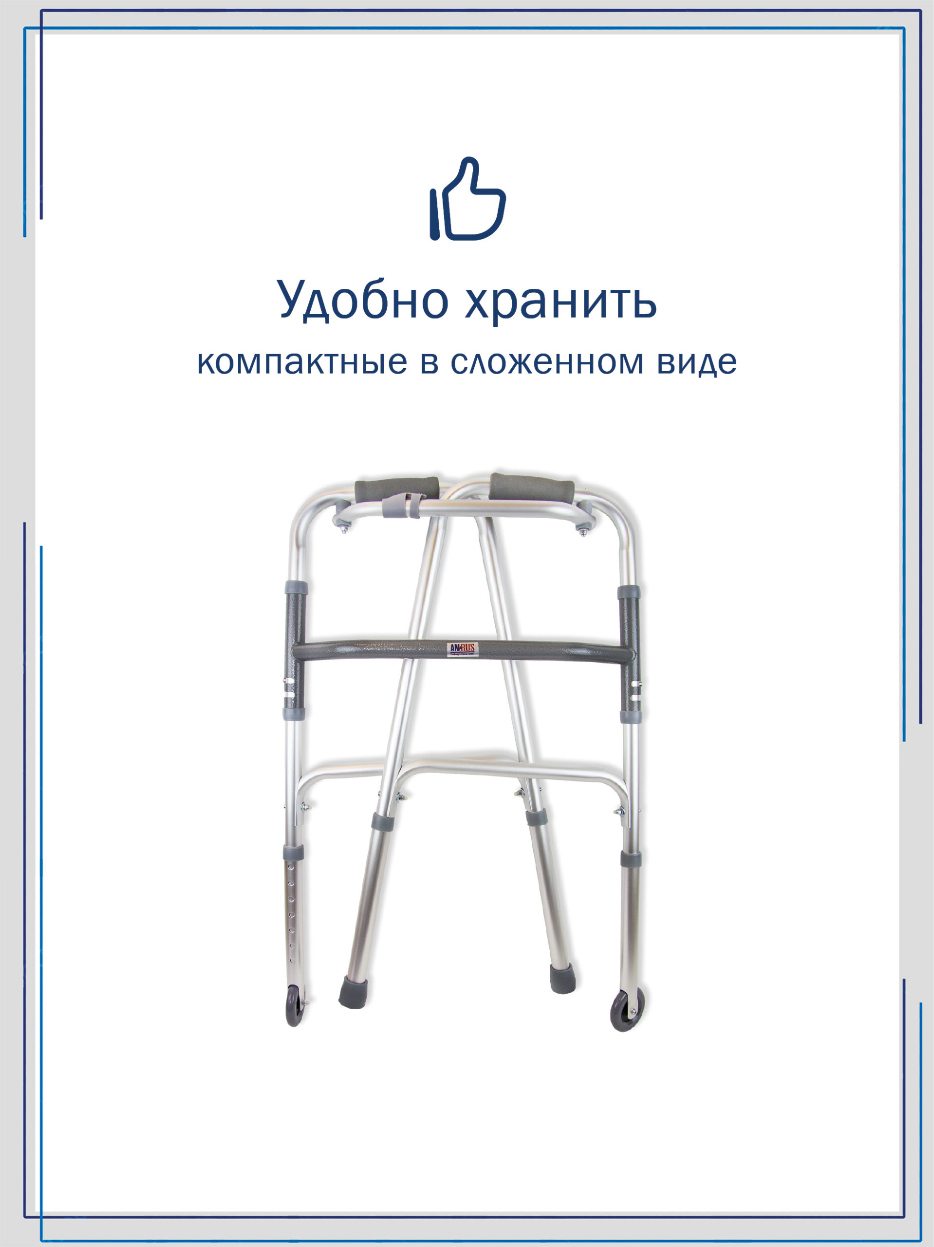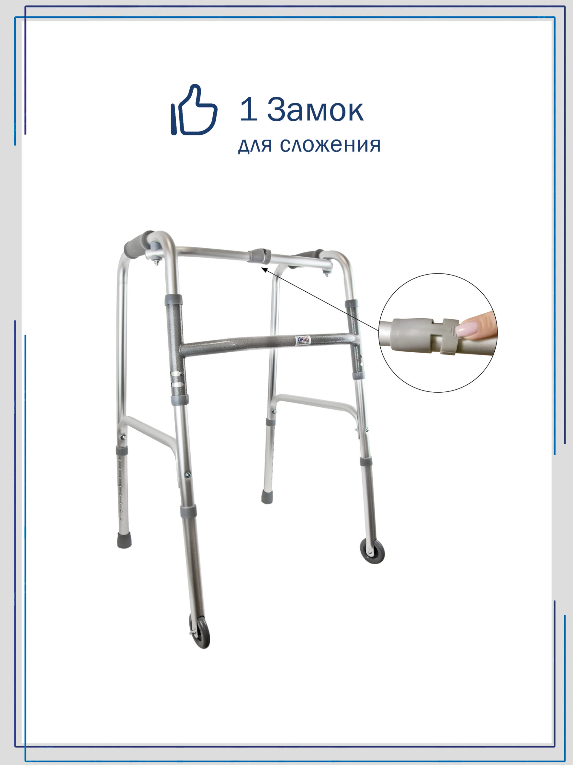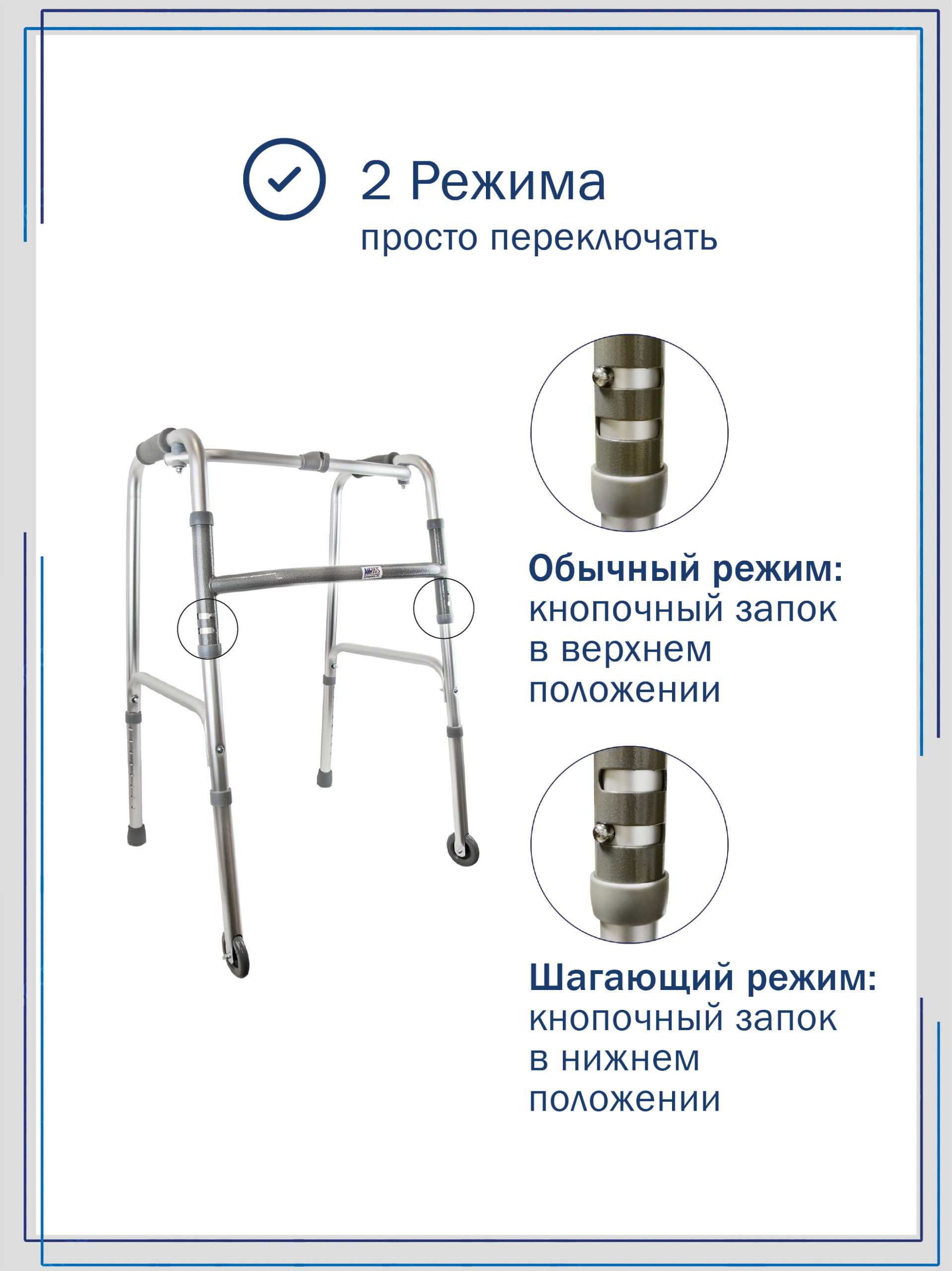 Модель с переключением режимов «Шагающий/Обычный». Ходунки с колесами выполнены из алюминиевого сплава и рекомендуется для использования пожилыми и ослабленными людьми в реабилитации после травм и болезней. Передние колеса избавляют от необходимости поднимать опоры, что особенно важно для людей с ослабленными руками.