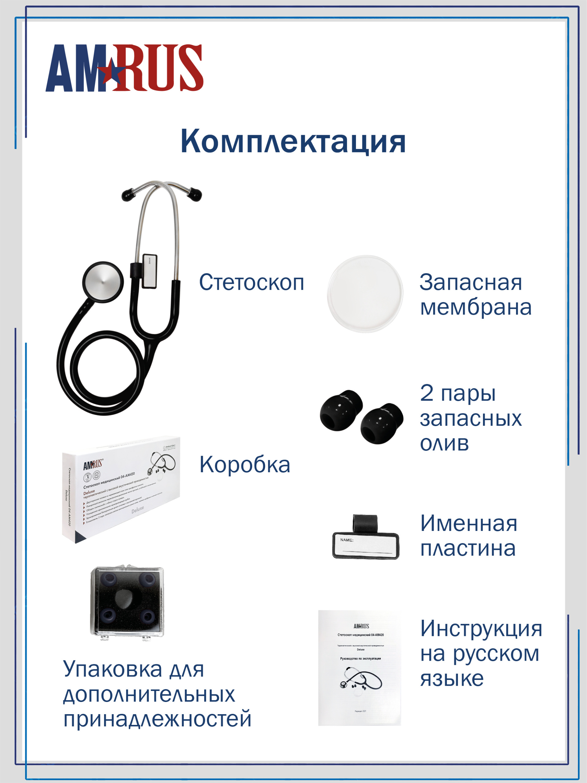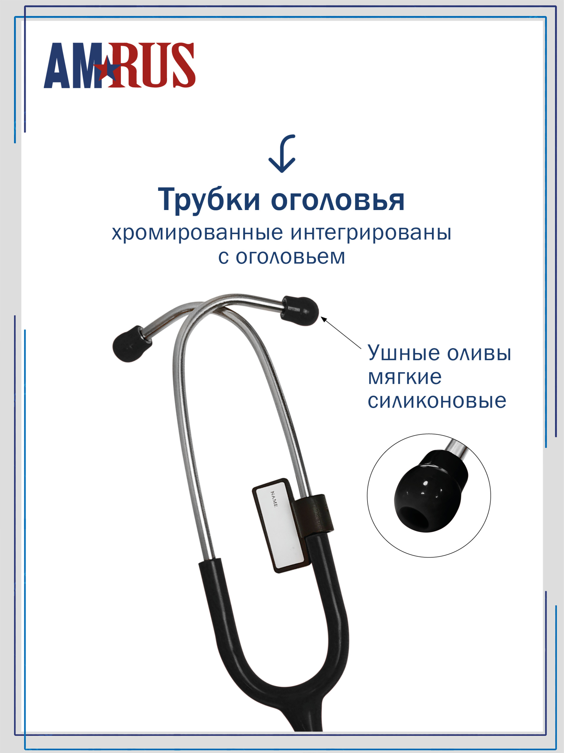 Утолщенные звукопроводящие трубки обеспечивают наилучшую изоляцию от посторонних шумов. Внутренняя пружина улучшает акустические свойства стетоскопа. Мягкие ушные оливы закругленной формы для комфортной изоляции внешнего слухового канала. Две пары сменных ушных олив и сменная мембрана, а также именная пластина в комплекте.