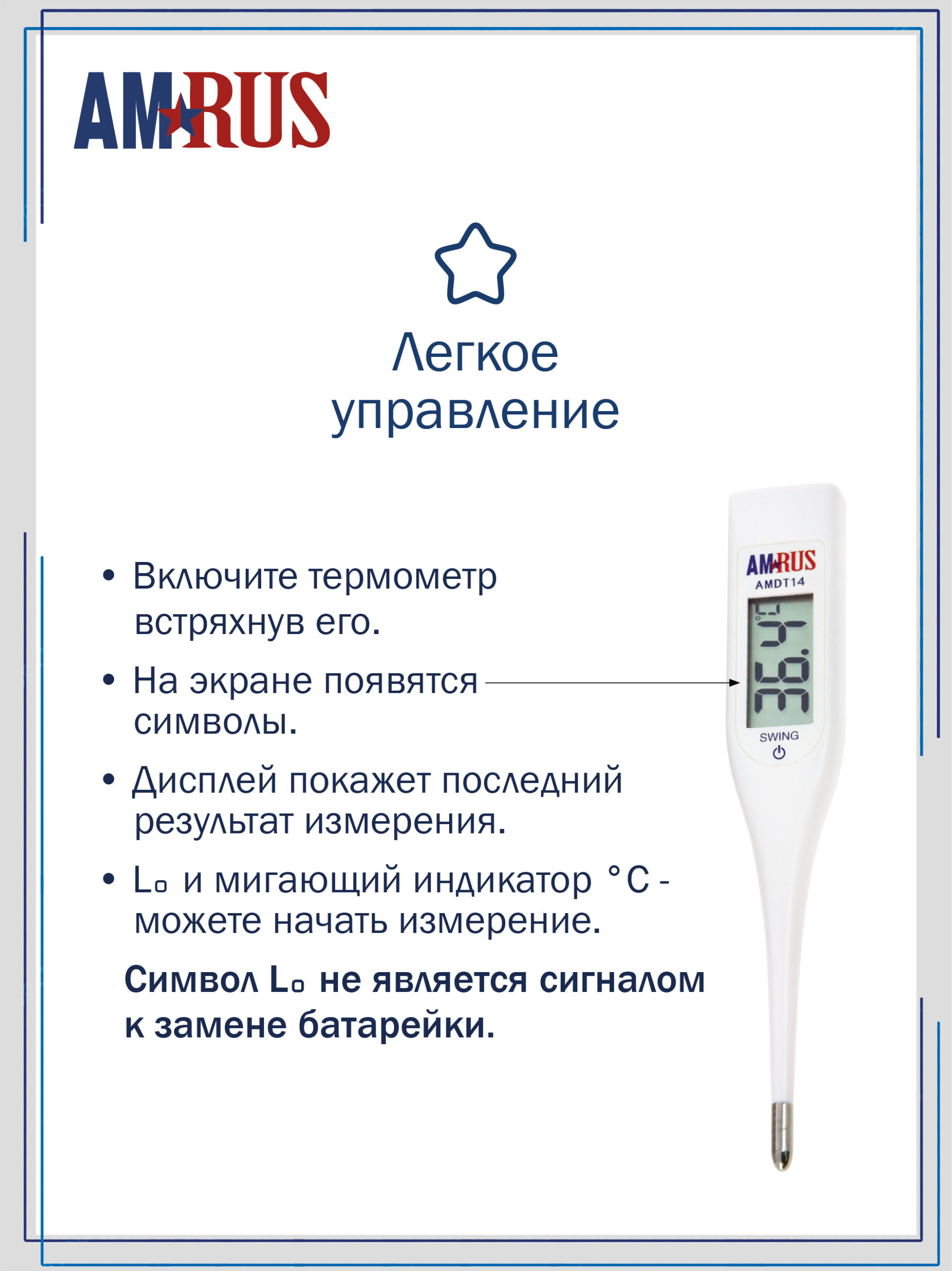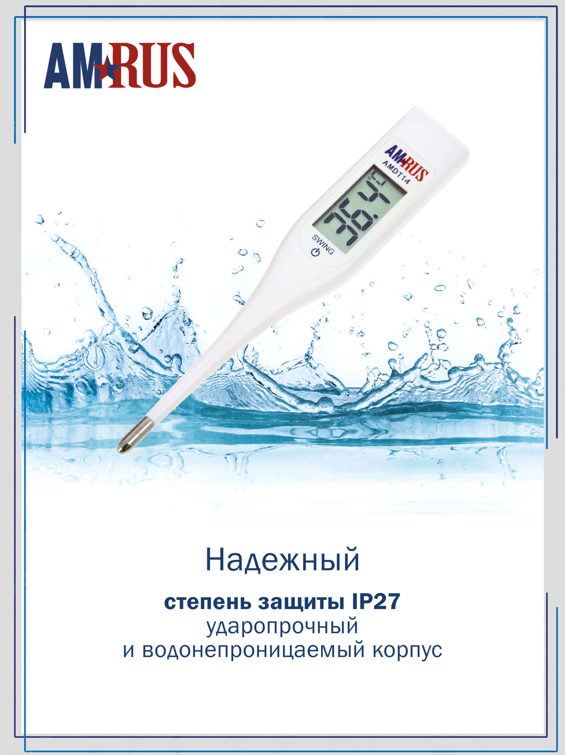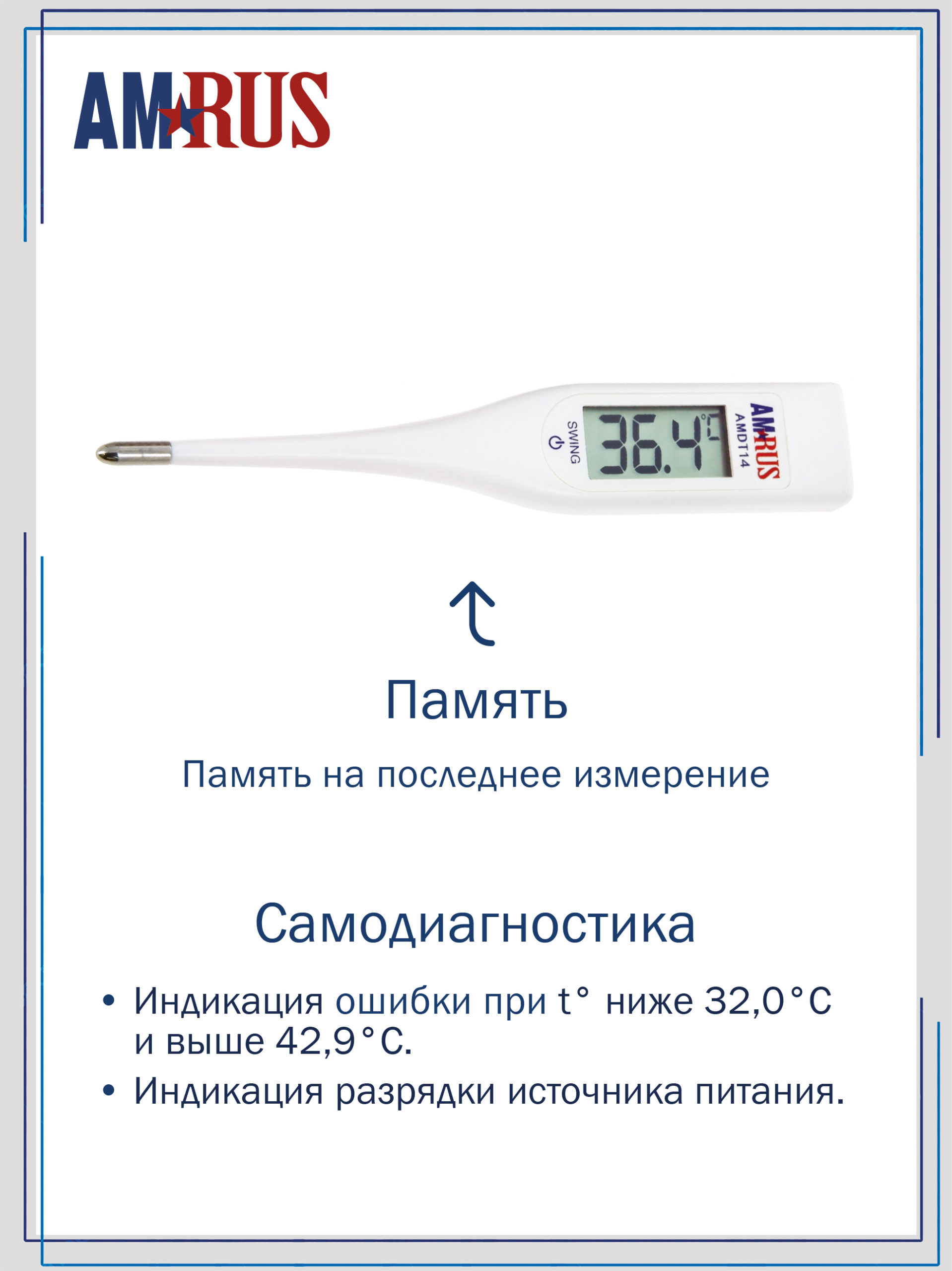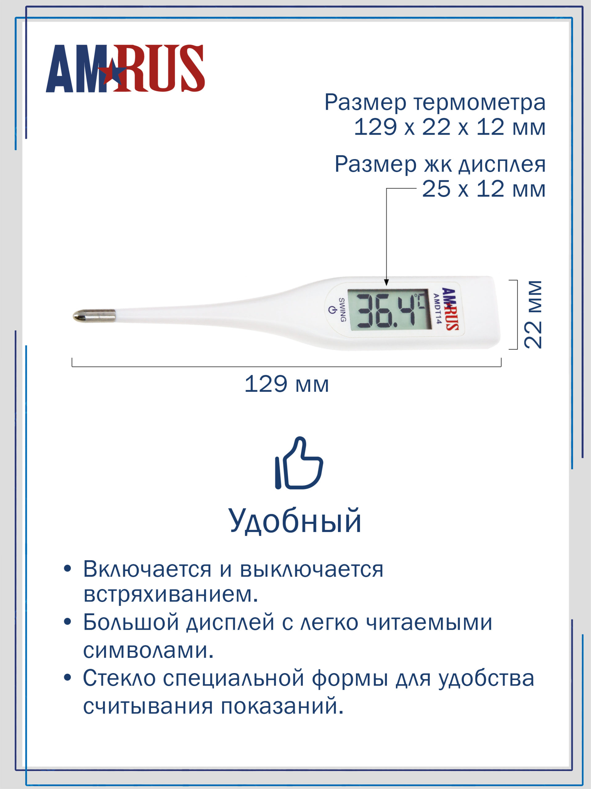 Термометр медицинский цифровой AMDT14 оснащен большим дисплеем с крупными легко читаемыми символами и стеклом специальной формы для удобства считывания показаний.