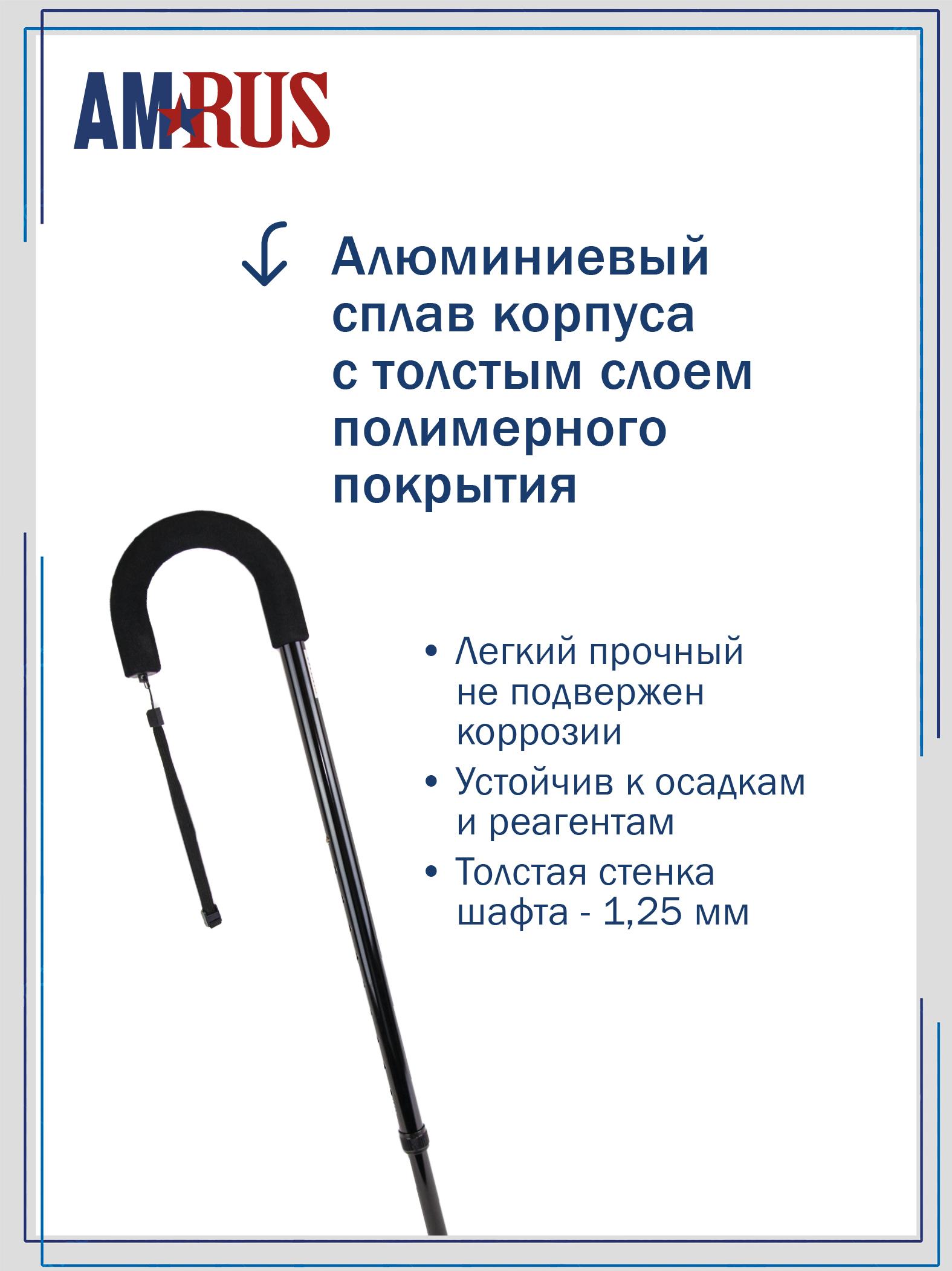 которую можно опереться 2-мя руками, что оптимально для людей с артритом и артрозом. Имеет телескопическую конструкцию с шагом 2,5 см, что позволяет регулировать высоту под рост пользователя.