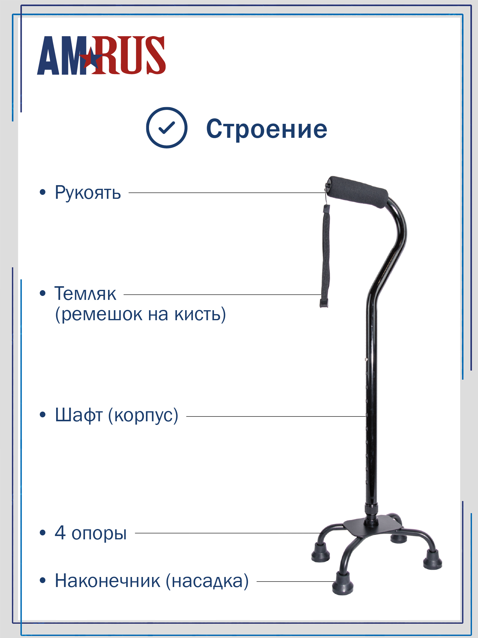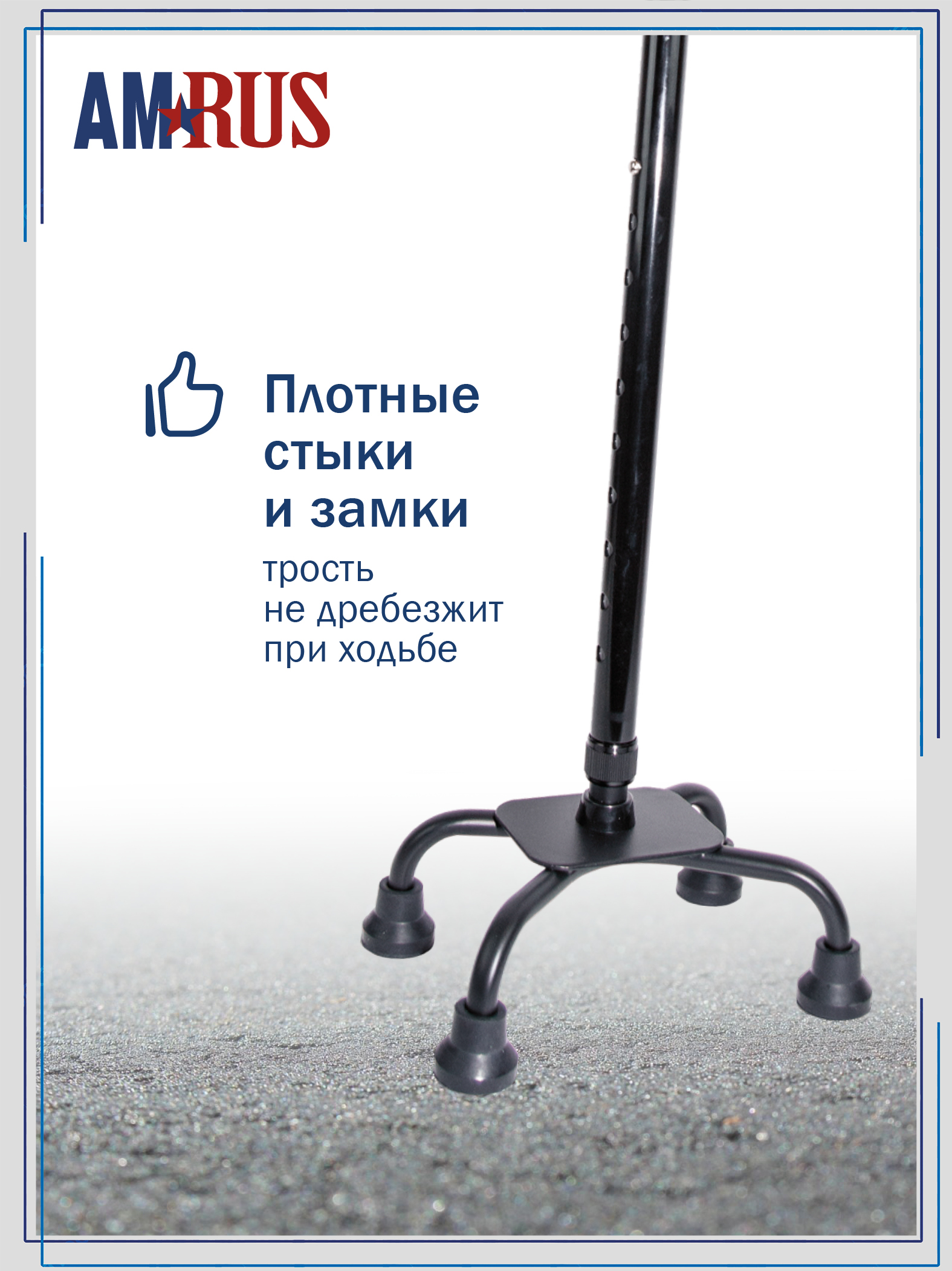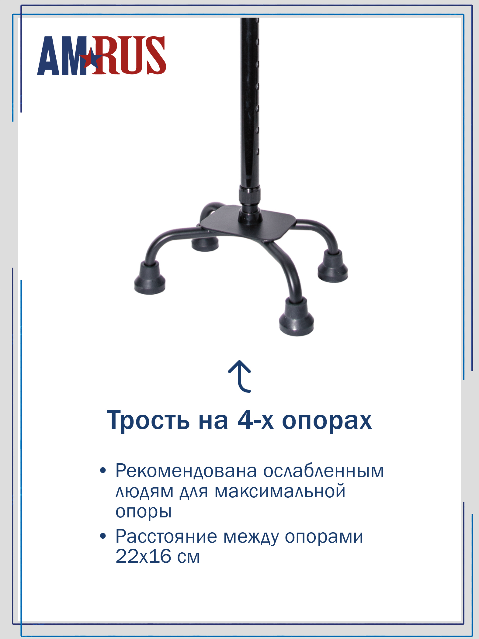 Трость обладает повышенной устойчивостью. Большая площадь опоры с четырьмя ножками помогает человеку с нарушениями координации движения ходить и стоять, опираясь на неё. Секция ножек асимметричная и поворачивается для использования под правую или левую руку. Рукоять с обмягчением и темляком (ремешок на кисть) обеспечивает удобное удержание трости при артрозах рук.