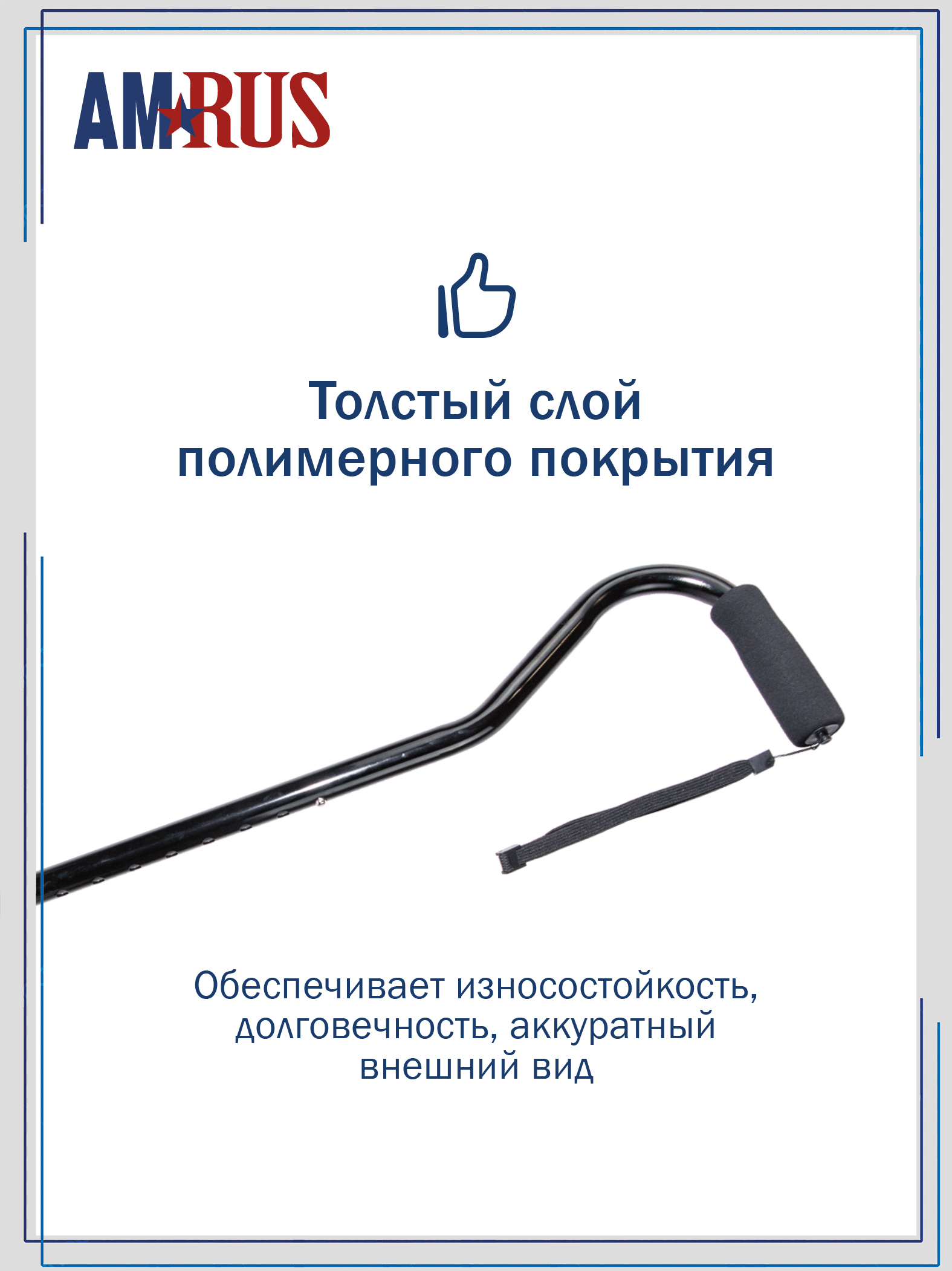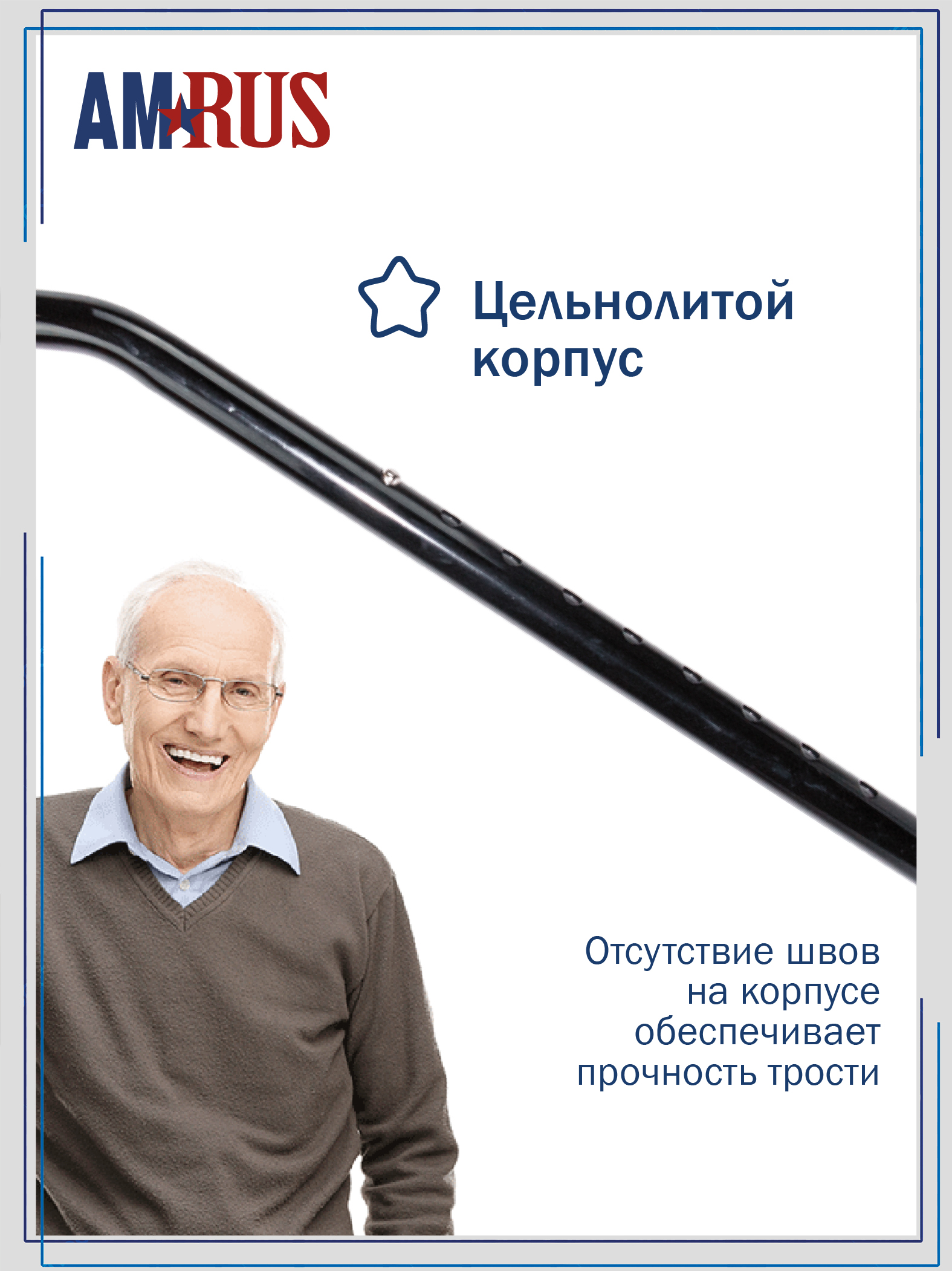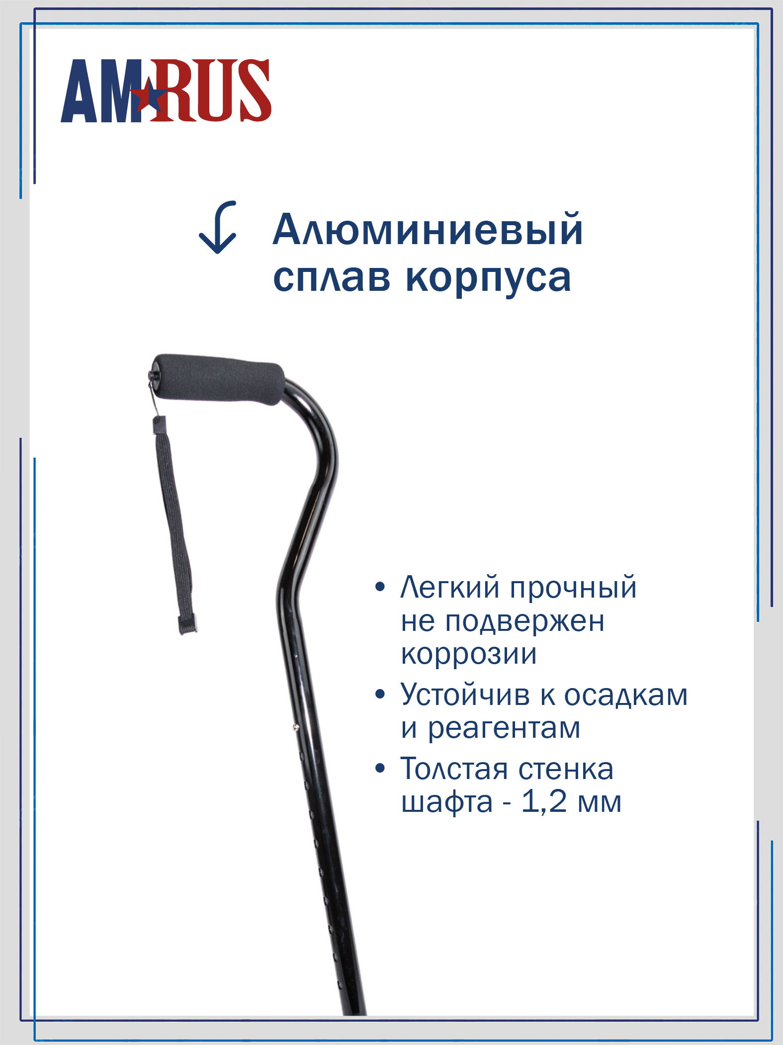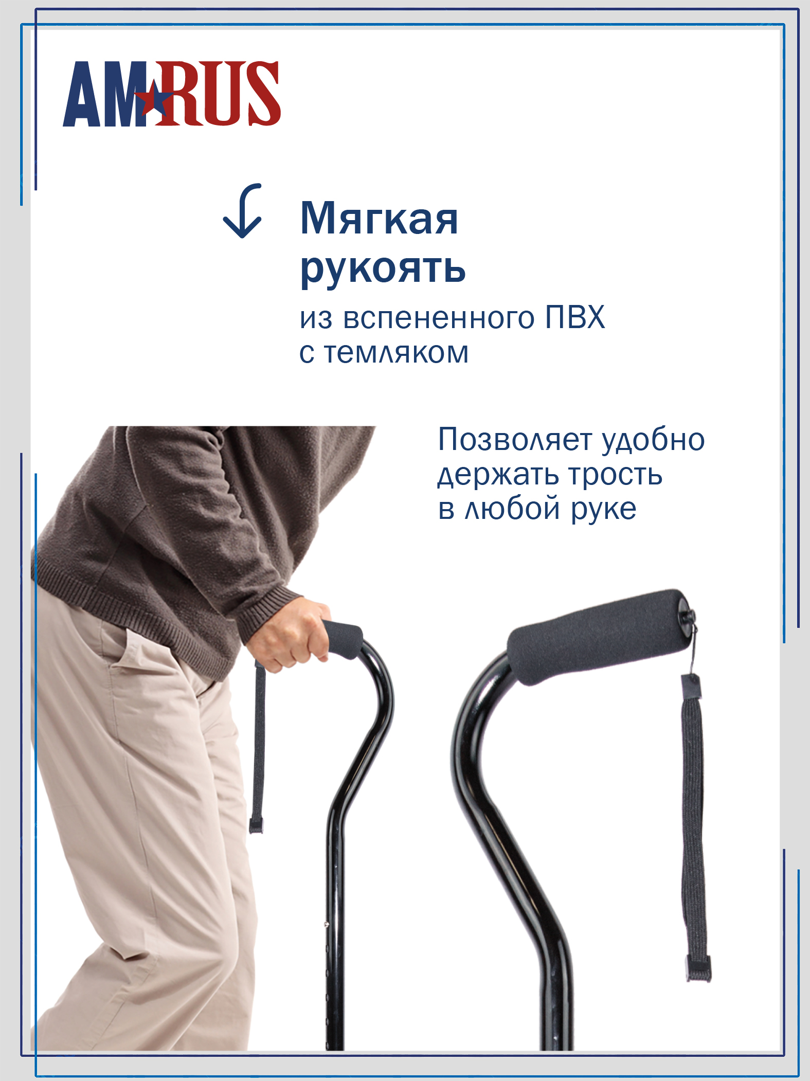 Трость обладает повышенной устойчивостью. Большая площадь опоры с четырьмя ножками помогает человеку с нарушениями координации движения ходить и стоять, опираясь на неё. Секция ножек асимметричная и поворачивается для использования под правую или левую руку. Рукоять с обмягчением и темляком (ремешок на кисть) обеспечивает удобное удержание трости при артрозах рук.