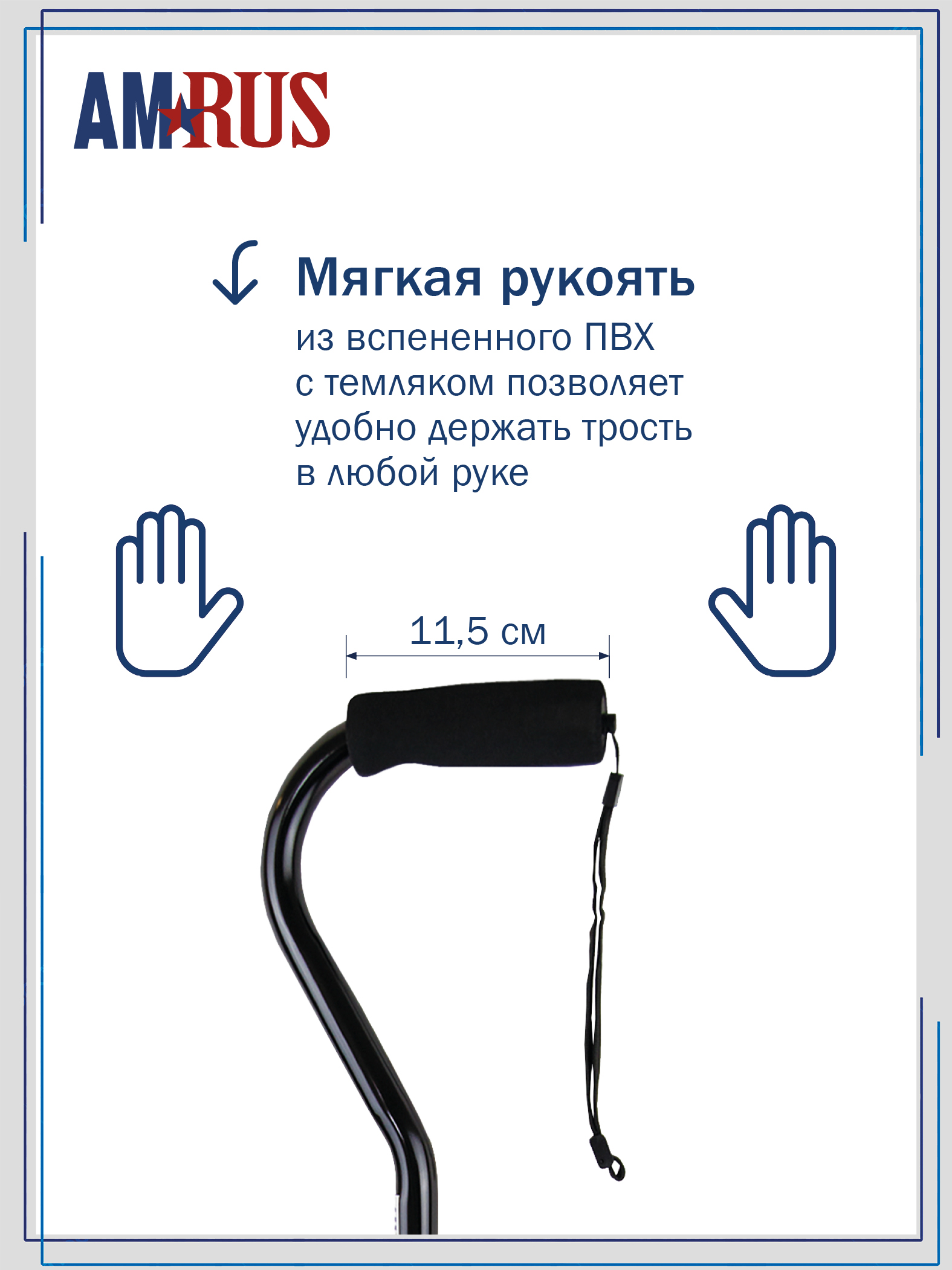 Трость с центрированной рукоятью лучше всего подходит людям с атаксией для улучшения координации. Трость облегчает самостоятельное передвижение и обеспечивает дополнительную устойчивость.  Рукоять с обмягчением, имеет темляк.