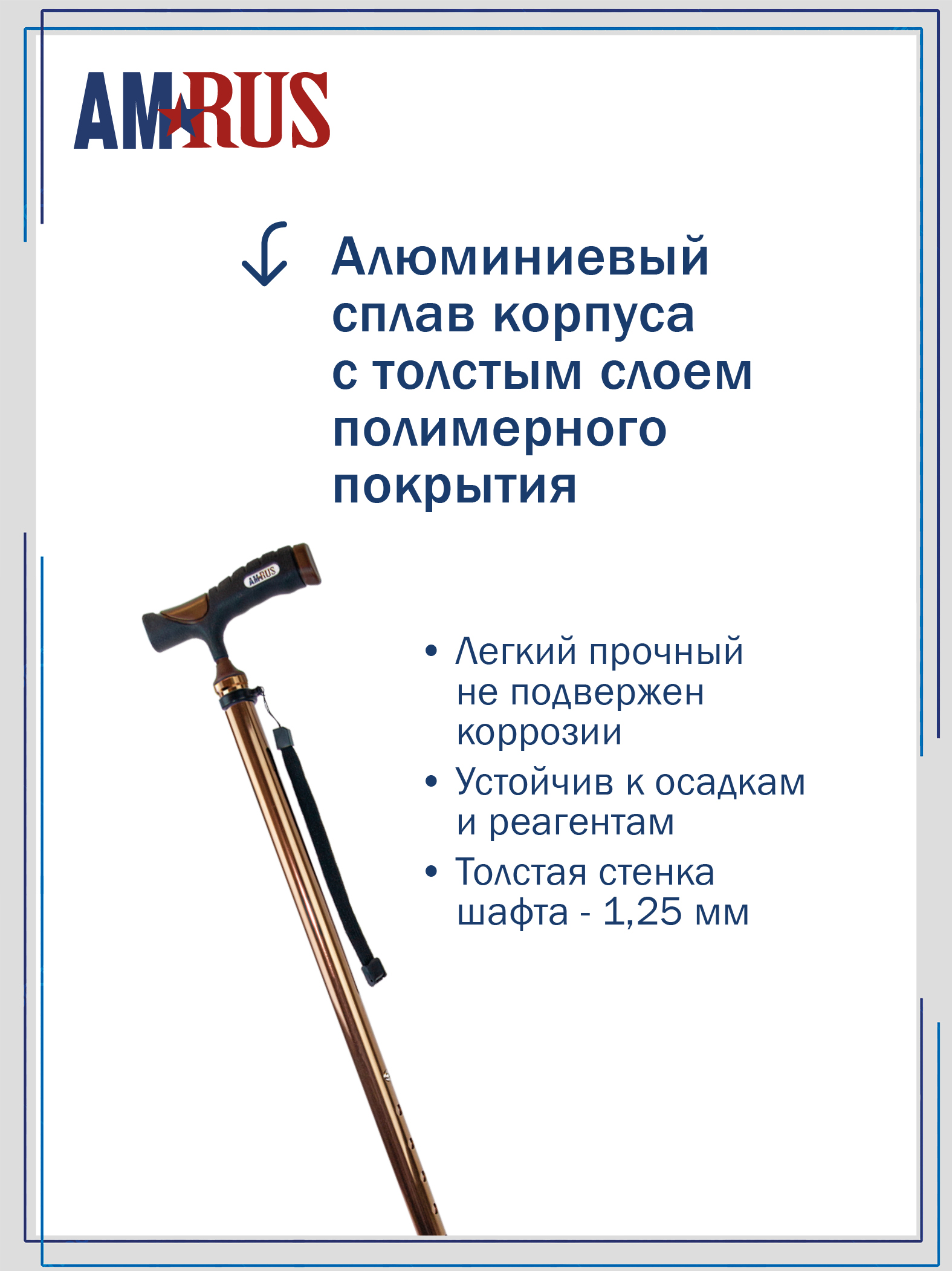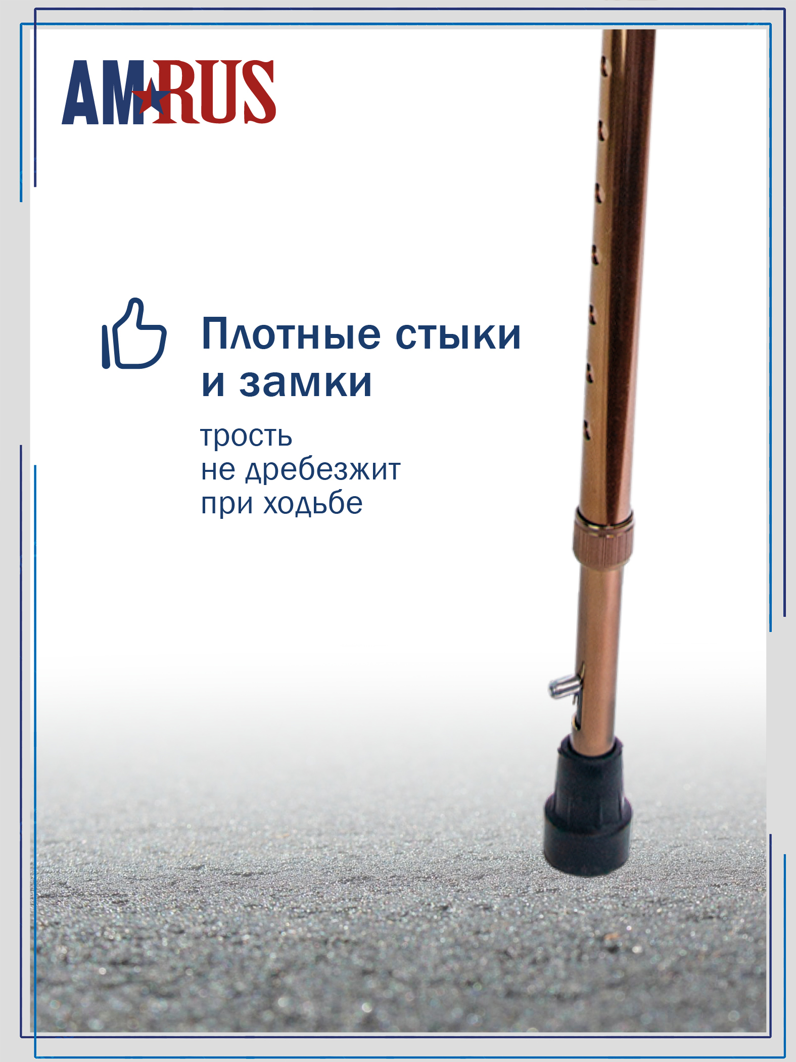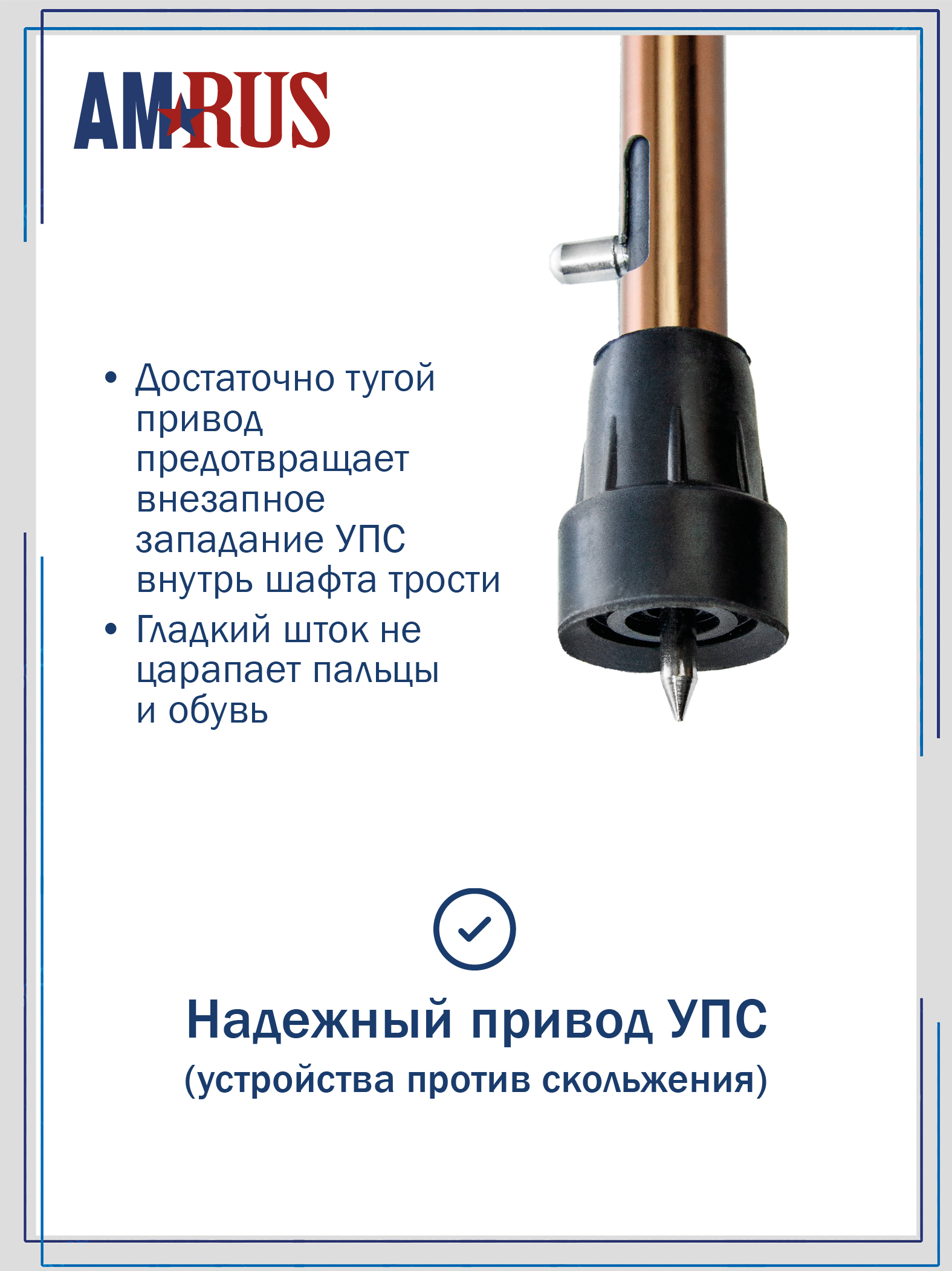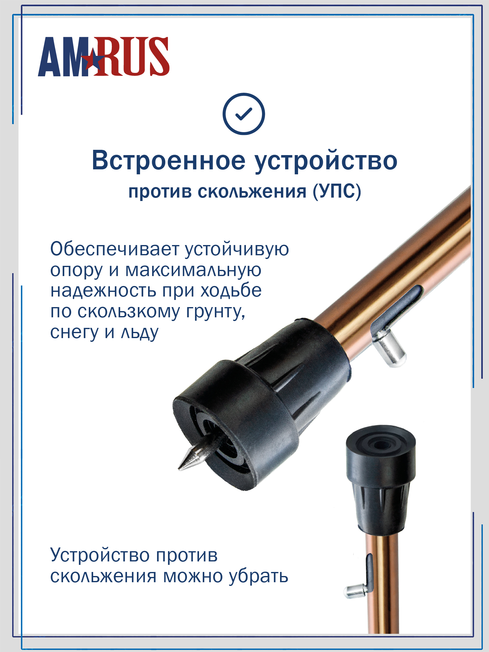 Специальное выдвижное приспособление против скольжения (УПС) — прочный острый штырь, встроенный в шафт — обеспечивает надёжное сцепление со скользкой поверхностью. Замки выполнены из прочного алюминиевого сплава, а плотные стыки со специальной прокладкой предотвращают стук и дребезжание трости. При необходимости используйте сменную насадку АМСТ-81.