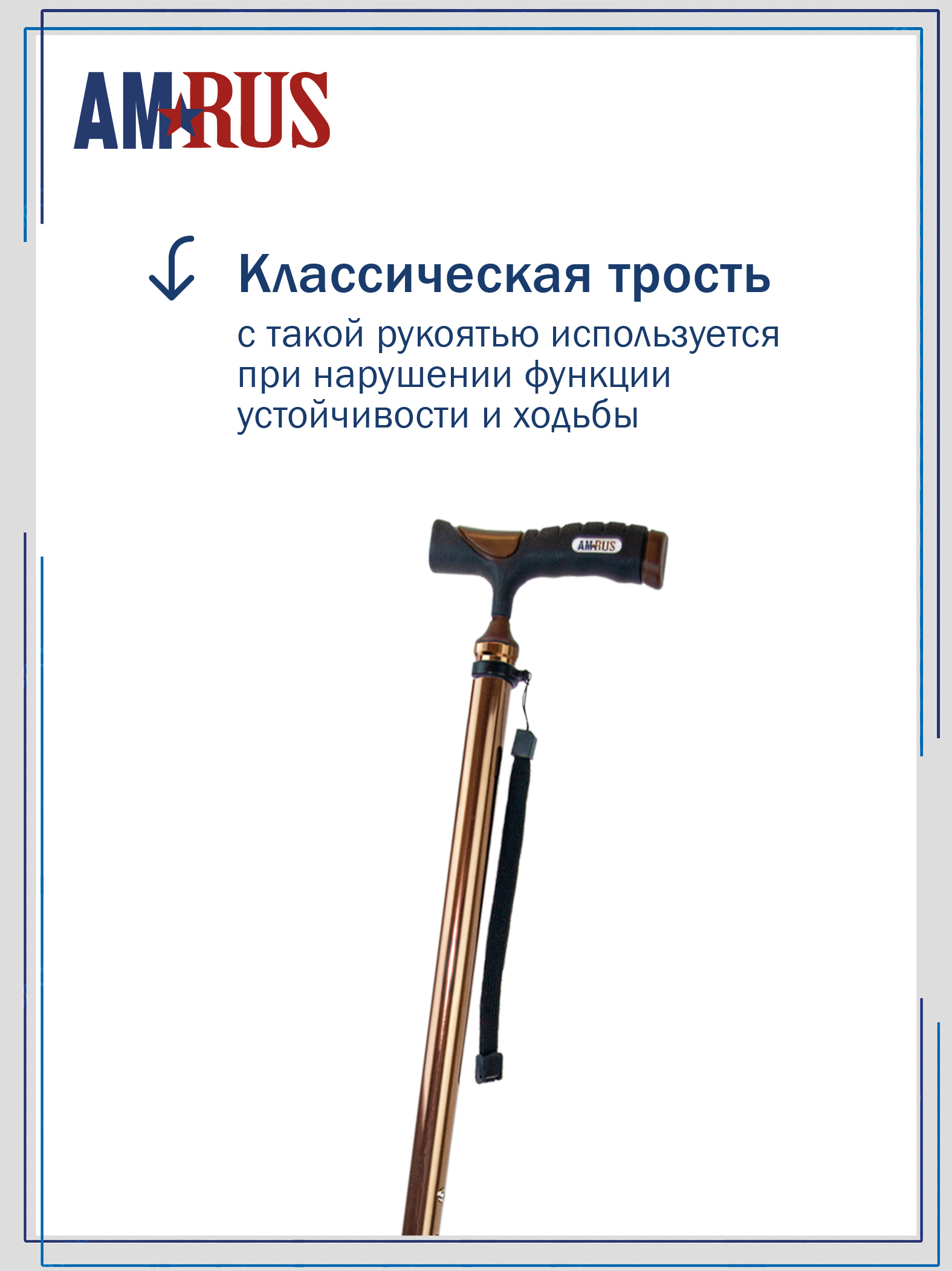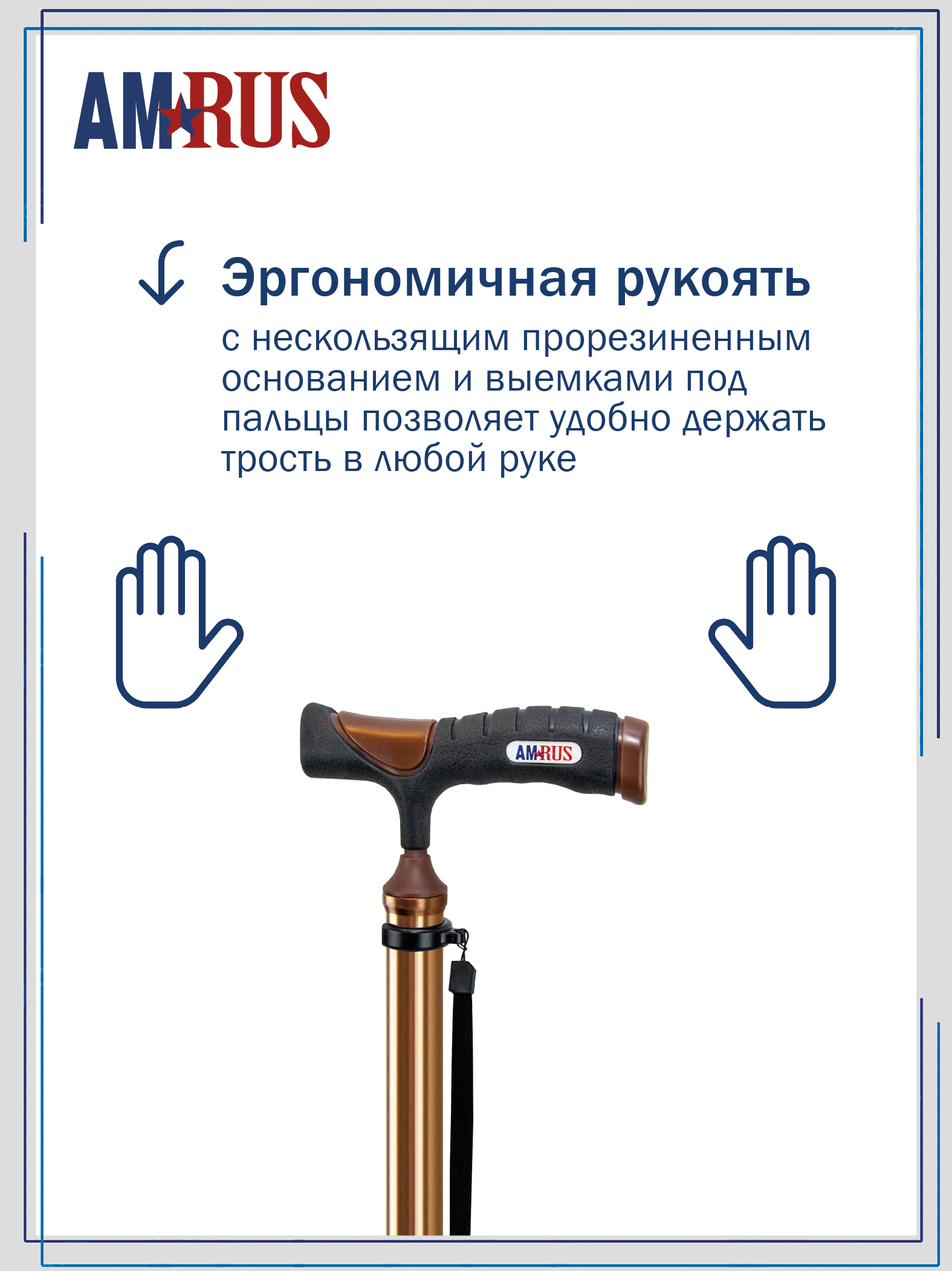 Трость оснащена встроенным устройством против скольжения (УПС) и универсальной прорезиненной рукоятью, подходящей как для правой, так и для левой руки. Эргономичная рукоять с выемками под пальцы приятна на ощупь и обеспечивает надёжный, удобный хват. Изящное узкое соединение рукояти с шафтом добавляет комфорта при удержании трости двумя пальцами. Трость снабжена темляком с регулируемой пряжкой, позволяющей подогнать длину ремешка под размер запястья.