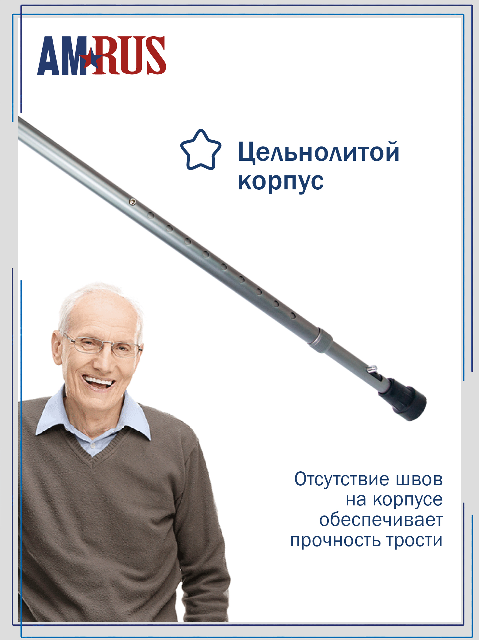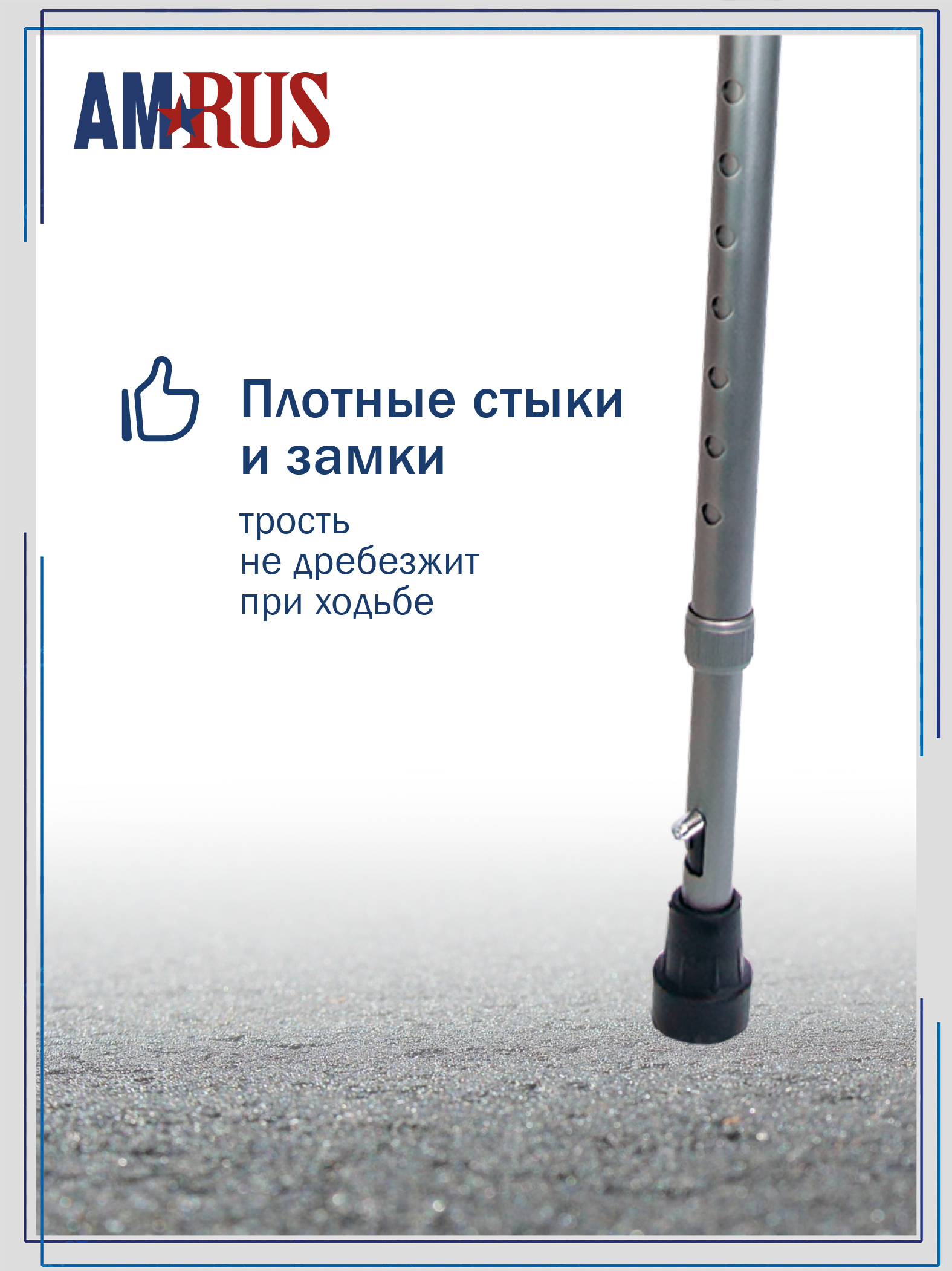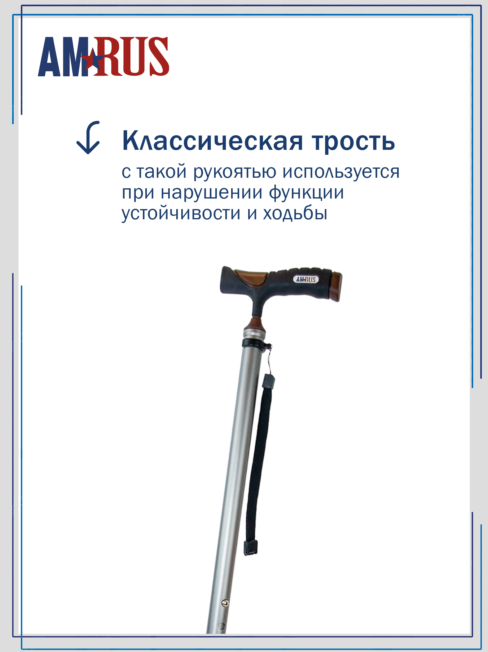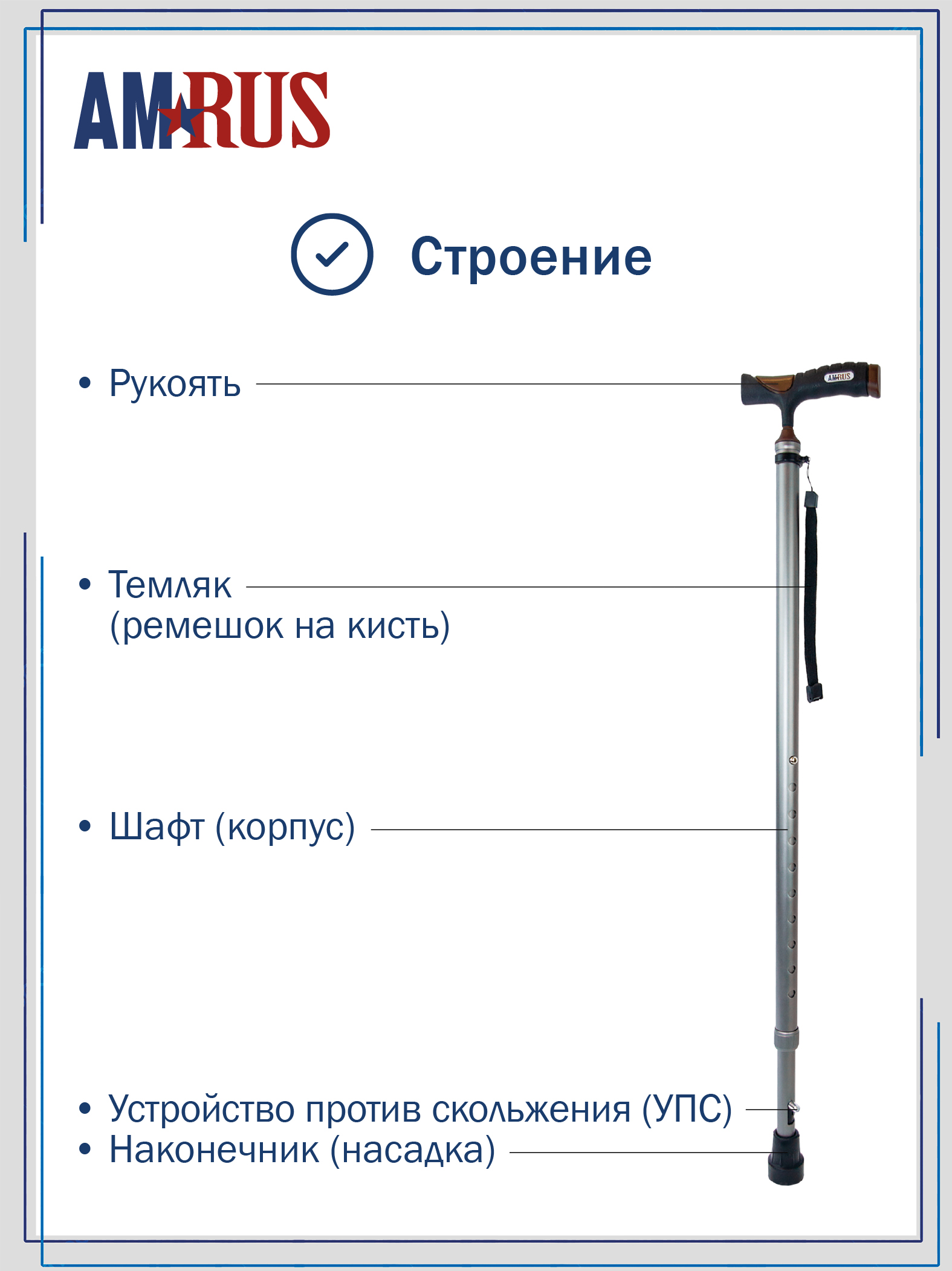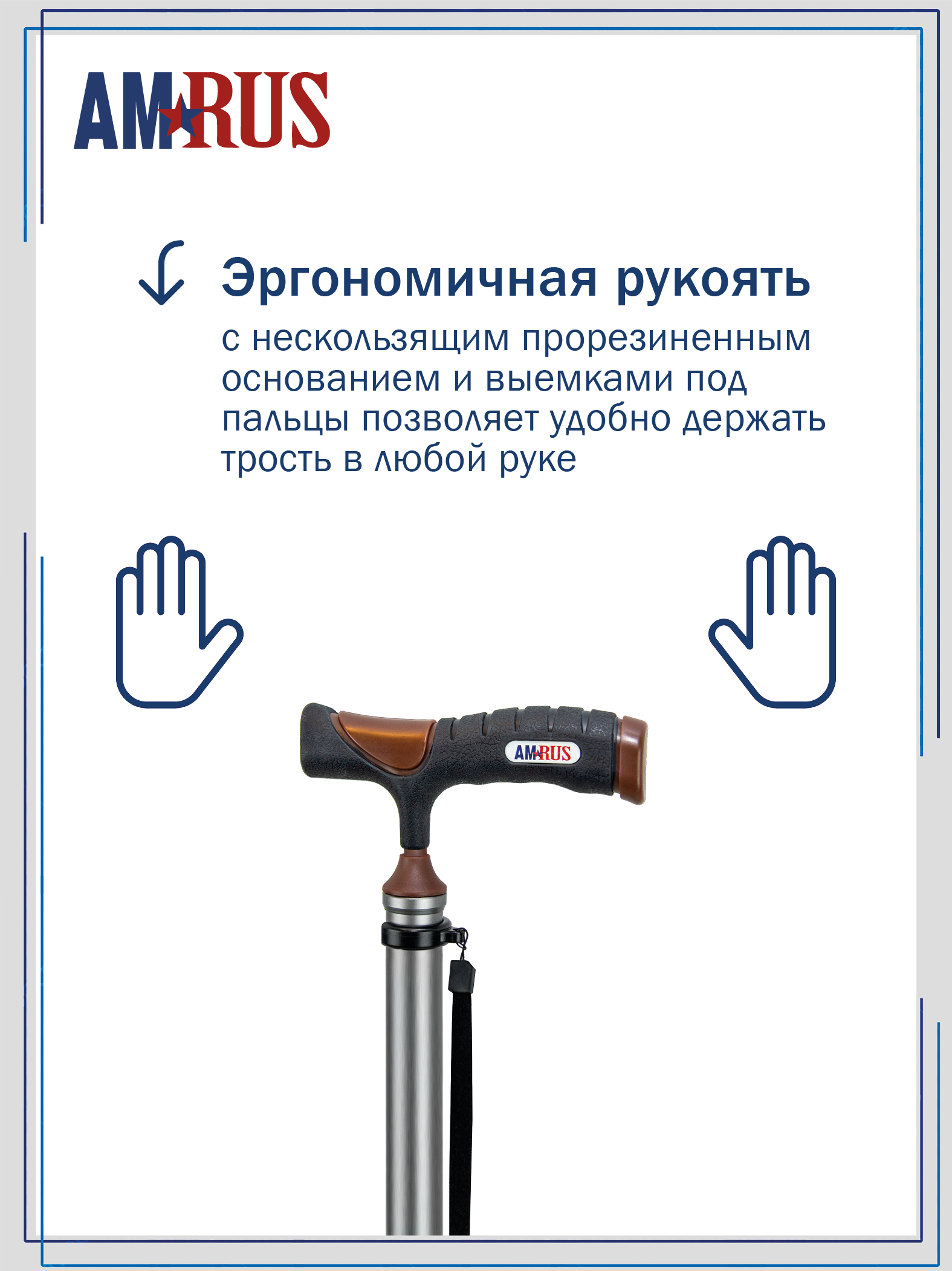 Трость со встроенным устройством против скольжения (УПС) и универсальной прорезиненной рукоятью под правую и левую руку с выемками под пальцы. Нескользящая приятная на ощупь рукоять обеспечивает удобный хват. Изящное узкое соединение рукояти с шафтом обеспечивает дополнительный комфорт при удержании рукояти двумя пальцами.  Трость снабжена темляком (ремешок на кисть), который имеет пряжку для регулировки длины под размер запястья.