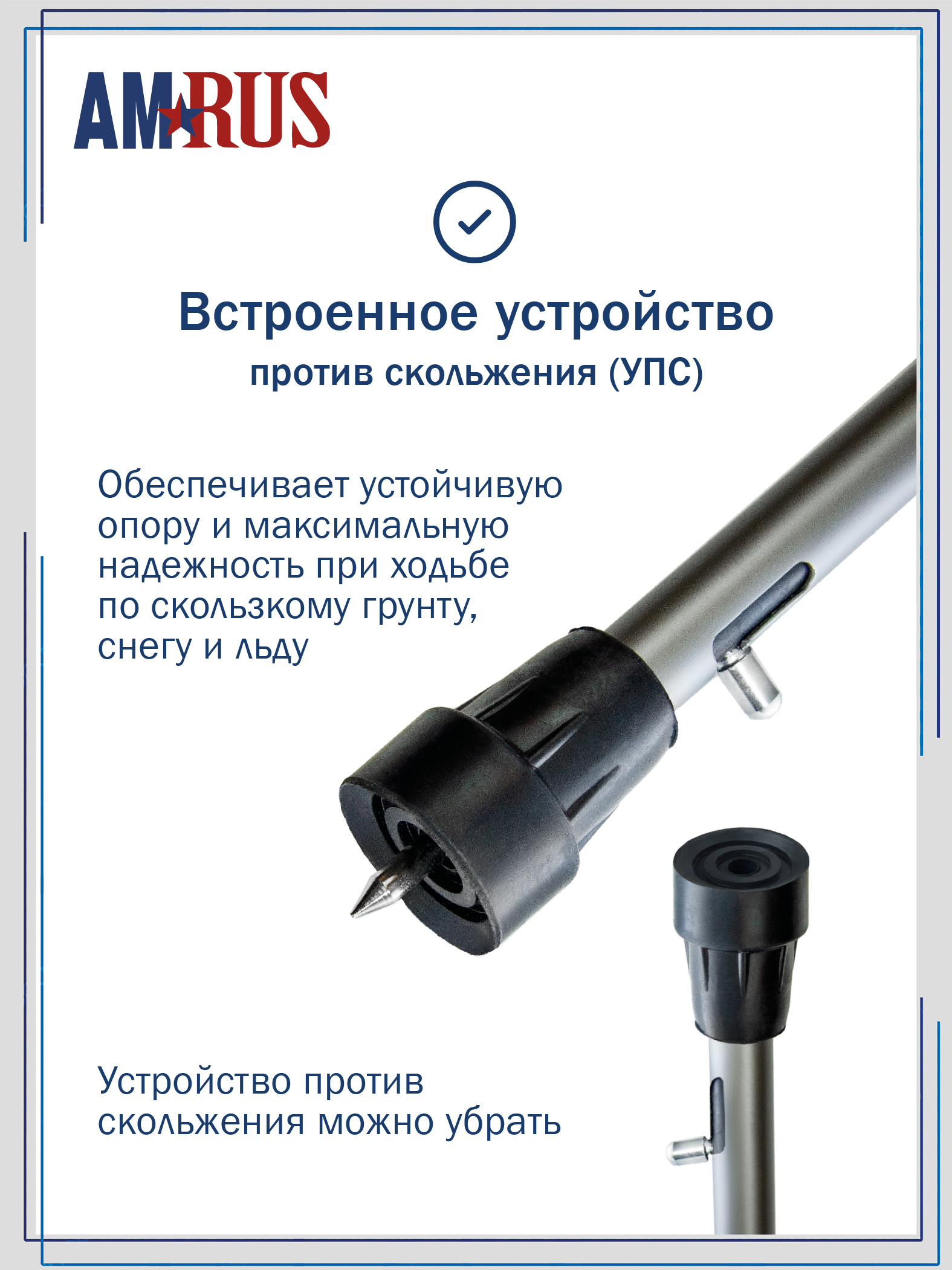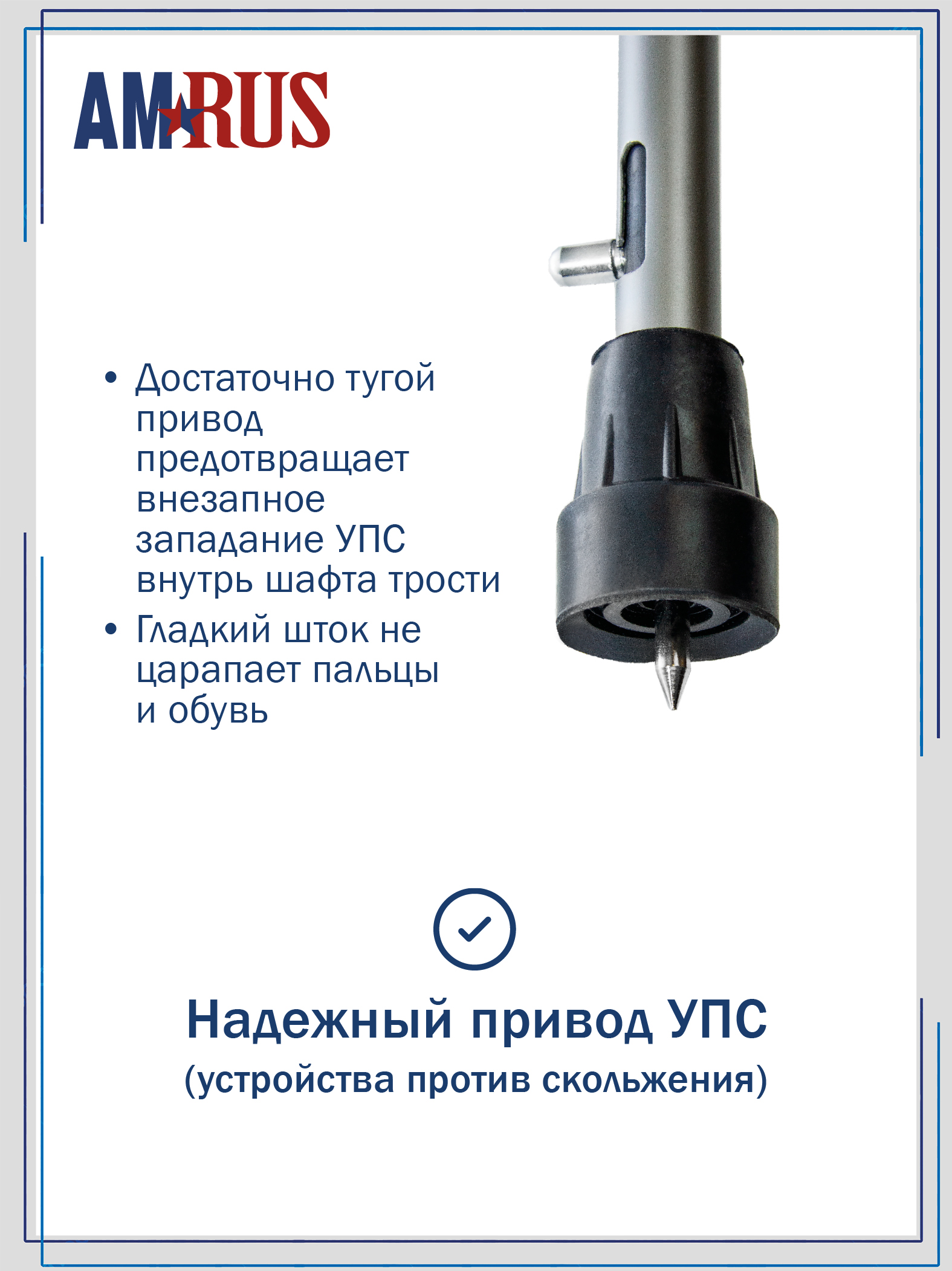 Специальное выдвижное приспособление против скольжения (УПС) в виде прочного, острого штыря, встроено в шафт. УПС создает надежное сцепление со скользкой поверхностью. Замки выполнены из прочного алюминиевого сплава. Стыки за счет специальной прокладки плотные, поэтому трость не стучит и не дребезжит.