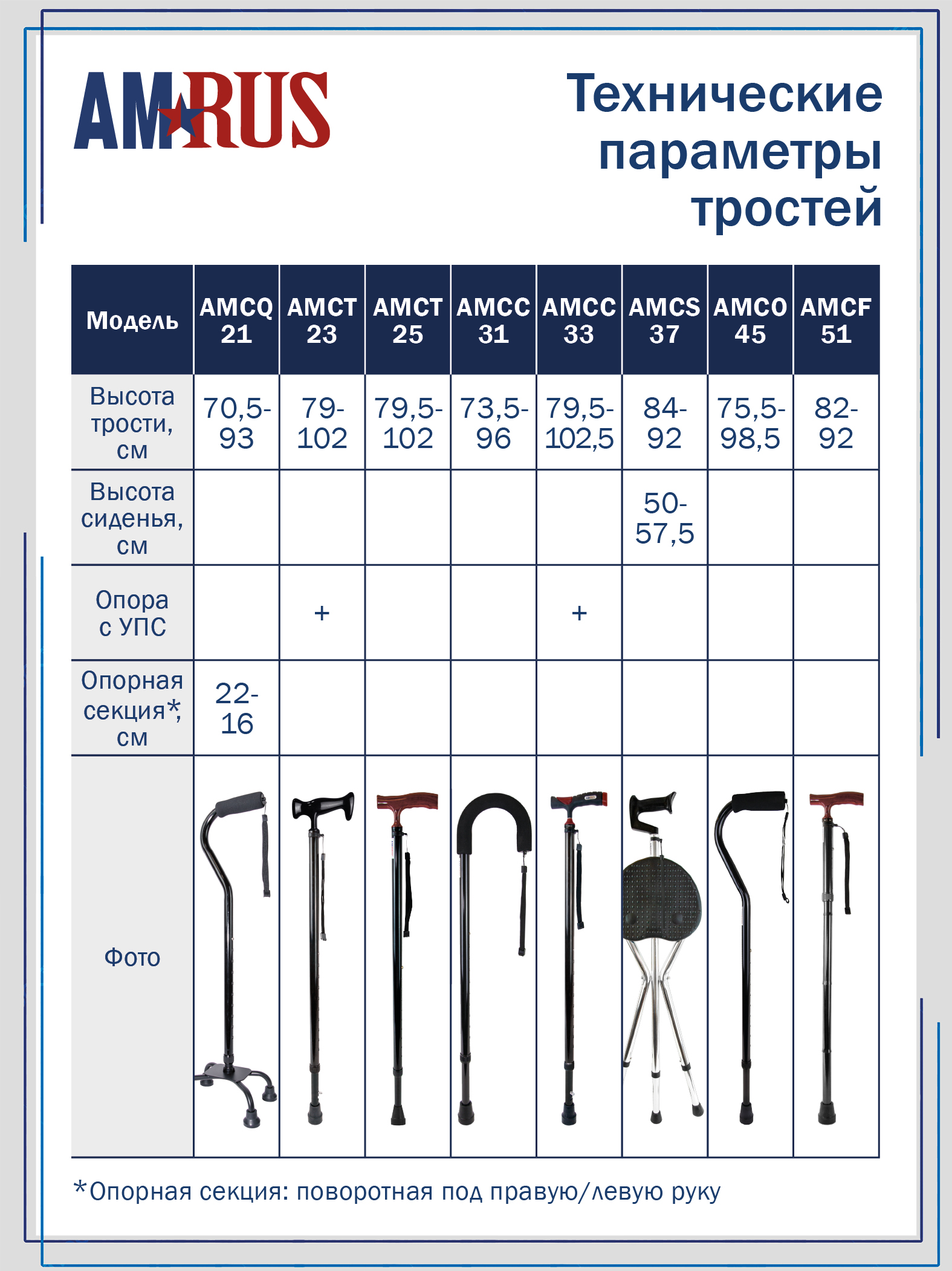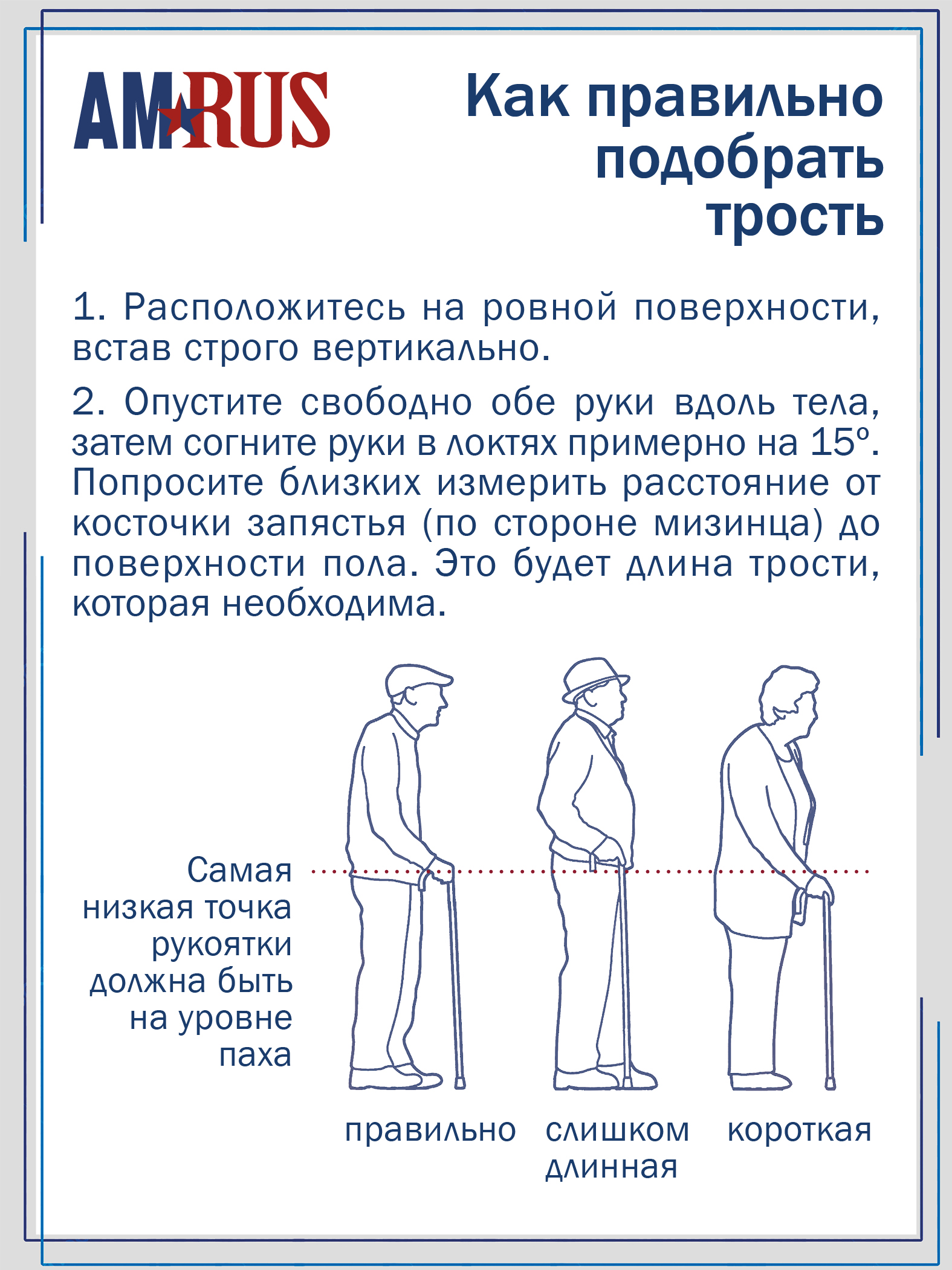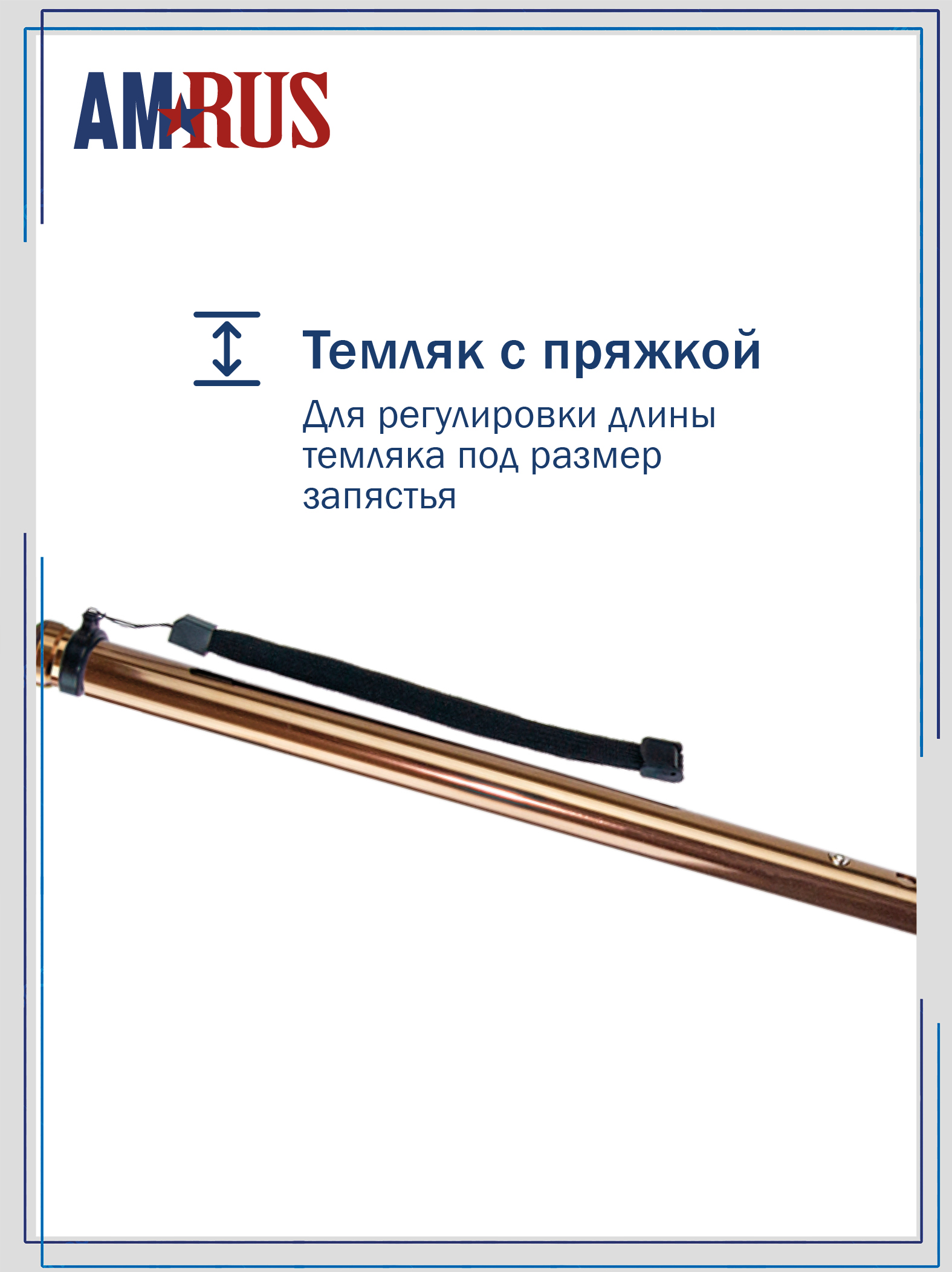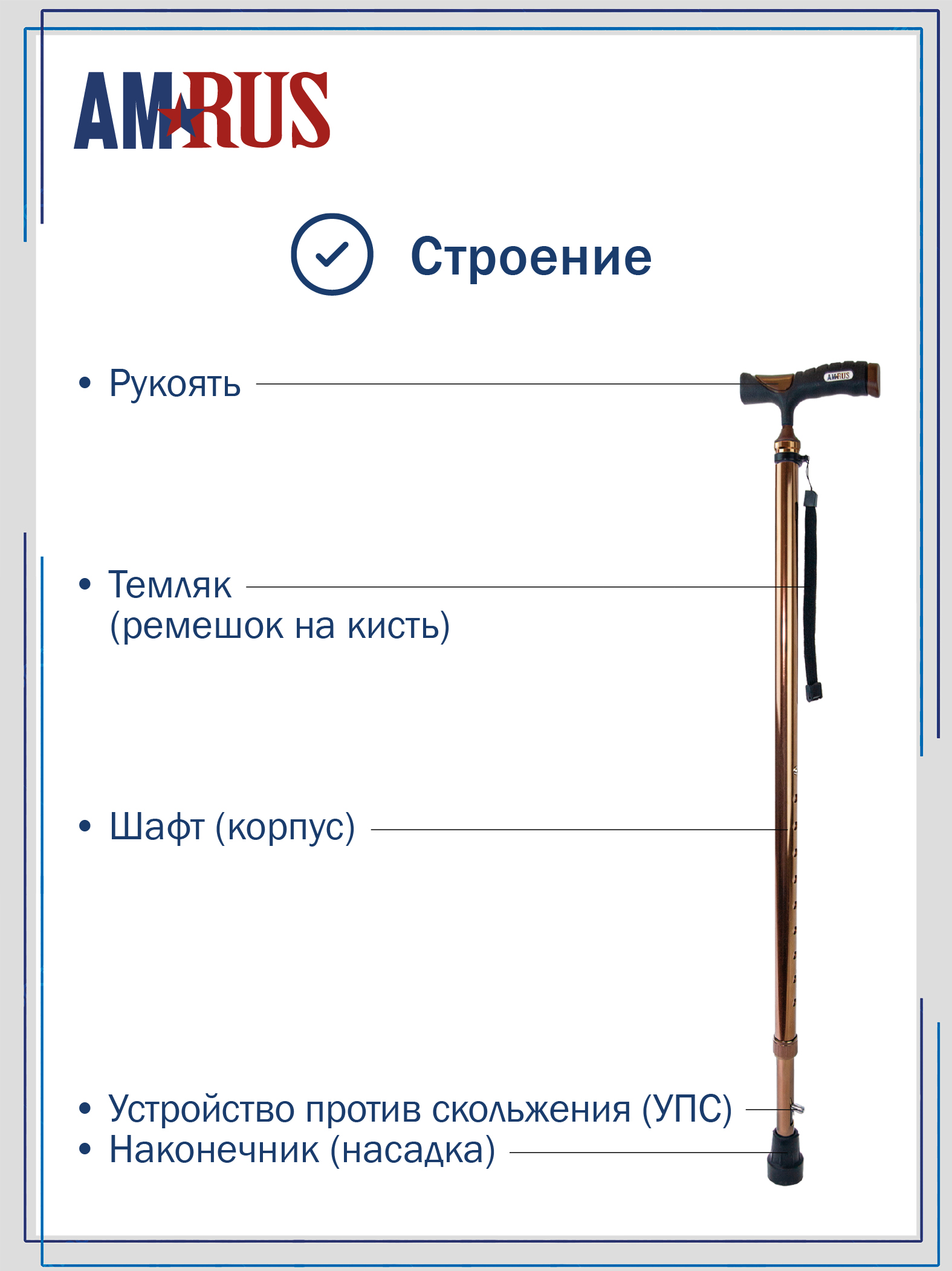 Трость со встроенным устройством против скольжения (УПС) и универсальной прорезиненной рукоятью под правую и левую руку с выемками под пальцы. Нескользящая приятная на ощупь рукоять обеспечивает удобный хват. Изящное узкое соединение рукояти с шафтом обеспечивает дополнительный комфорт при удержании рукояти двумя пальцами. Трость снабжена темляком (ремешок на кисть), который имеет пряжку для регулировки длины под размер запястья.