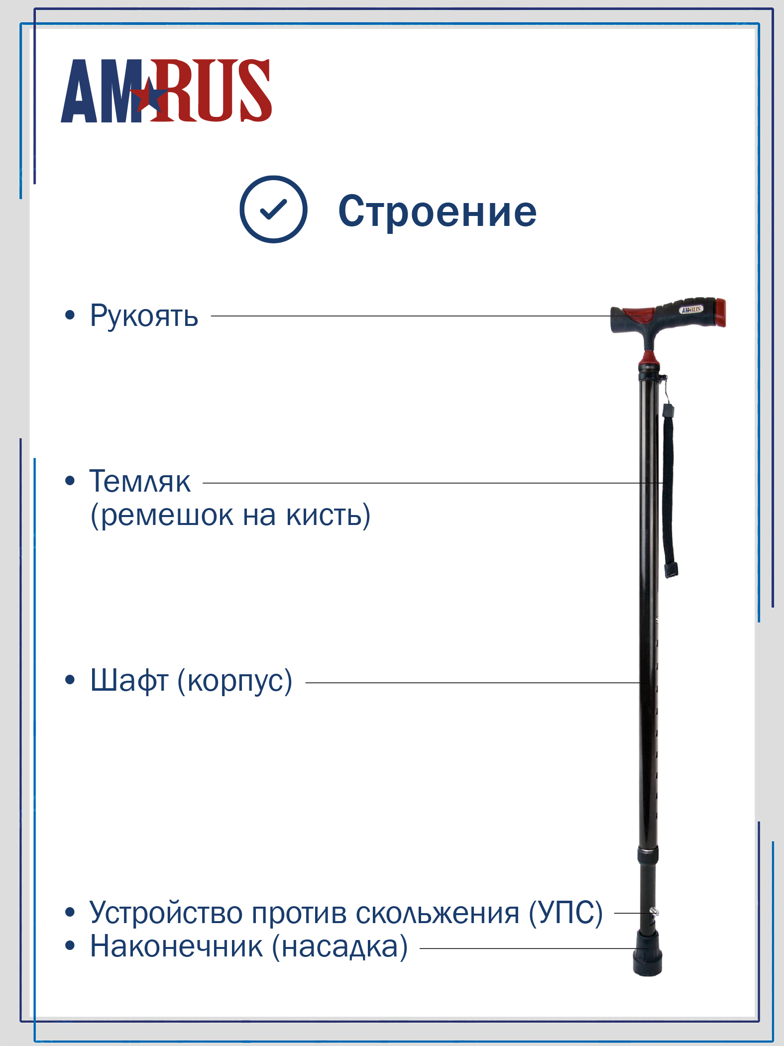 Специальное выдвижное приспособление против скольжения (УПС) — прочный острый штырь, встроенный в шафт — обеспечивает надёжное сцепление со скользкой поверхностью. Замки выполнены из прочного алюминиевого сплава, а плотные стыки со специальной прокладкой предотвращают стук и дребезжание трости. При необходимости используйте сменную насадку АМСТ-81.