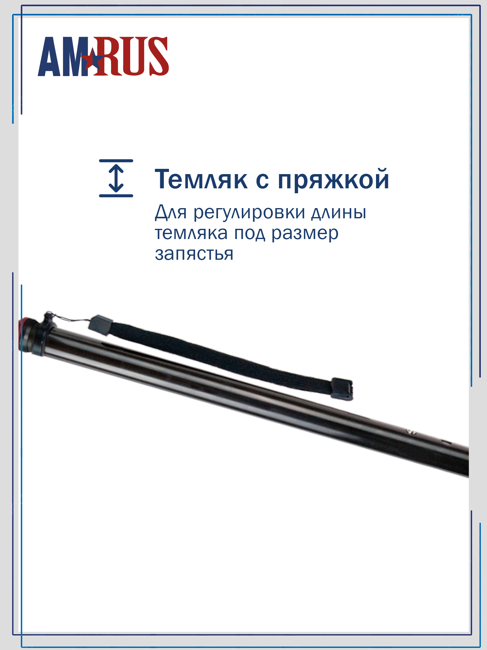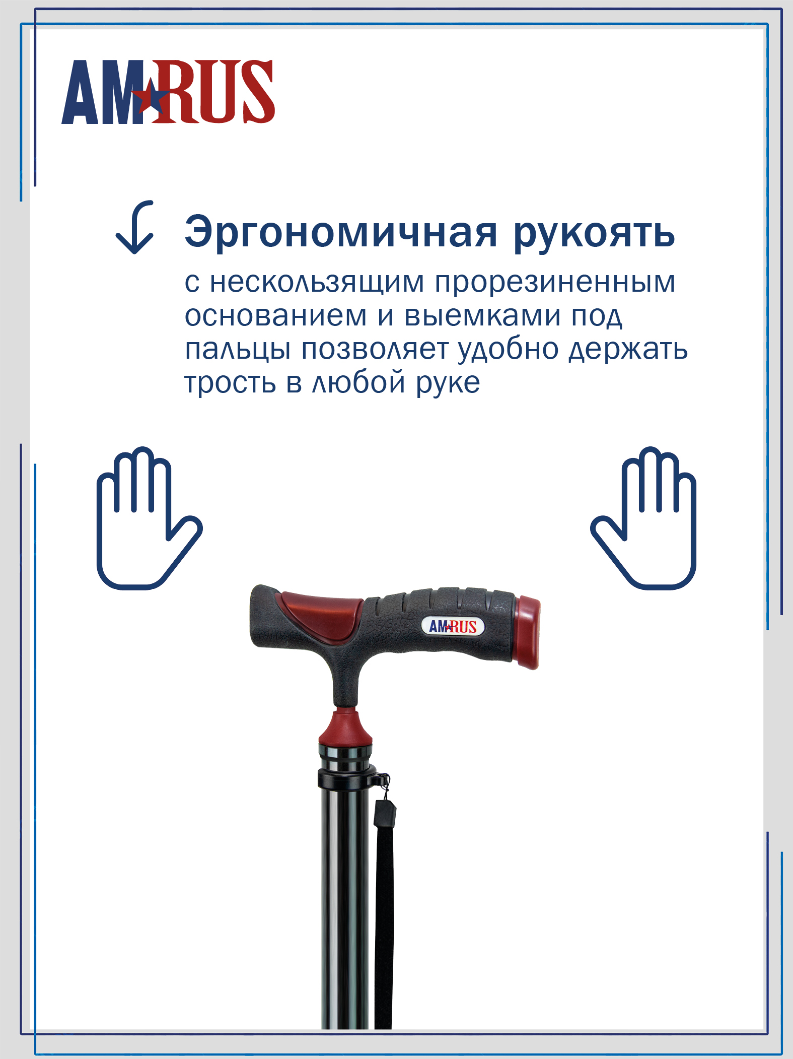 Трость оснащена встроенным устройством против скольжения (УПС) и универсальной прорезиненной рукоятью, подходящей как для правой, так и для левой руки. Эргономичная рукоять с выемками под пальцы приятна на ощупь и обеспечивает надёжный, удобный хват. Изящное узкое соединение рукояти с шафтом добавляет комфорта при удержании трости двумя пальцами. Трость снабжена темляком с регулируемой пряжкой, позволяющей подогнать длину ремешка под размер запястья.