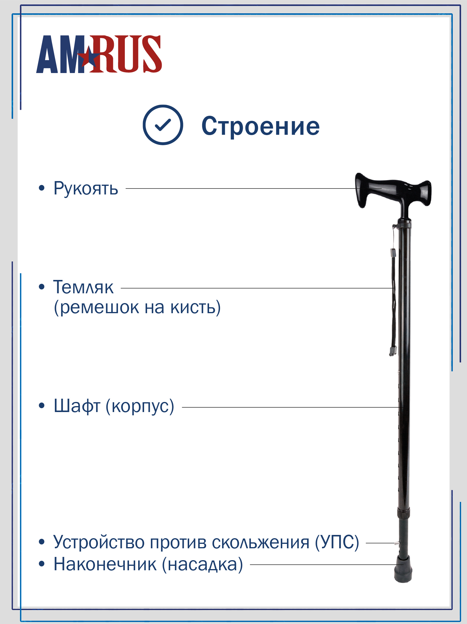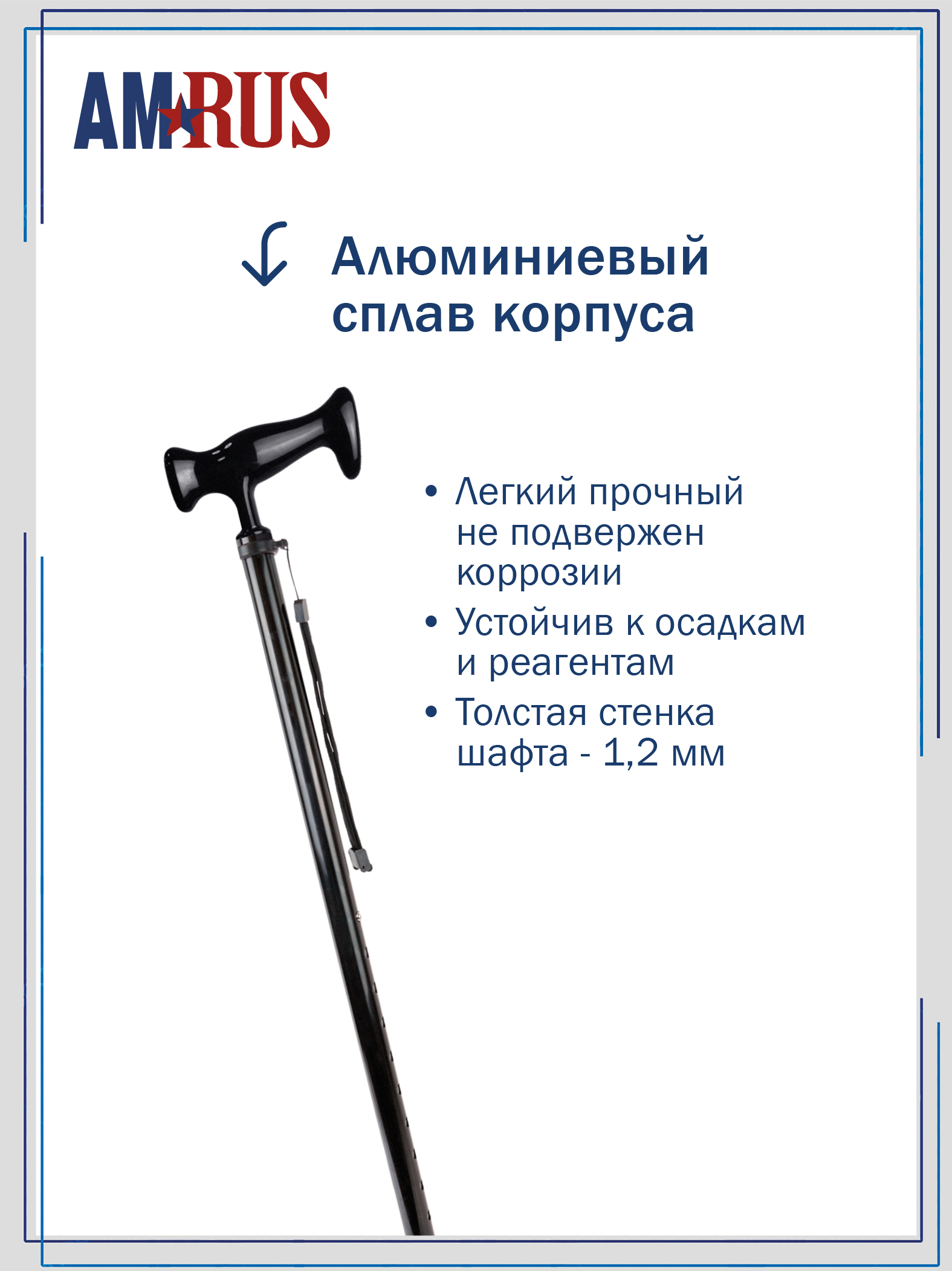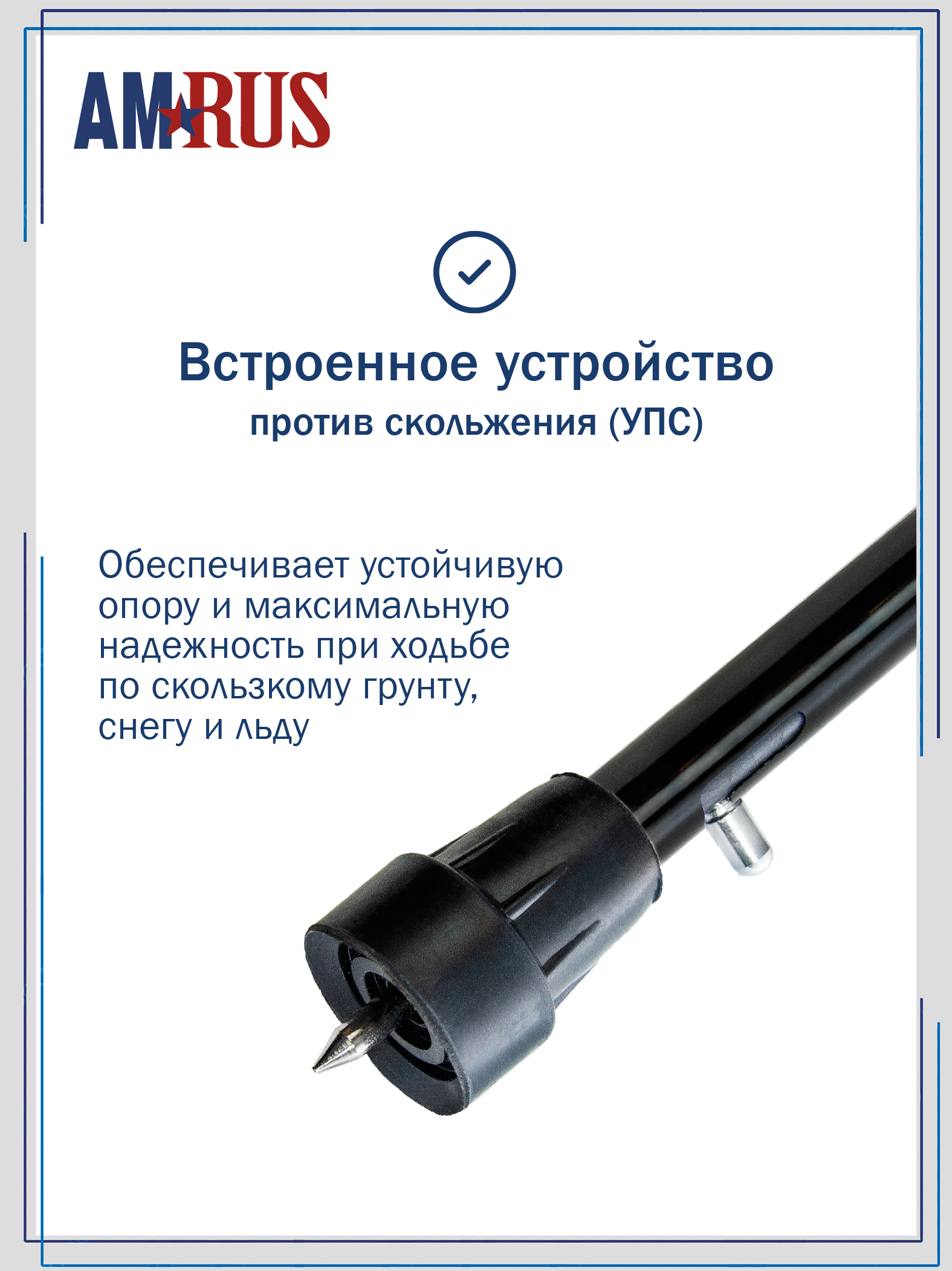 Трость со встроенным устройством противоскольжения (УПС), с темляком (ремешком на кисть) и катафотом