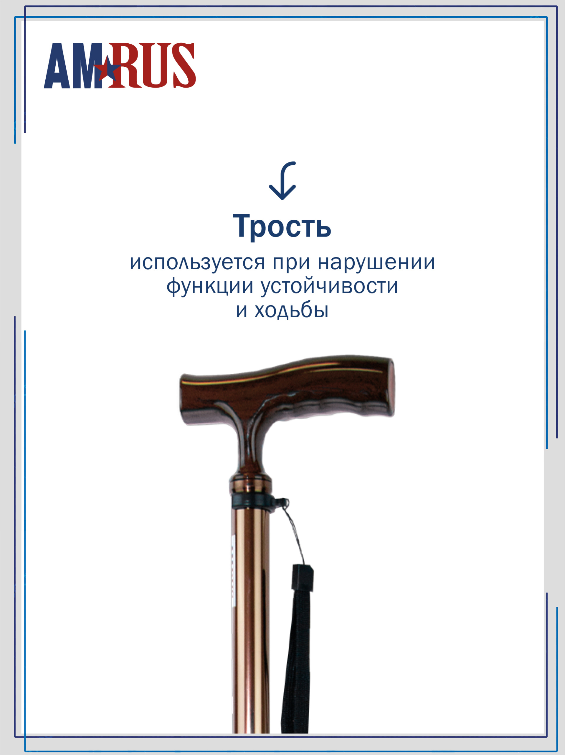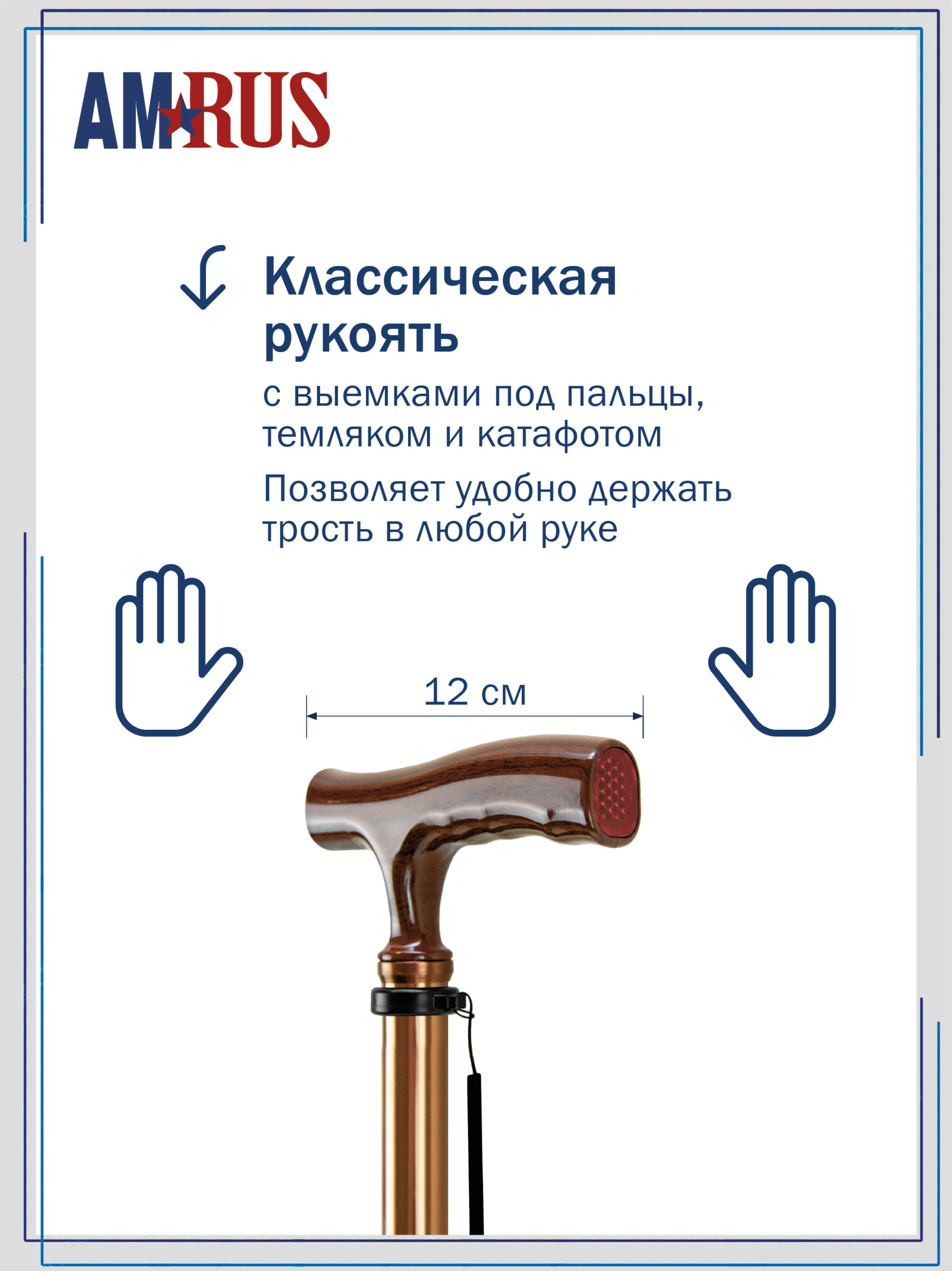 Трость предназначена для облегчения самостоятельного передвижения, обеспечивает дополнительную устойчивость и снижает нагрузку на поврежденную сторону у людей с различными заболеваниями опорно-двигательной системы и различными неврологическими расстройствами. Трость с классической рукоятью с выемками под пальцы из неабсорбирующего материала, не натирает и не скользит в руке. Рукоять снабжена катафотом (светоотражателем). Изящное узкое соединение рукояти с шафтом обеспечивает дополнительный комфорт при удержании рукояти двумя пальцами.   Трость с такой рукоятью используется при нарушении функции устойчивости и ходьбы. На рукояти трости есть темляк (ремешок на кисть). Темляк снабжен пряжкой для регулировки длины под окружность кисти. Съемная насадка из износостойкой резины.
