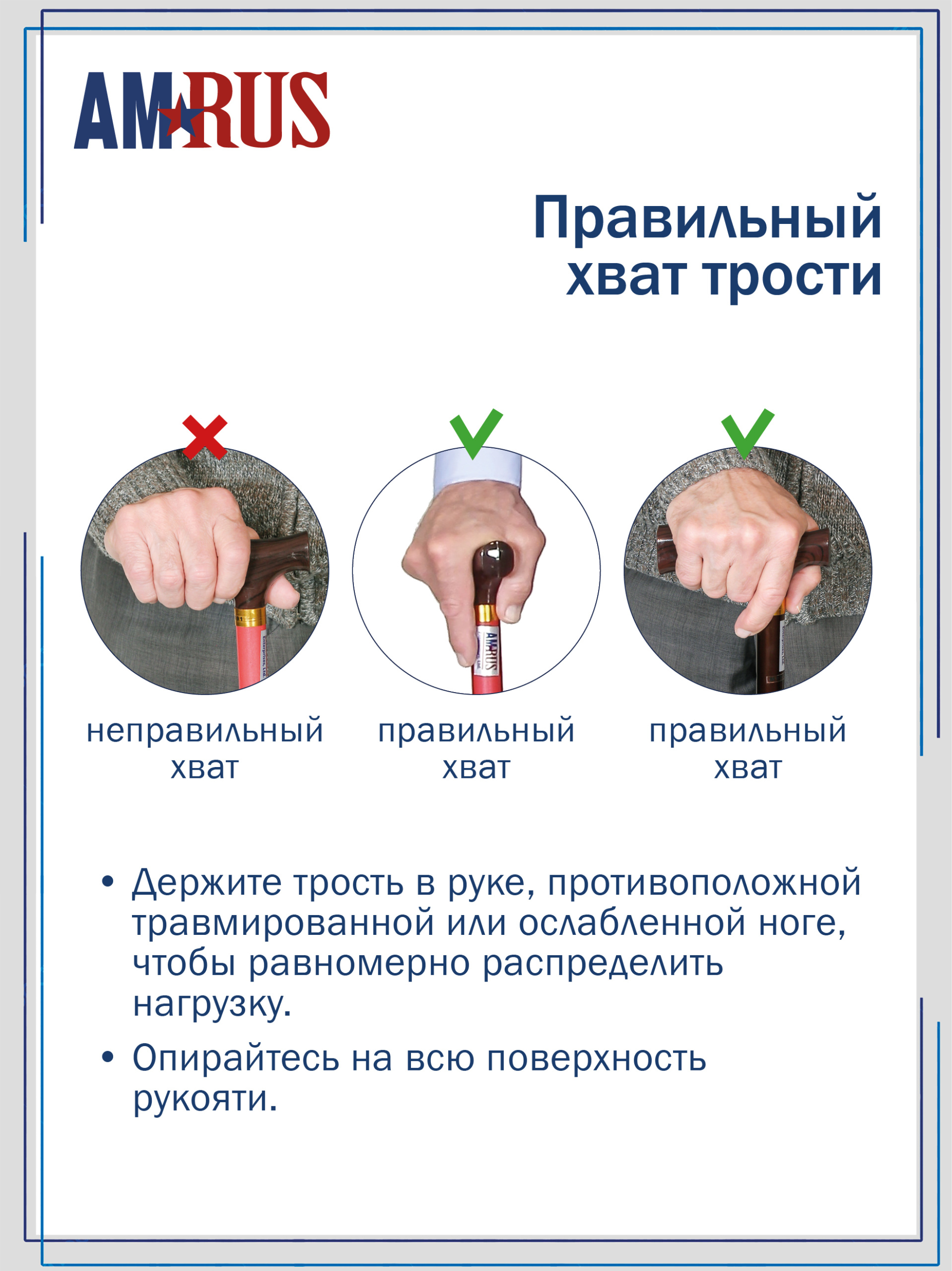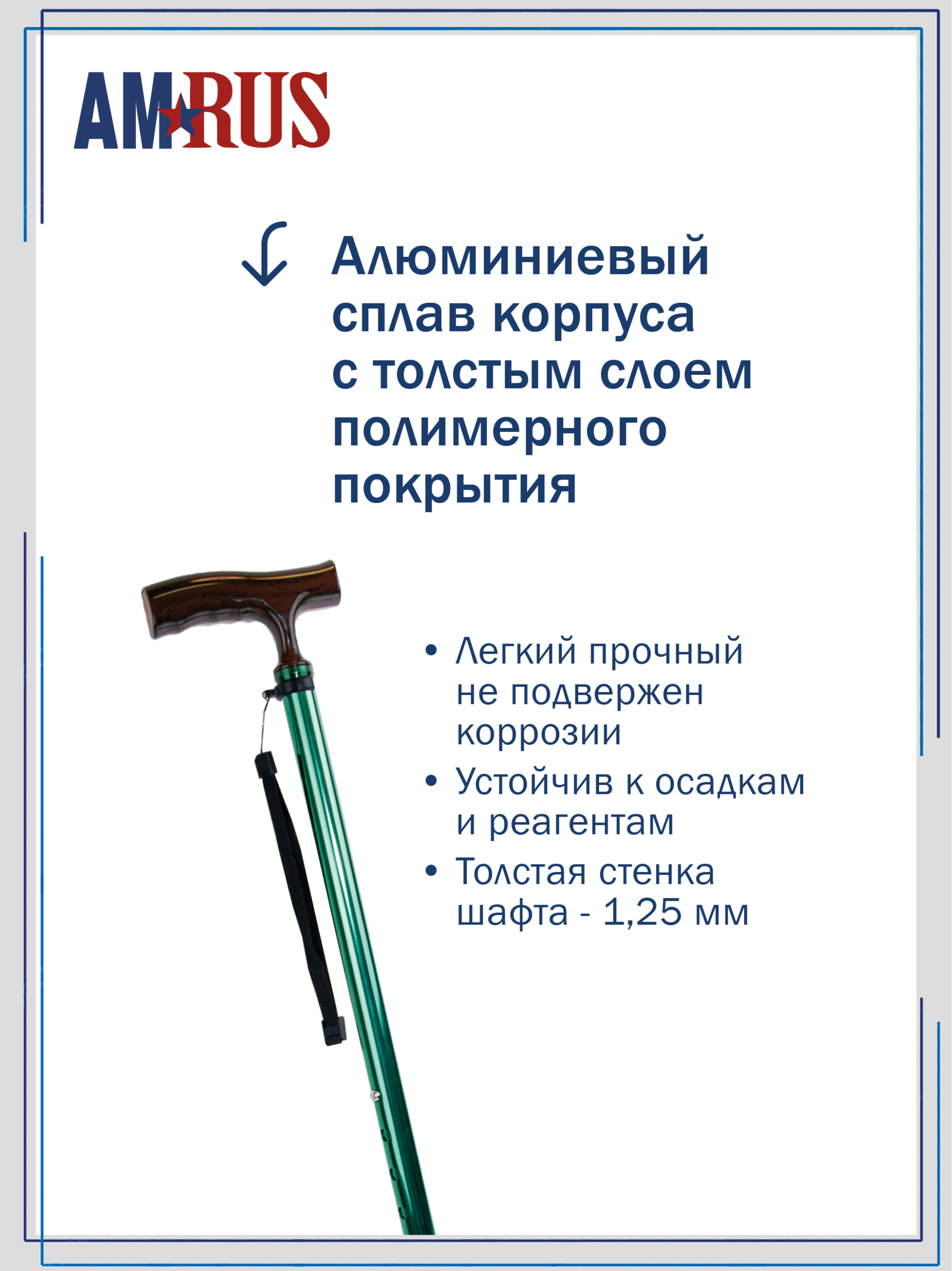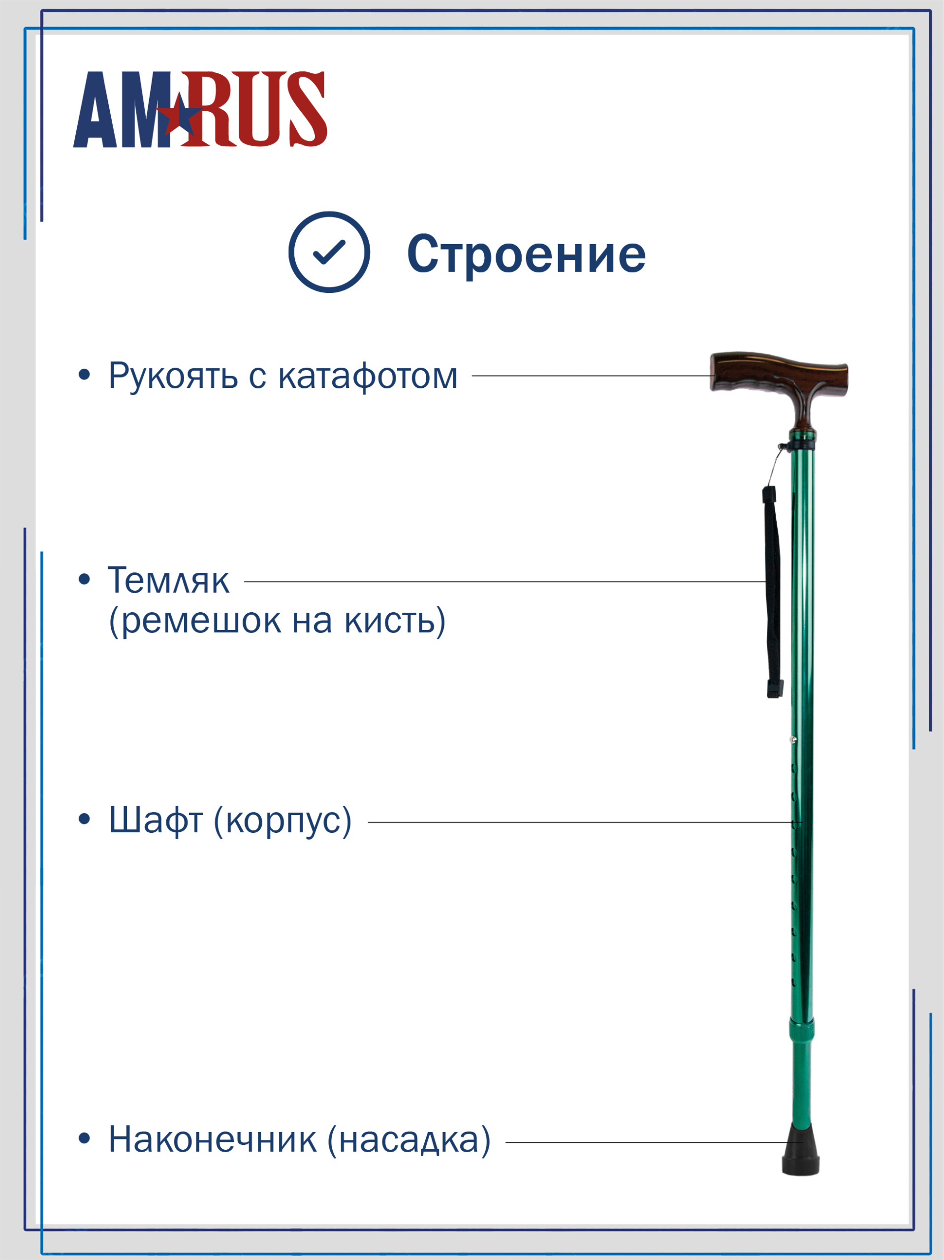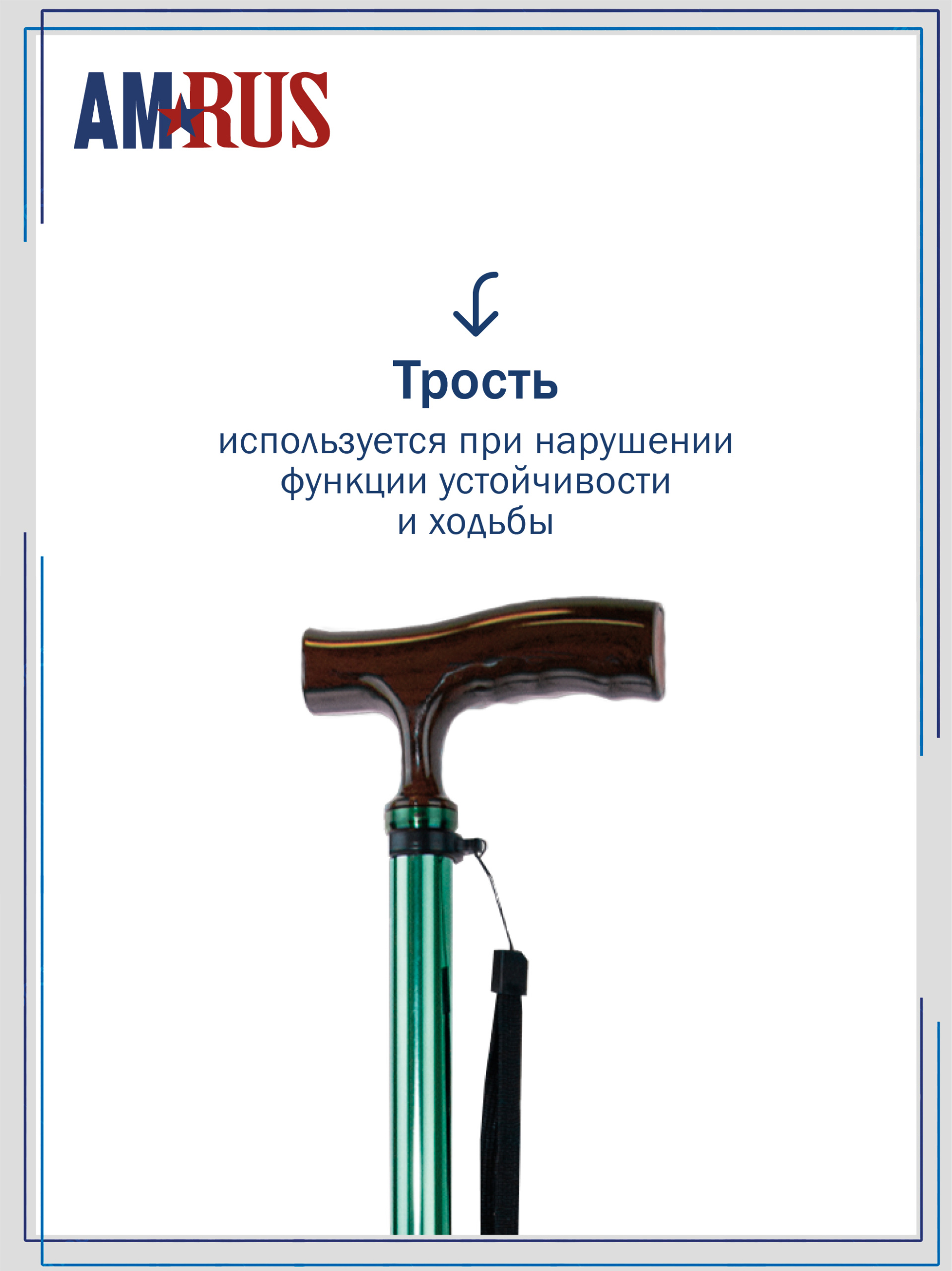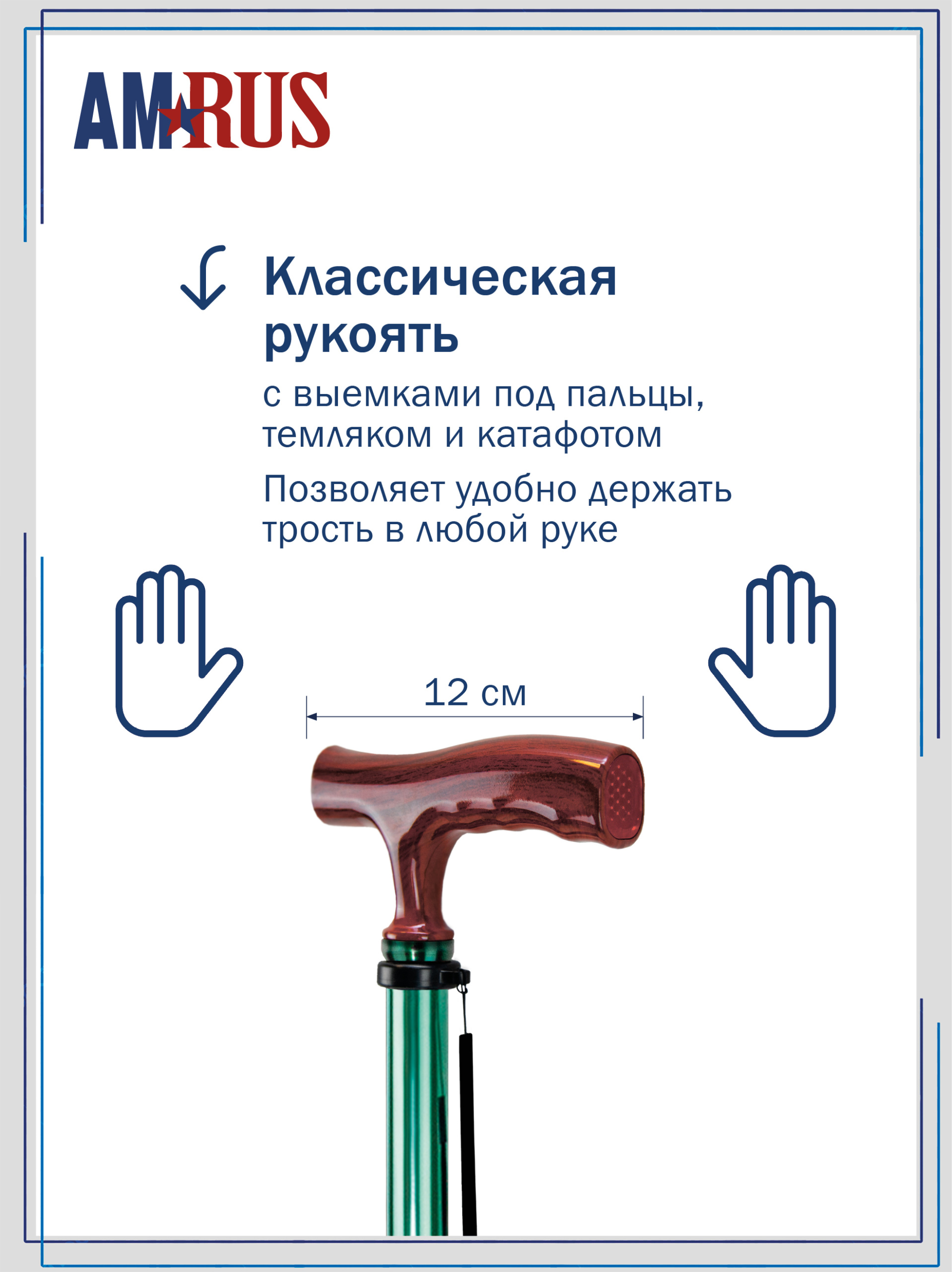 Трость предназначена для облегчения самостоятельного передвижения, обеспечивает дополнительную устойчивость и снижает нагрузку на поврежденную сторону у людей с различными заболеваниями опорно-двигательной системы и различными неврологическими расстройствами. Трость с классической рукоятью с выемками под пальцы из неабсорбирующего материала, не натирает и не скользит в руке. Рукоять снабжена катафотом (светоотражателем). Изящное узкое соединение рукояти с шафтом обеспечивает дополнительный комфорт при удержании рукояти двумя пальцами.   Трость с такой рукоятью используется при нарушении функции устойчивости и ходьбы. На рукояти трости есть темляк (ремешок на кисть). Темляк снабжен пряжкой для регулировки длины под окружность кисти. Съемная насадка из износостойкой резины.