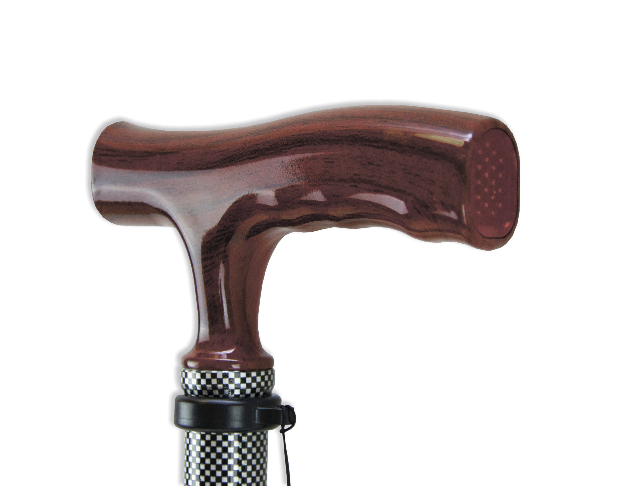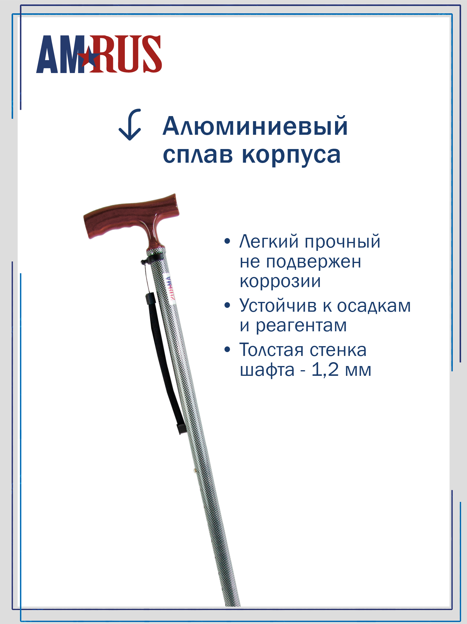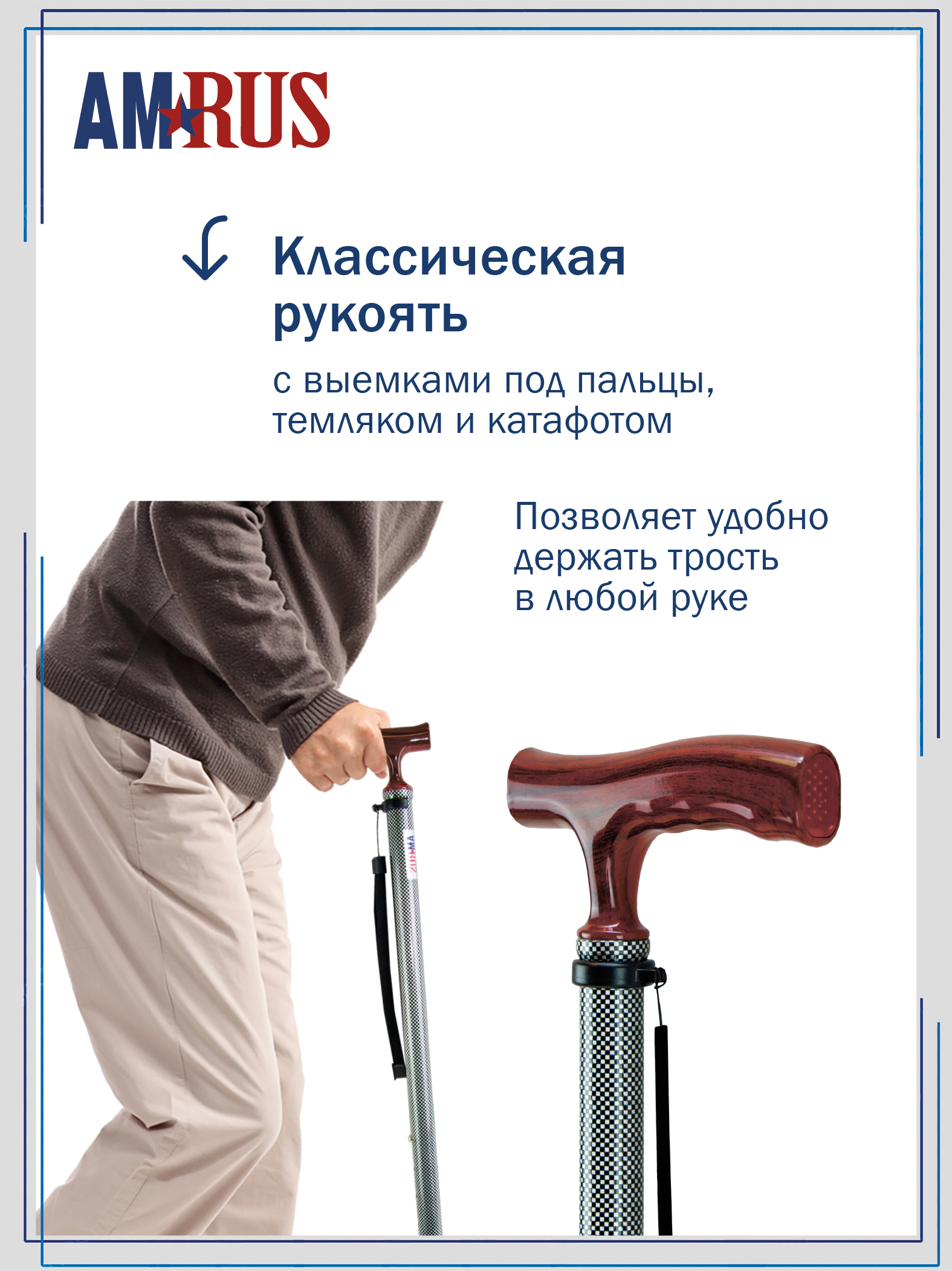 катафотом (светоотражателем). Изящное узкое соединение рукояти с шафтом обеспечивает дополнительный комфорт при удержании рукояти двумя пальцами. Трость с такой рукоятью используется при нарушении функции устойчивости и ходьбы. На рукояти трости есть темляк (ремешок на кисть). Темляк снабжен пряжкой для регулировки длины под окружность кисти. Съемная насадка из износостойкой резины.