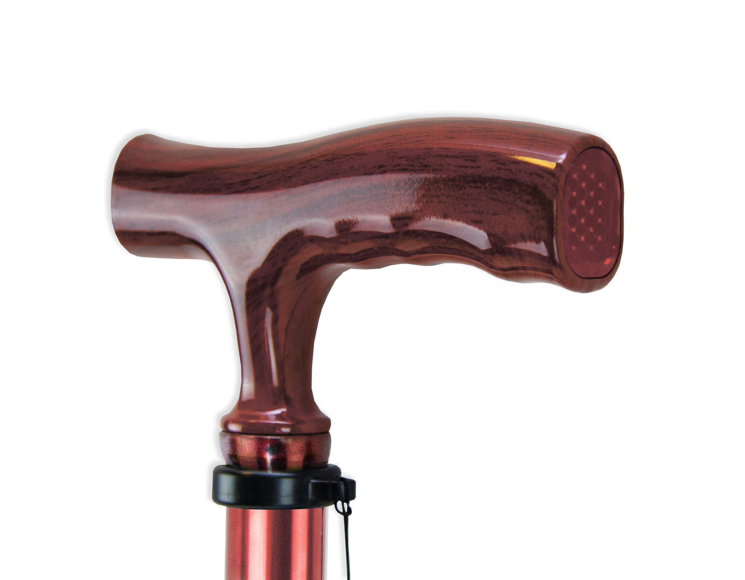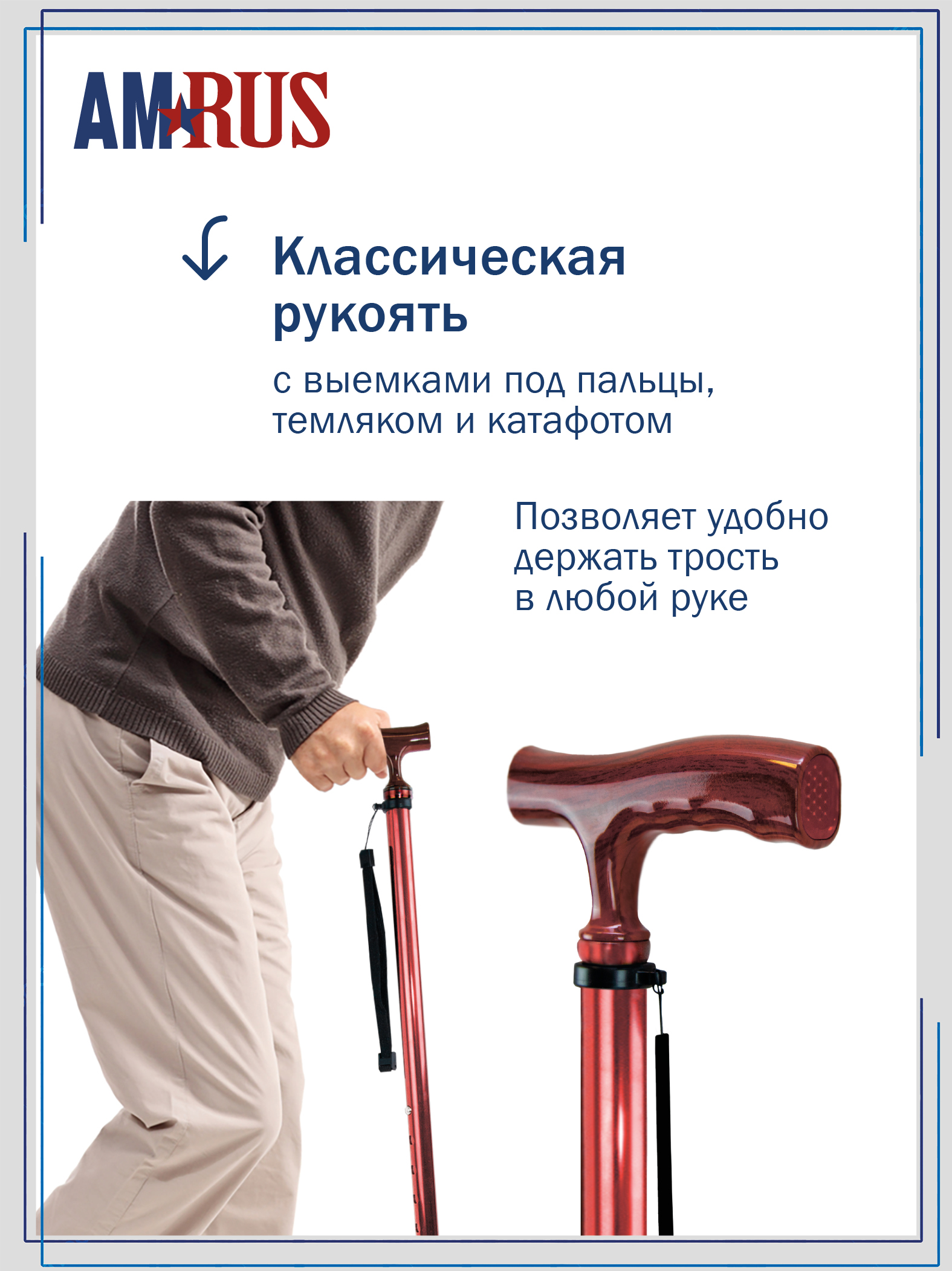 катафотом (светоотражателем). Изящное узкое соединение рукояти с шафтом обеспечивает дополнительный комфорт при удержании рукояти двумя пальцами. Трость с такой рукоятью используется при нарушении функции устойчивости и ходьбы. На рукояти трости есть темляк (ремешок на кисть). Темляк снабжен пряжкой для регулировки длины под окружность кисти. Съемная насадка из износостойкой резины.