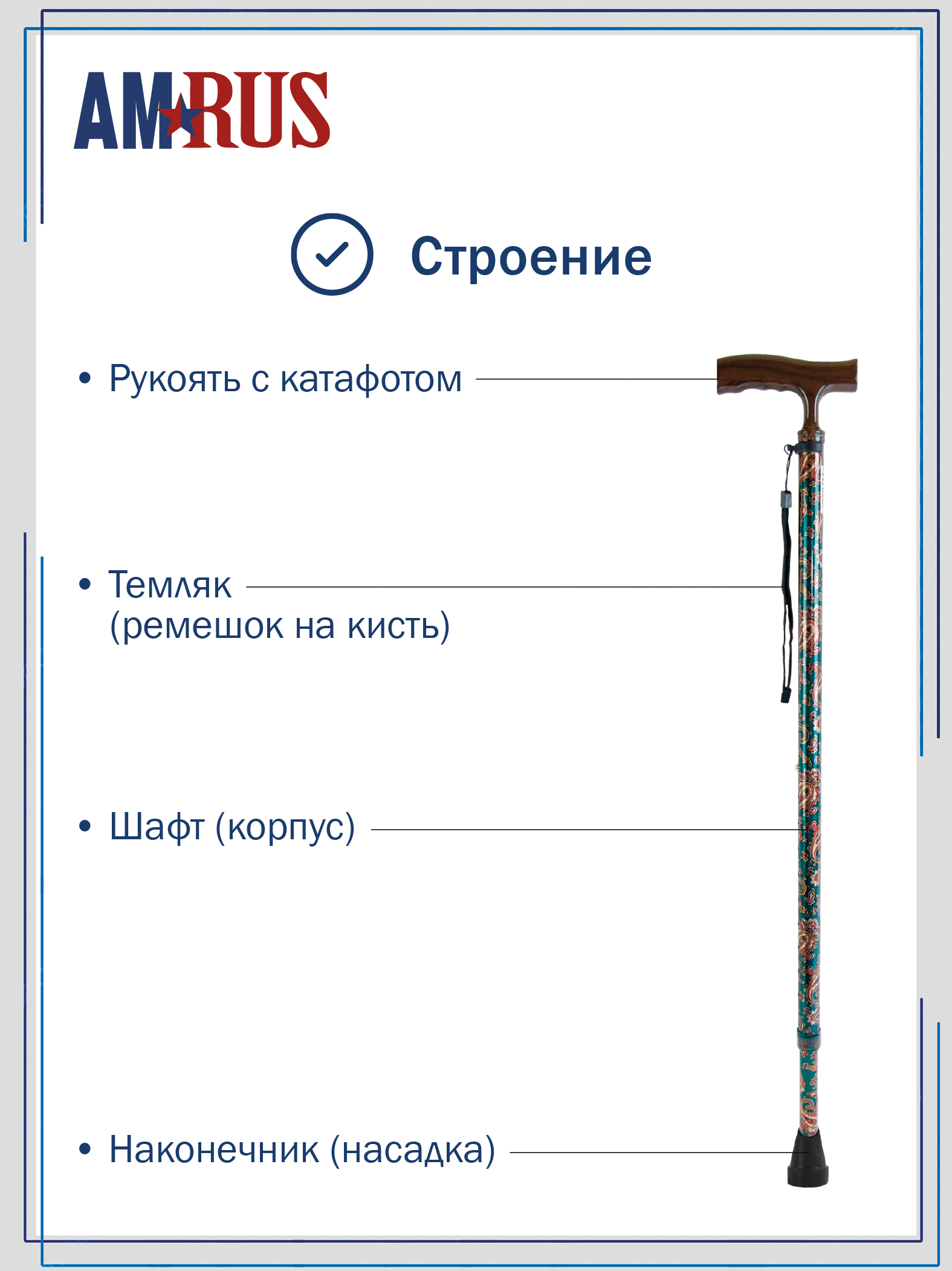 катафотом (светоотражателем). Изящное узкое соединение рукояти с шафтом обеспечивает дополнительный комфорт при удержании рукояти двумя пальцами. Трость с такой рукоятью используется при нарушении функции устойчивости и ходьбы. На рукояти трости есть темляк (ремешок на кисть). Темляк снабжен пряжкой для регулировки длины под окружность кисти. Съемная насадка из износостойкой резины.